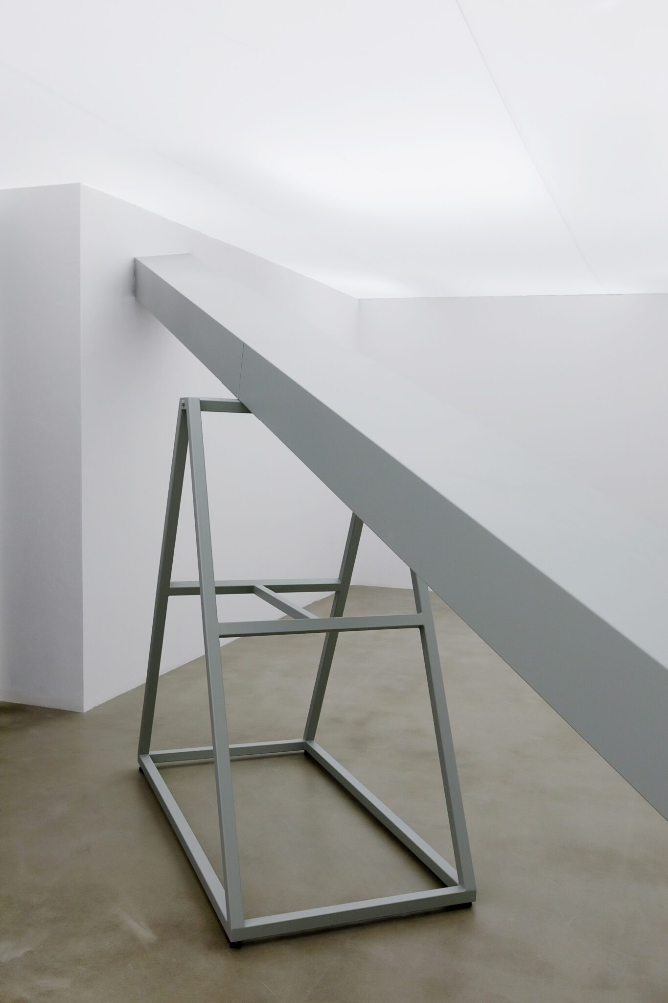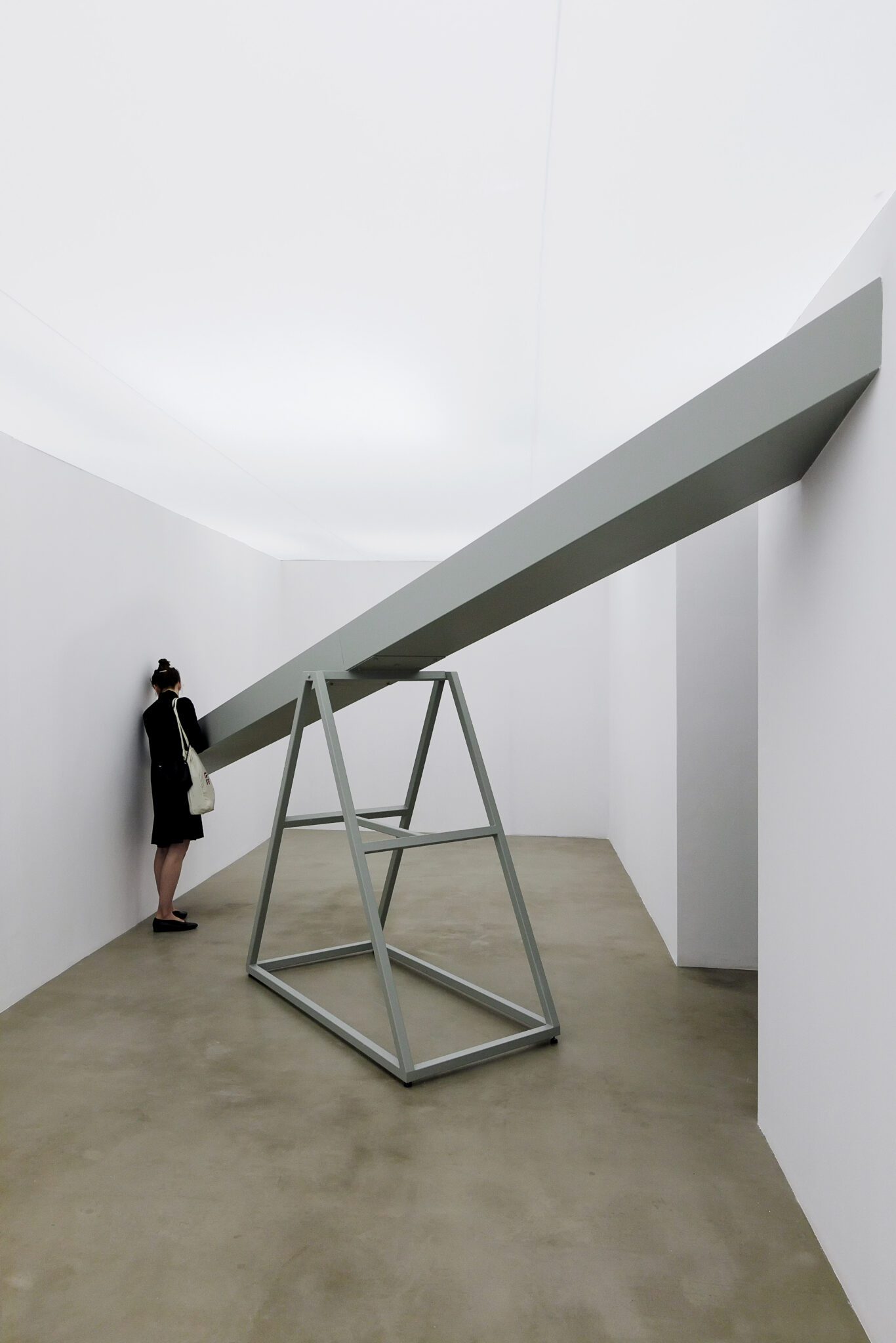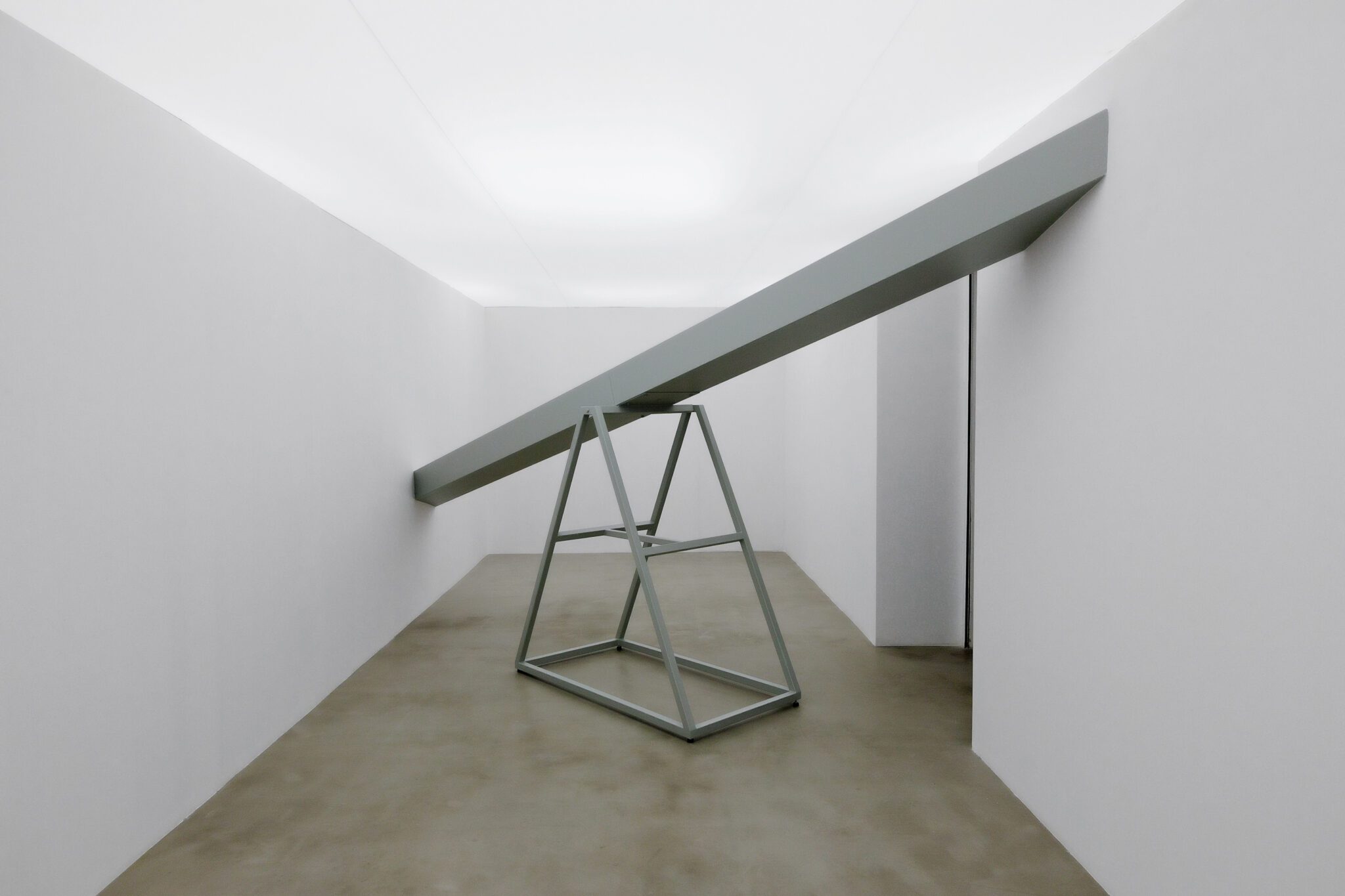 Seeking tranquility, you situate your body in a well-crafted white laboratory space. Purged of meanings, constantly neutral. Light softly fills the interior, concealing its own source. Devoid of meanings, you change your position. What awaits you at the threshold is an object, a point of departure to building a space – created for the object to resonate in its interior. The relation between object and space reflects that which Sigfried Giedion described when he wrote: “architecture approaches sculpture, and sculpture approaches architecture”. This statement is also an apt characterisation of Teresa Otulak’s thought process. You change your position in no time; when one end goes up, the other falls down at the same time. That’s how the Seesaw mechanism works, formed of a beam and a support. In order to find balance, you need to absorb its working principle. That’s when an obstacle transforms into pleasure.
