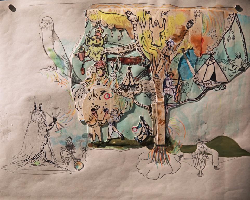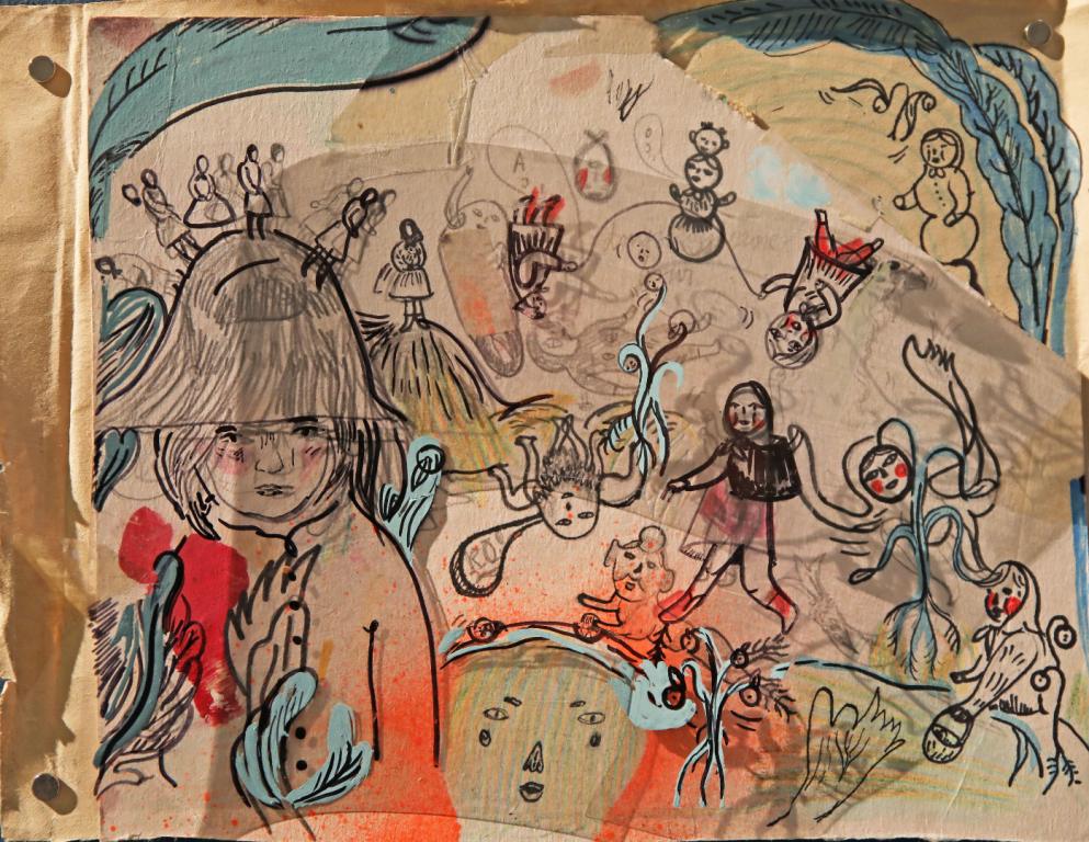 The images overlap, a sheet of colour paper with a drawing pasted on a scrap of a white sheet with a drawing covered by transparent foil with yet another layer of the illustration. Colour patches, black lines and contours multiply, cross and merge producing the feeling of pleasant stupefaction…, or perhaps even hallucination.