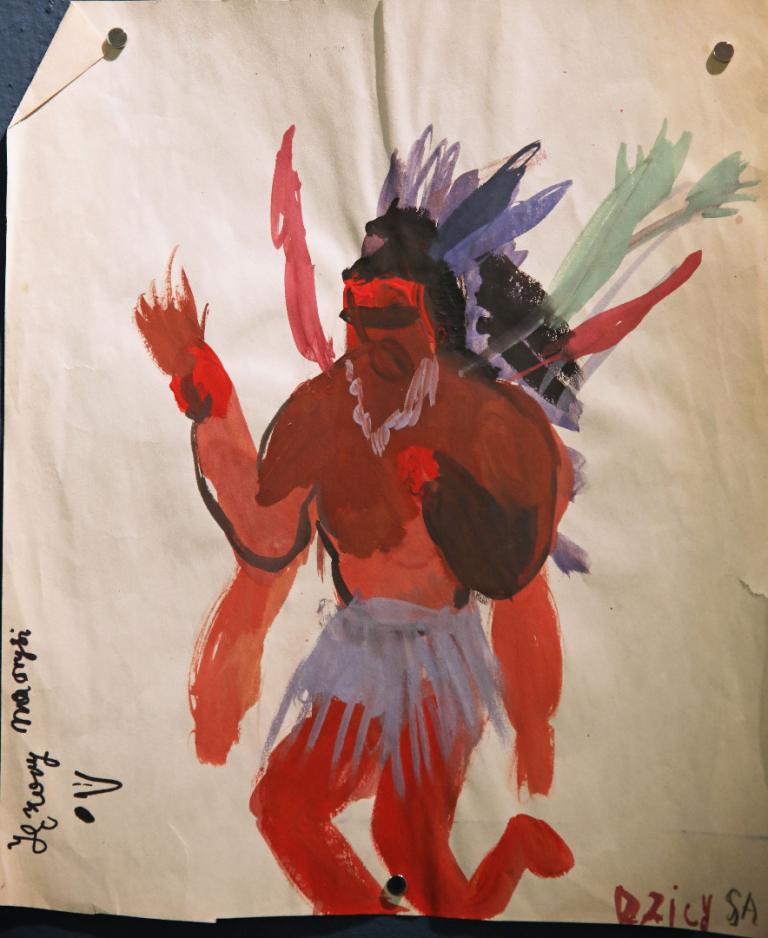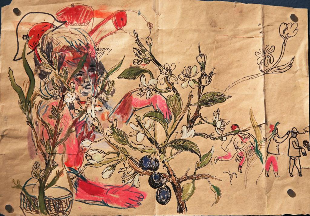 Johnny, the main character of Na jagody looked different in every drawing. It is not easy to draw Johnny, you need to try. The book illustrations often feature people flying, suspended in mid-air, they do not touch the ground and appear to levitate. Or perhaps they are simply meditating? Vegetation is lush, running wild and strongly embedded in the drawing frames. The trees and flowers always have roots and seem to suck out all their vital juices from the paper; they often do not fit within the sheets and go beyond their edges, beyond the drawn firmament.