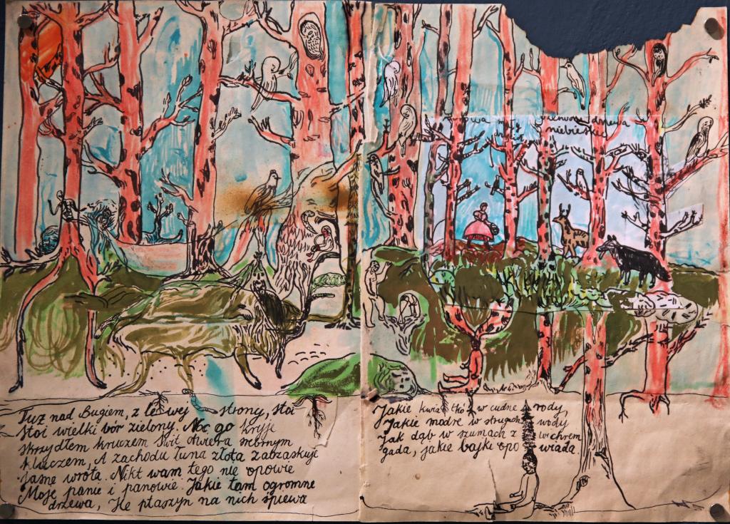 A mysterious land, full of bounty, colours, joy and charm, which cannot be easily accessed by people, was discovered by little Johnny and is governed by its own 'forest’ laws. The boy’s disinterestedness and noble-mindedness is rewarded by nature and the inhabitants of the 'forest fairy-tale’. The landscape abounds in mystery and magic… – it is not a description of the primeval forest of Białowieża, but a synopsis of Maria Konopnicka’s book Na jagody (Picking Berries) written in 1913, which provided the pretext to organise the exhibition of drawings by Emilka Bartkowska.