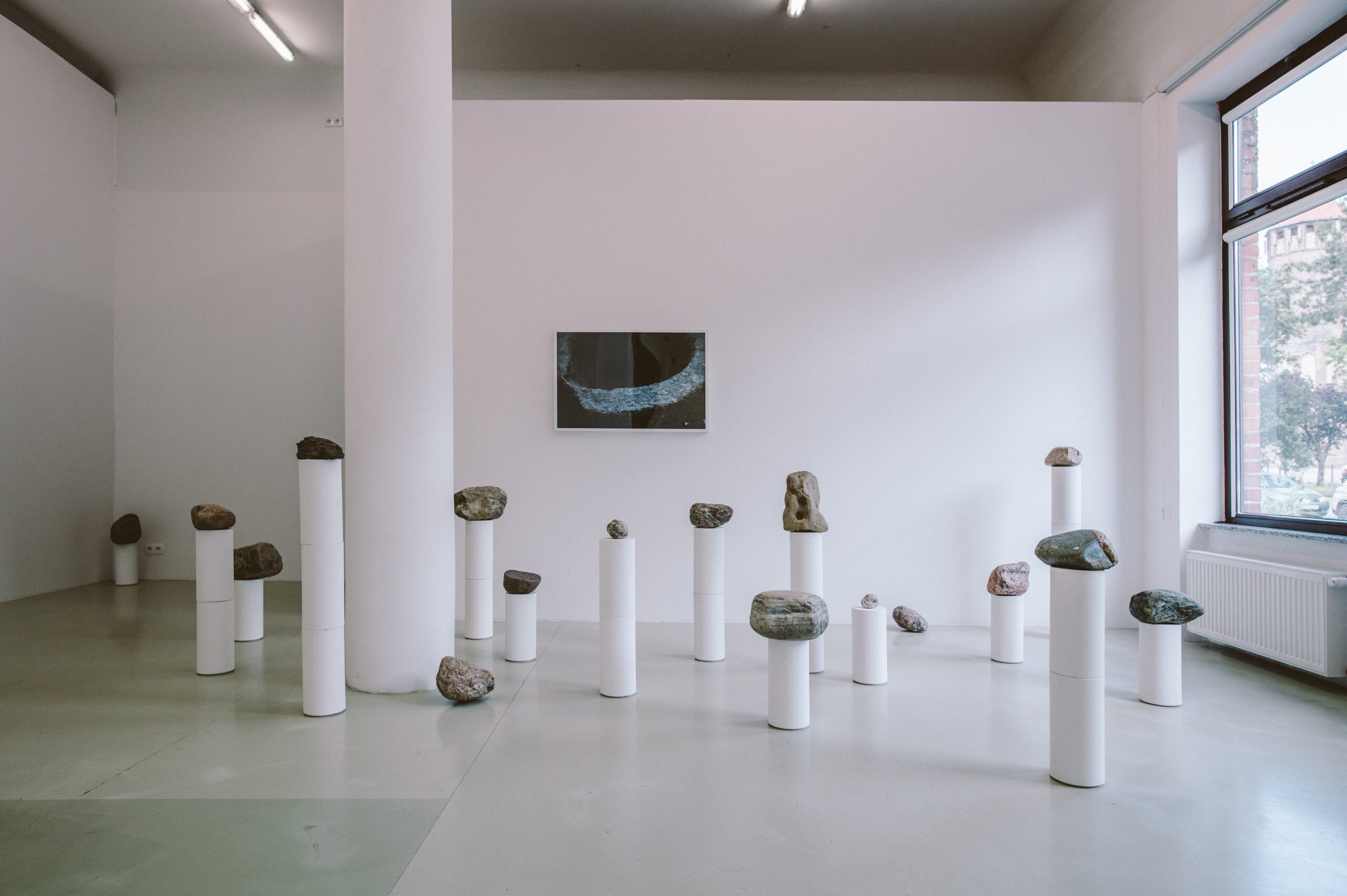 The Gdansk exhibition, which is a continuation of the creative process initiated upon the first edition of the Sculpture of the Terrain project in Sweden in 2019, focuses on the poetry of the local walls, structures, and foundations, on a turn towards locality and the assumed familiarity built on what the artist refers to as “ours-not-entirely-ours”. As a part of the creative process, the artist takes a close look at the structure of the castles in Bytów and Sztum, defensive walls in Skarszewy and Starogard, Granary Island in Gdansk, early ritual objects (such as the stone circles at Węsiory and Odry and the so-called stone baba standing by the Archaeological Museum in Gdansk), as well as tombstones and Gdansk pavements worn down by their daily users. Taken during the fieldwork, the photographs of architecture, ritual objects, sill plates, and archaeological test-pits are an integral part of the exhibition, along with its main protagonists – specimens of postglacial granites that the artist collected and transported for the purposes of the gallery exhibition.