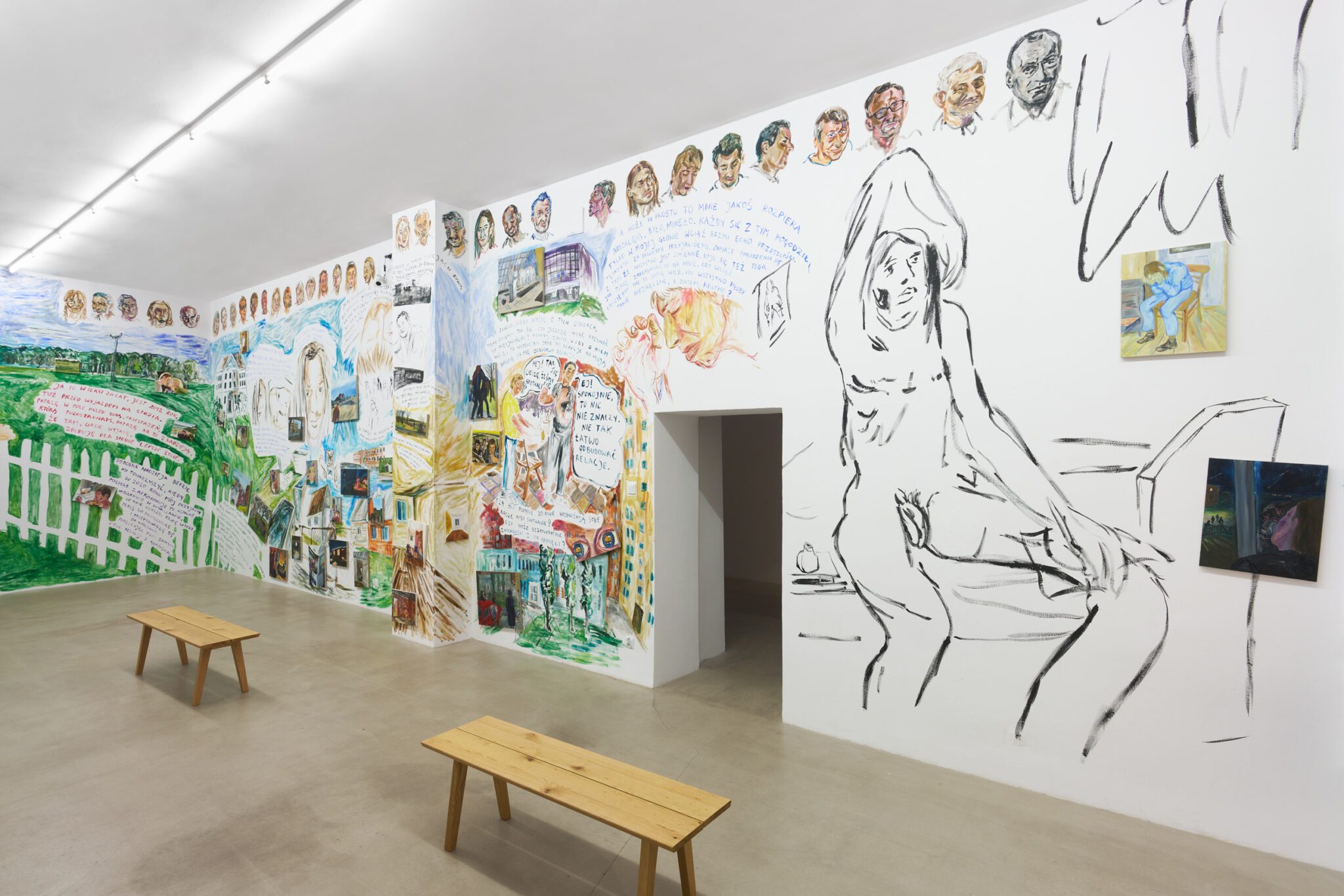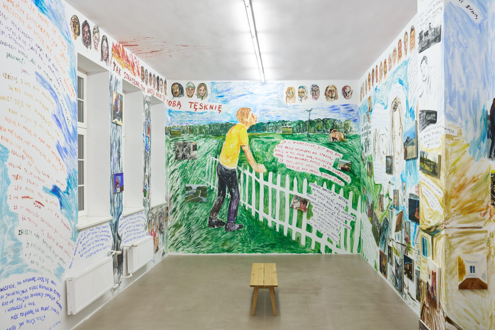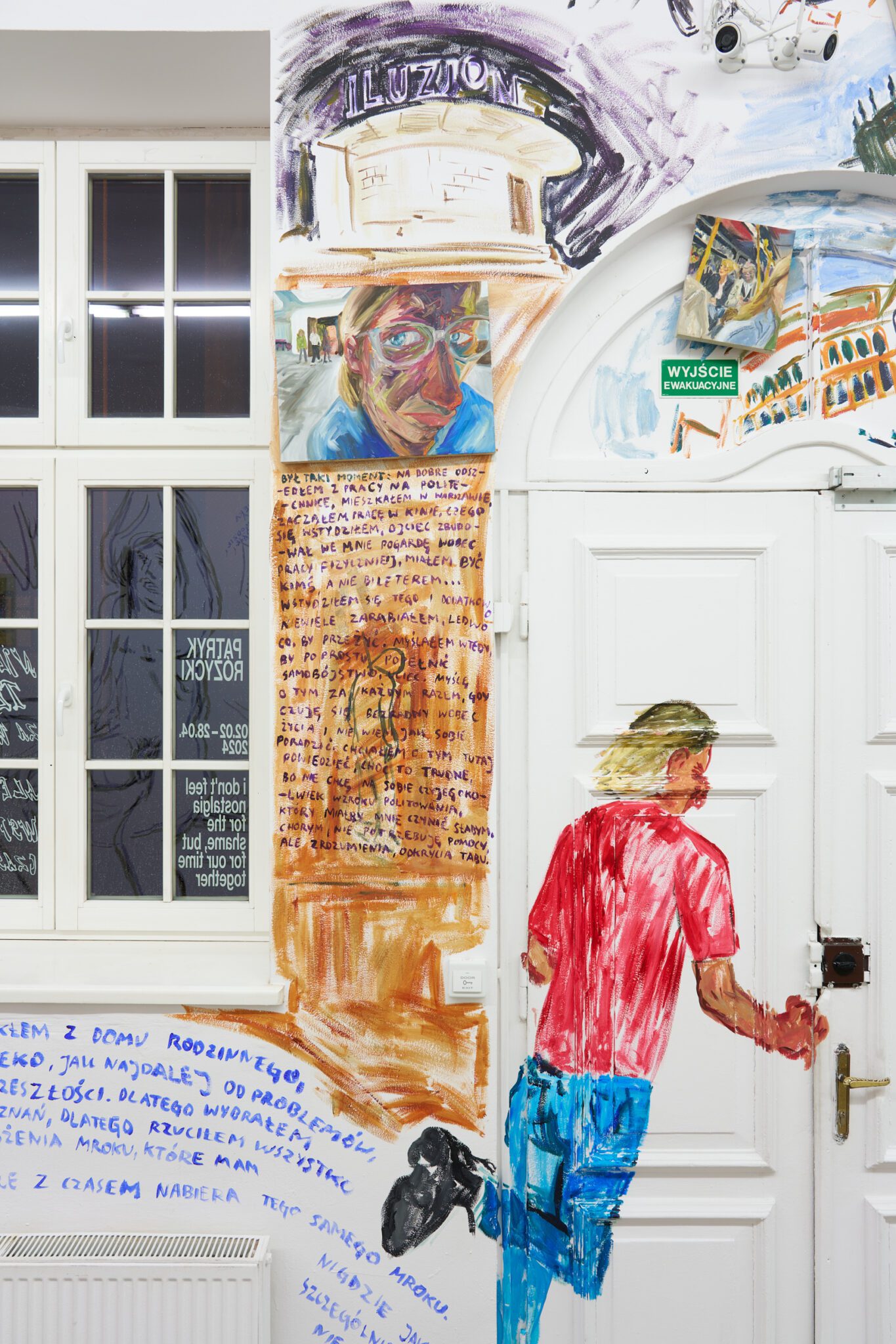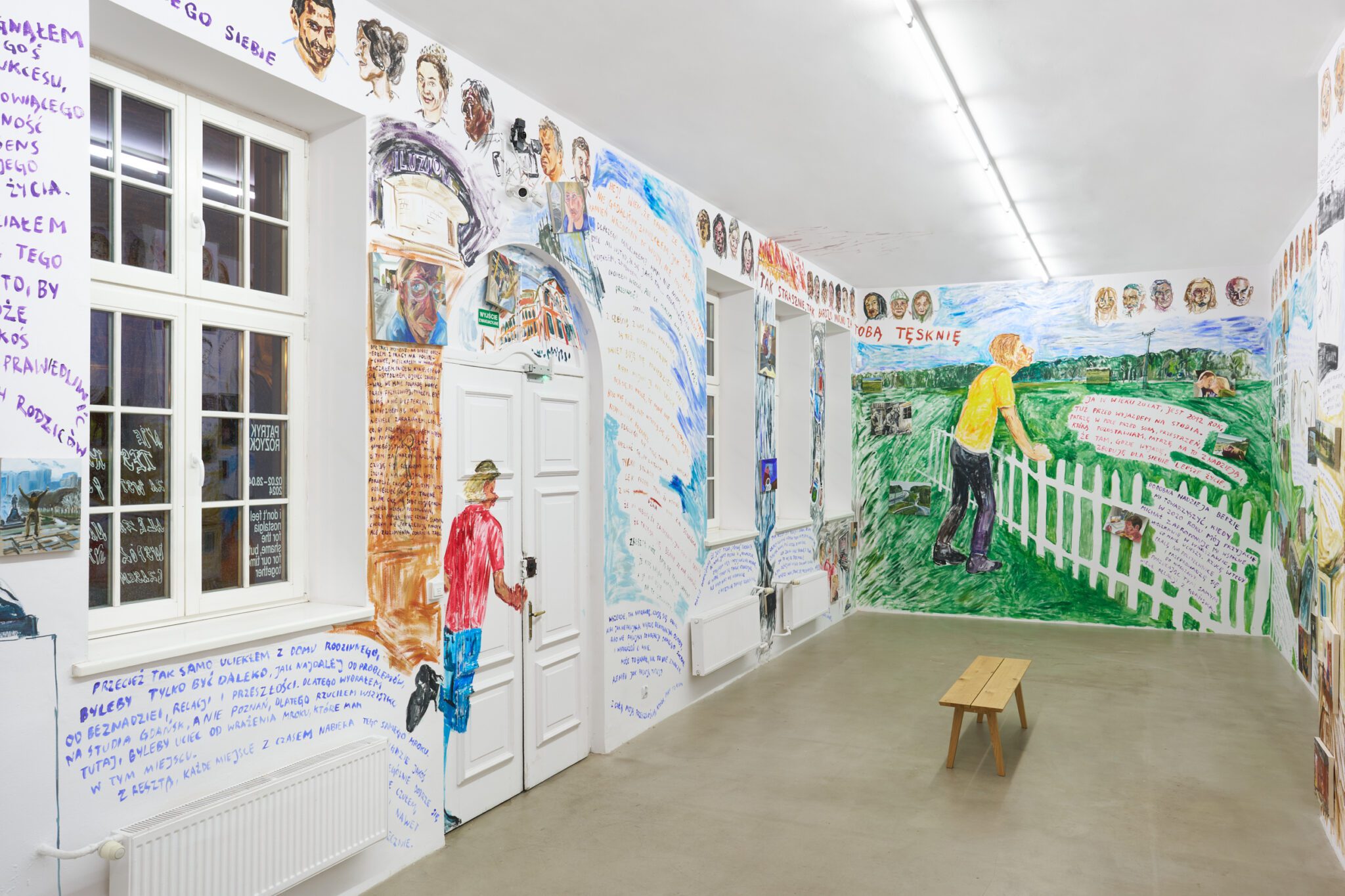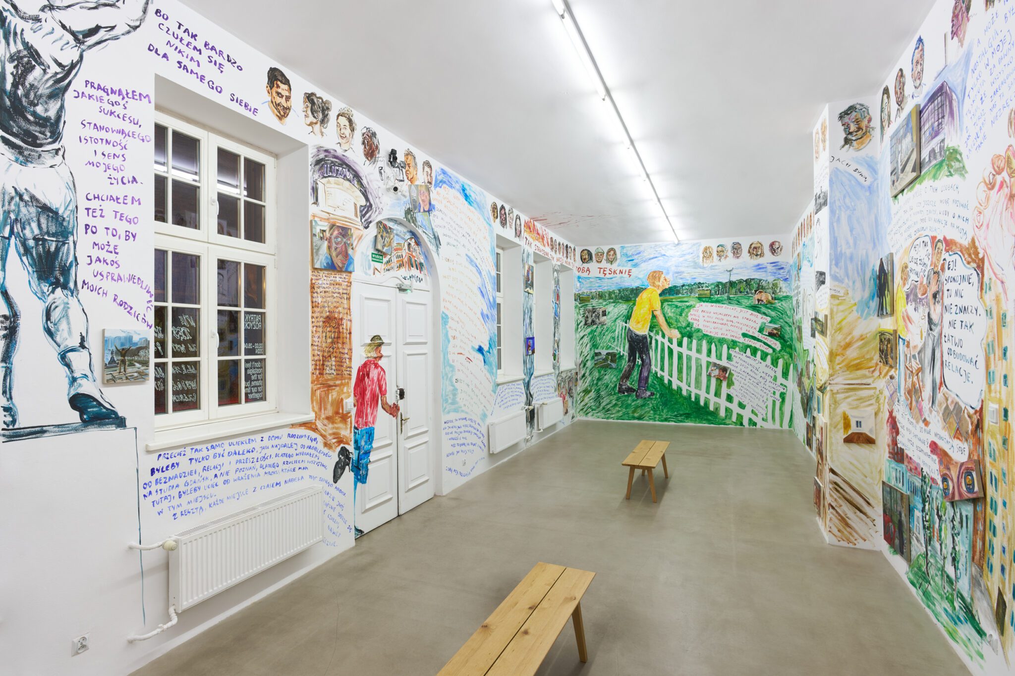 While Patryk is known for the confessional nature of his subject matter – painted images of personally experienced or witnessed moments of pain, awkwardness, vulnerability, intimacy, devotion, death – for this exhibition he takes a new formal approach. His memories are painted alongside dreams; real-life shame woven with fantasy, waking moments and scenes from films appearing on canvases slightly smaller than he conventionally paints. These elements introduce a relation to photography, and overlap large-scale mural-style paintings that cover the walls and extend to the ceiling of the gallery. In contrast to Patryk’s typical approach, this more immersive, installation-based format follows a lineage more closely associated with Mexican muralism and the early-mid 20th c. North American revitalization of fresco painting, both developed as didactic political tools for making art a part of public life, for promoting social values (popular or otherwise) and national history to the masses. A less secular reference but perhaps more regionally-relevant is the biblia pauperum – in both book and fresco format – which again play the role of narrator for a class of people that are typically not collectors or connoisseurs of art, who largely will not go to museums in search of culture but will instead experience and produce it in a more prosaic way. These points of reference have become important for Patryk as he shifts his focus from painting discrete moments to this more contemplative, holistic experience, both as a way of inviting viewers into his world and creating more space for the observer to find themselves within these walls. His ultimate desire is not to alienate or objectify anyone – subject or viewer – and perhaps most importantly, to not turn the figures in his paintings into characters but to proudly carry them with him.