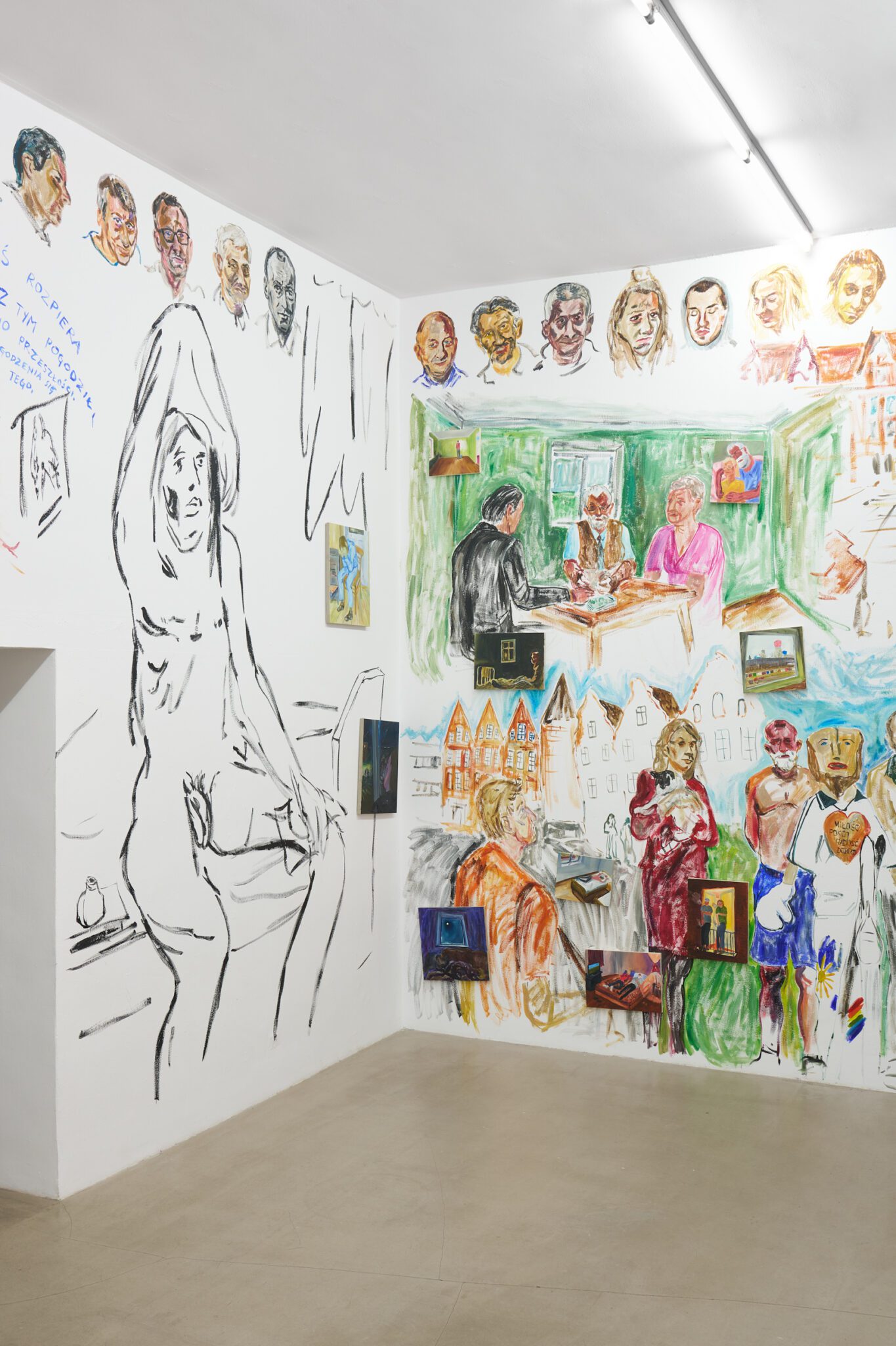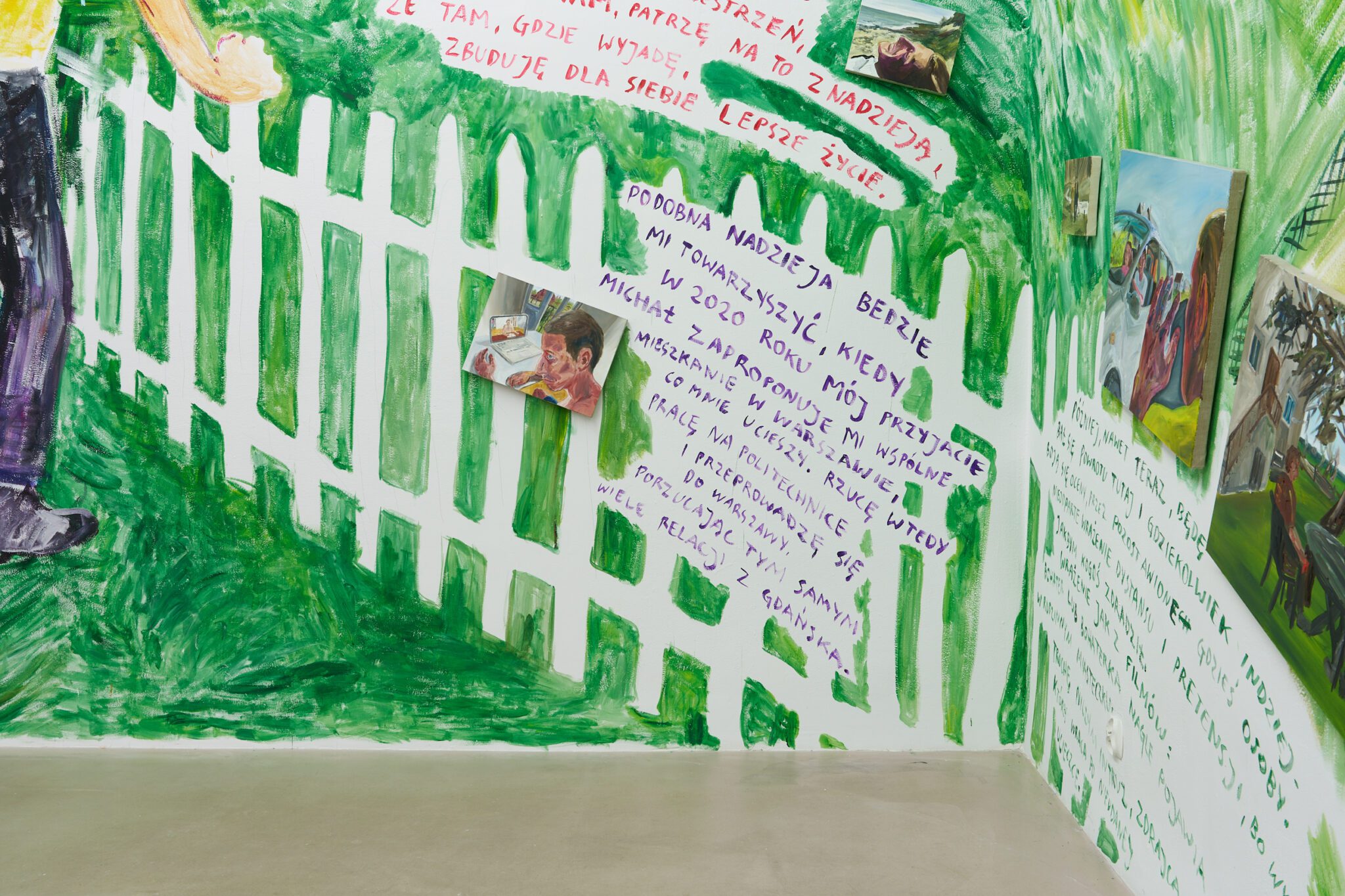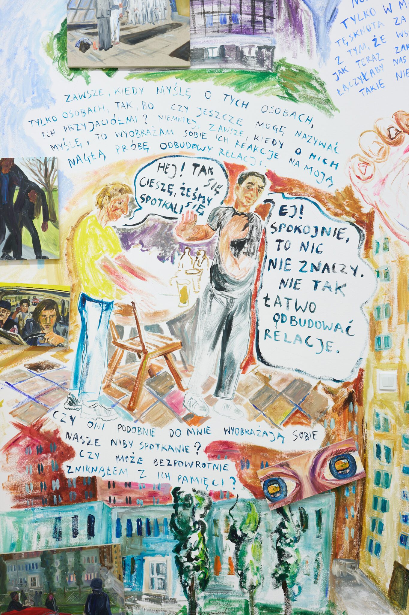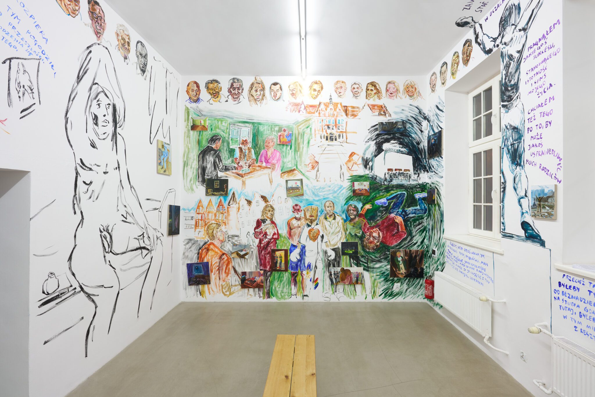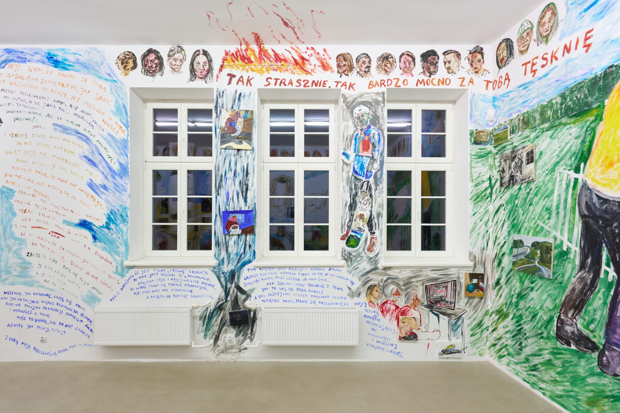 While Patryk is known for the confessional nature of his subject matter – painted images of personally experienced or witnessed moments of pain, awkwardness, vulnerability, intimacy, devotion, death – for this exhibition he takes a new formal approach. His memories are painted alongside dreams; real-life shame woven with fantasy, waking moments and scenes from films appearing on canvases slightly smaller than he conventionally paints. These elements introduce a relation to photography, and overlap large-scale mural-style paintings that cover the walls and extend to the ceiling of the gallery. In contrast to Patryk’s typical approach, this more immersive, installation-based format follows a lineage more closely associated with Mexican muralism and the early-mid 20th c. North American revitalization of fresco painting, both developed as didactic political tools for making art a part of public life, for promoting social values (popular or otherwise) and national history to the masses. A less secular reference but perhaps more regionally-relevant is the biblia pauperum – in both book and fresco format – which again play the role of narrator for a class of people that are typically not collectors or connoisseurs of art, who largely will not go to museums in search of culture but will instead experience and produce it in a more prosaic way. These points of reference have become important for Patryk as he shifts his focus from painting discrete moments to this more contemplative, holistic experience, both as a way of inviting viewers into his world and creating more space for the observer to find themselves within these walls. His ultimate desire is not to alienate or objectify anyone – subject or viewer – and perhaps most importantly, to not turn the figures in his paintings into characters but to proudly carry them with him.