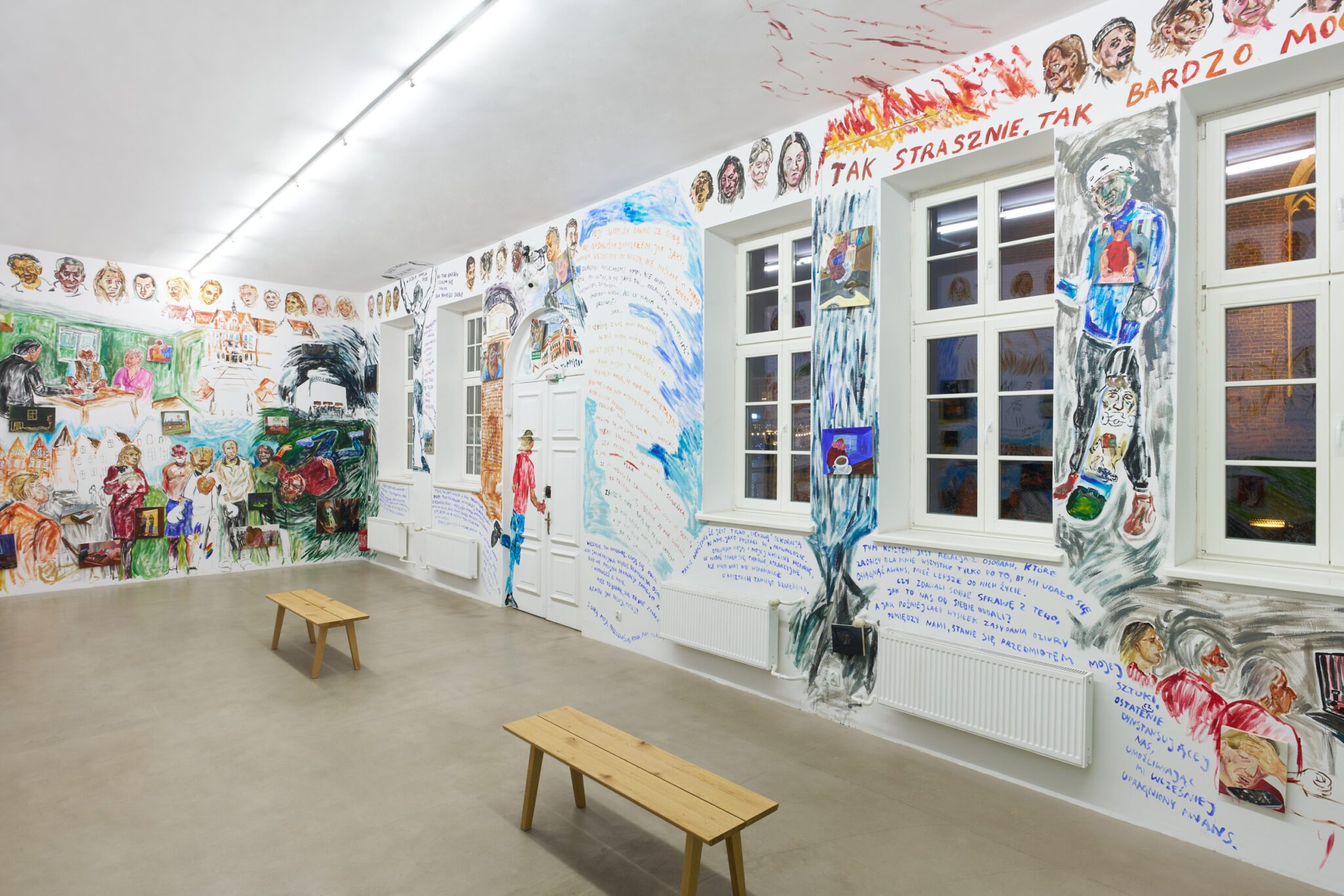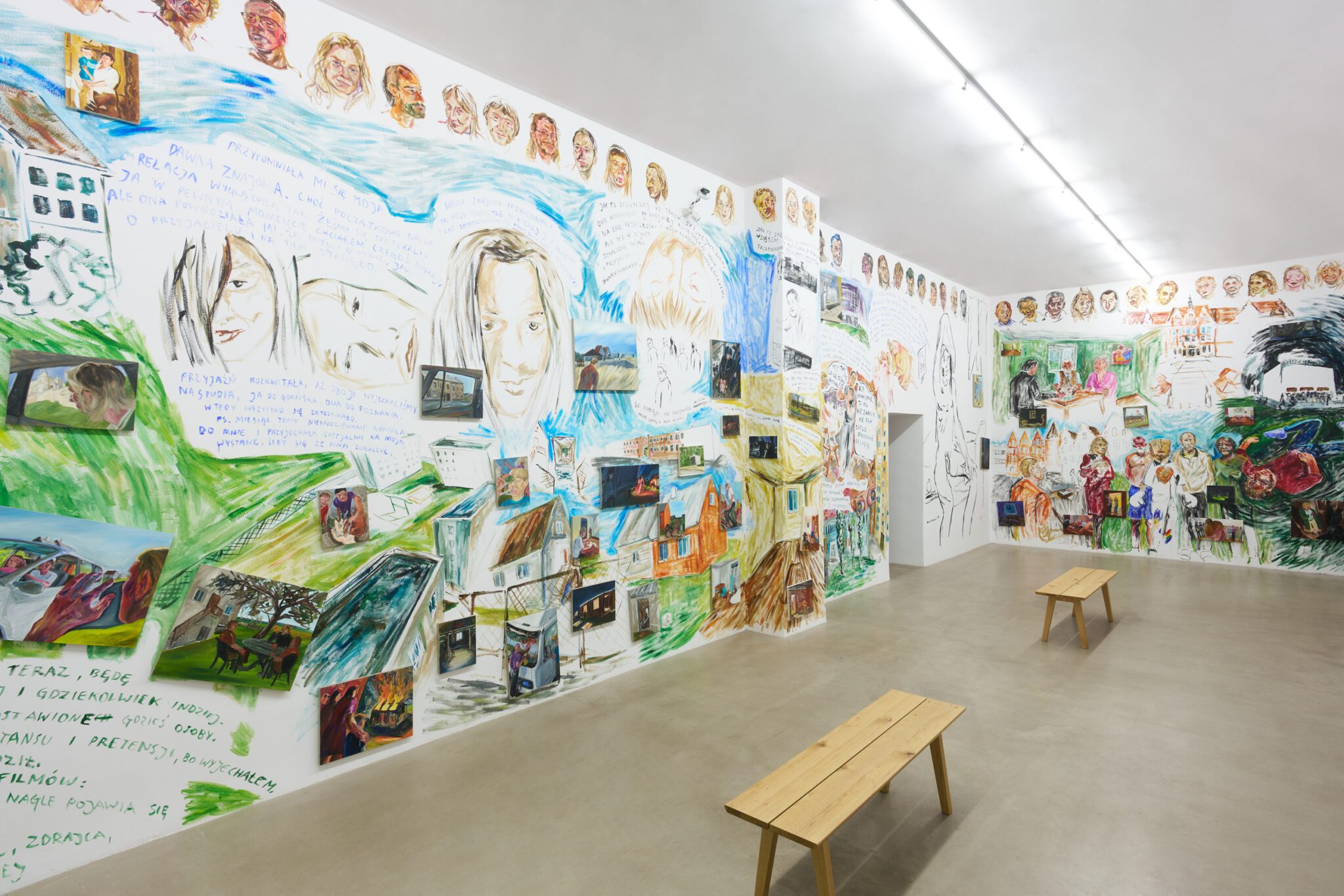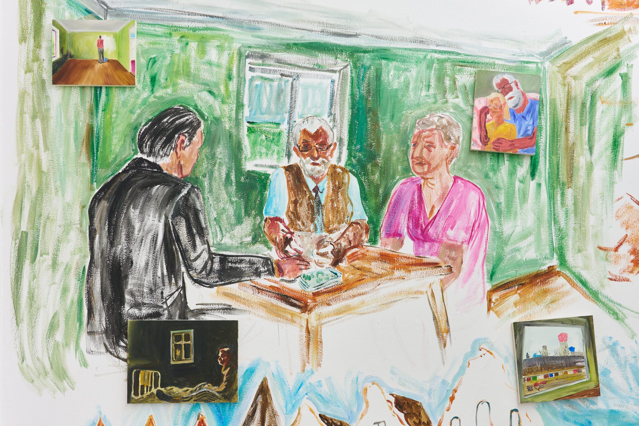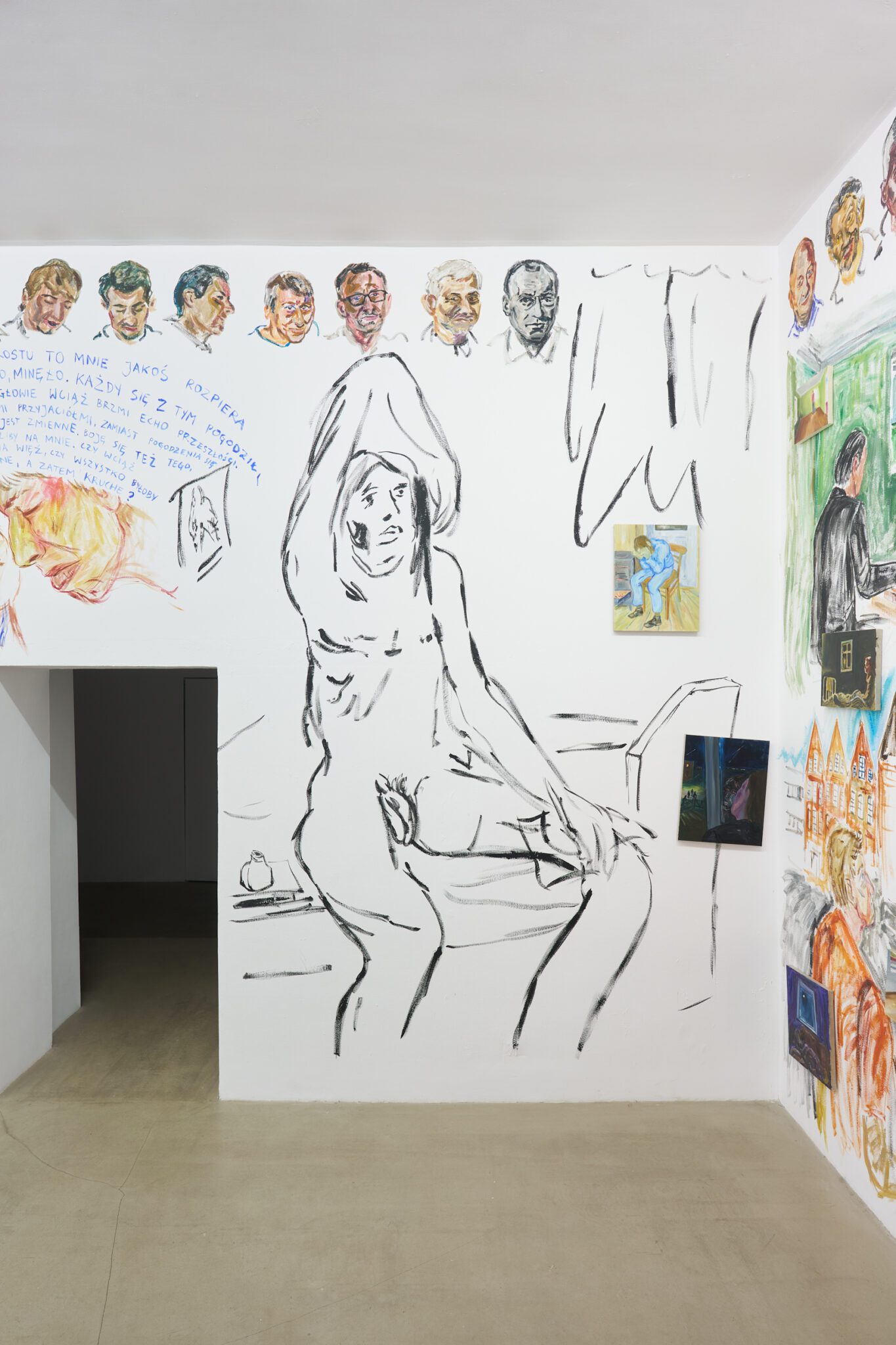 While Patryk is known for the confessional nature of his subject matter – painted images of personally experienced or witnessed moments of pain, awkwardness, vulnerability, intimacy, devotion, death – for this exhibition he takes a new formal approach. His memories are painted alongside dreams; real-life shame woven with fantasy, waking moments and scenes from films appearing on canvases slightly smaller than he conventionally paints. These elements introduce a relation to photography, and overlap large-scale mural-style paintings that cover the walls and extend to the ceiling of the gallery. In contrast to Patryk’s typical approach, this more immersive, installation-based format follows a lineage more closely associated with Mexican muralism and the early-mid 20th c. North American revitalization of fresco painting, both developed as didactic political tools for making art a part of public life, for promoting social values (popular or otherwise) and national history to the masses. A less secular reference but perhaps more regionally-relevant is the biblia pauperum – in both book and fresco format – which again play the role of narrator for a class of people that are typically not collectors or connoisseurs of art, who largely will not go to museums in search of culture but will instead experience and produce it in a more prosaic way. These points of reference have become important for Patryk as he shifts his focus from painting discrete moments to this more contemplative, holistic experience, both as a way of inviting viewers into his world and creating more space for the observer to find themselves within these walls. His ultimate desire is not to alienate or objectify anyone – subject or viewer – and perhaps most importantly, to not turn the figures in his paintings into characters but to proudly carry them with him.