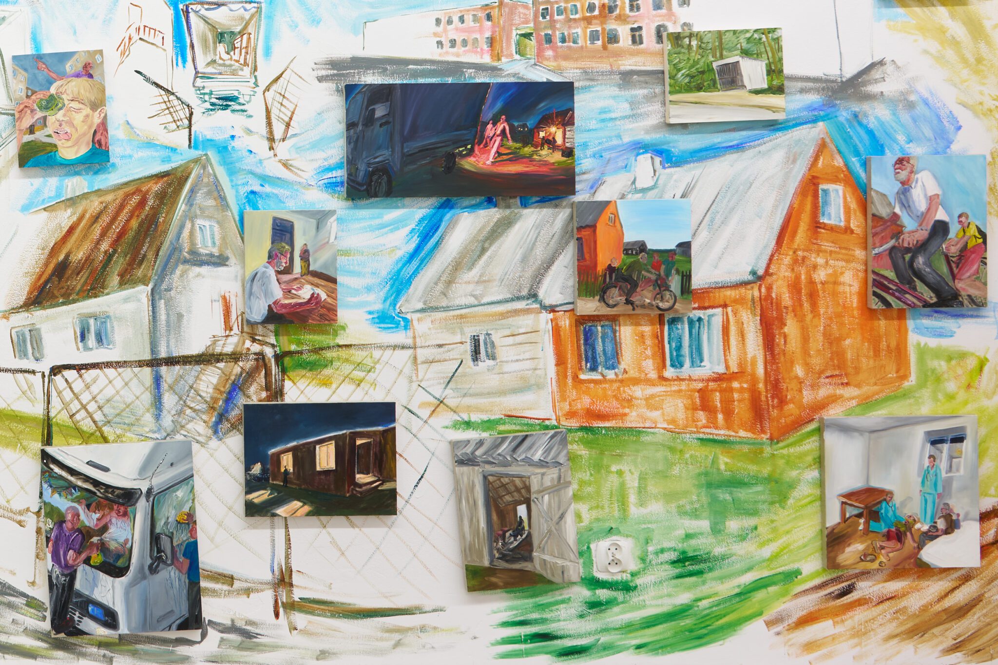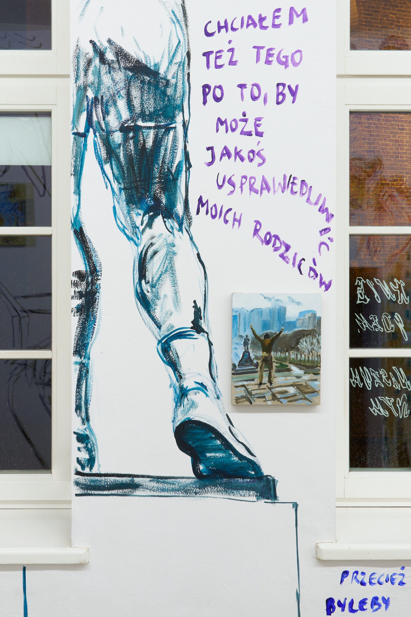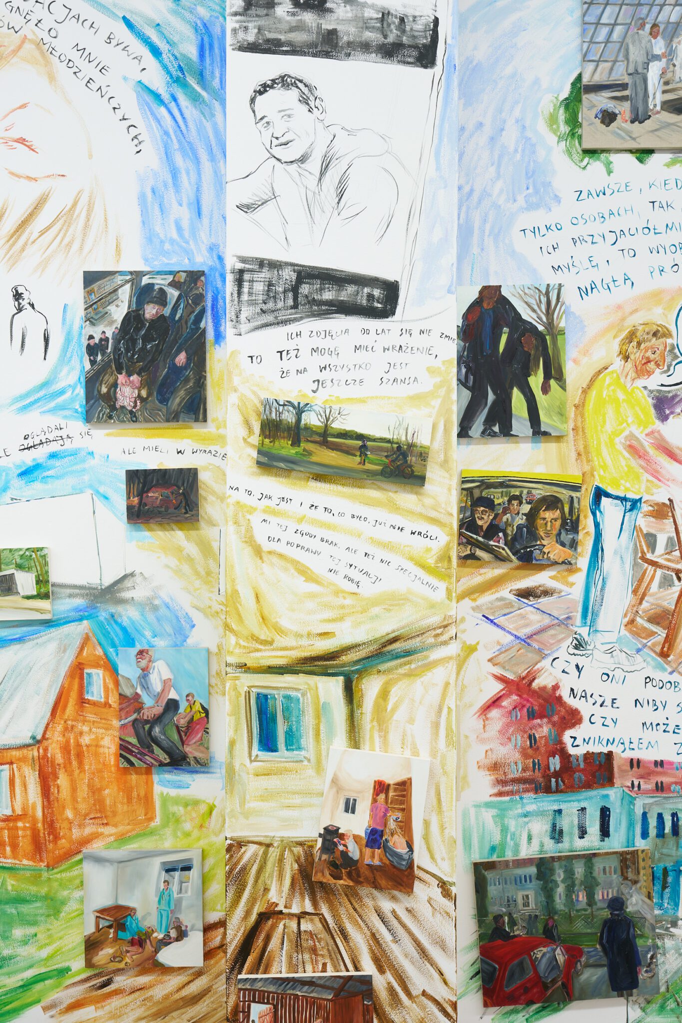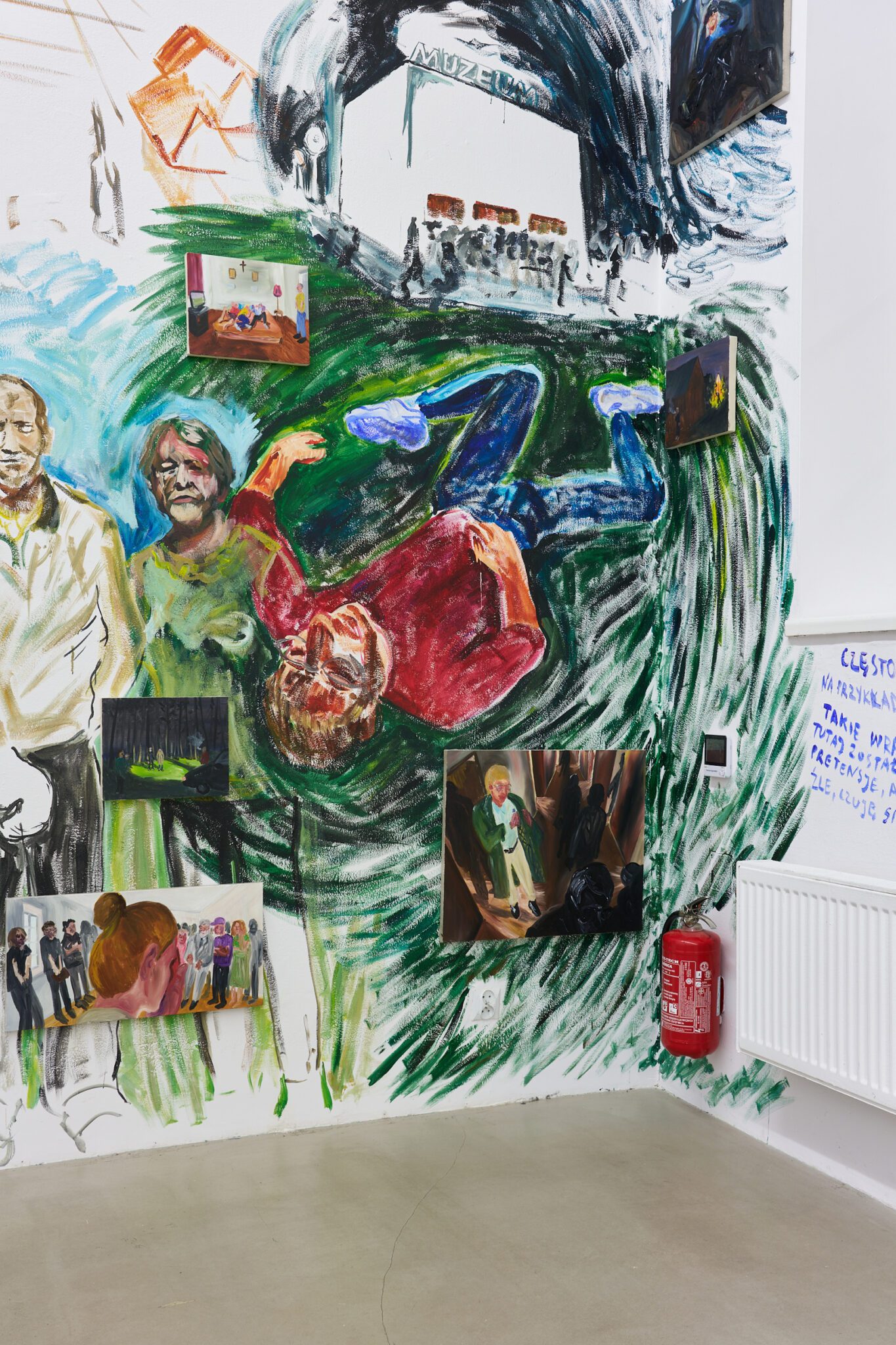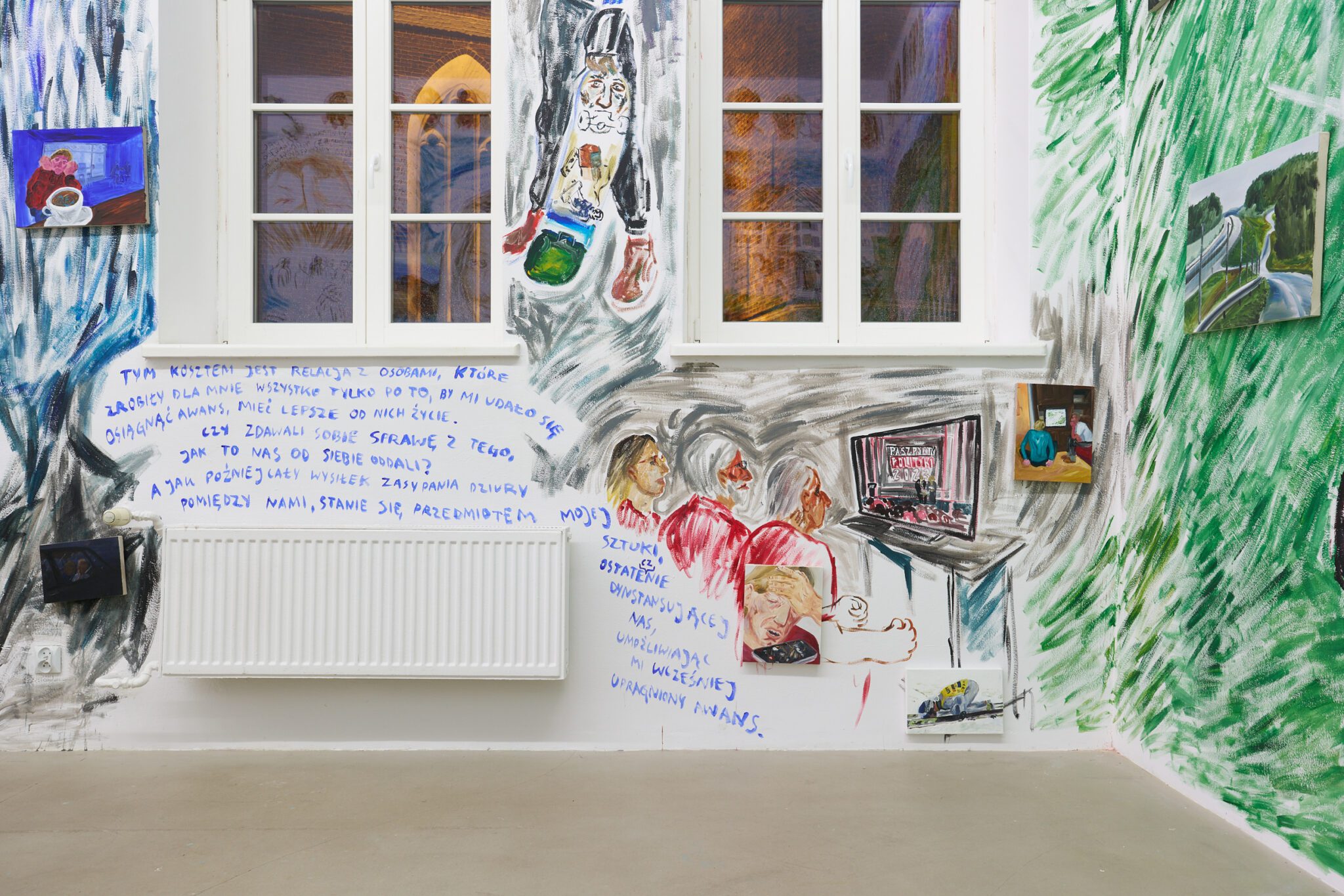 While Patryk is known for the confessional nature of his subject matter – painted images of personally experienced or witnessed moments of pain, awkwardness, vulnerability, intimacy, devotion, death – for this exhibition he takes a new formal approach. His memories are painted alongside dreams; real-life shame woven with fantasy, waking moments and scenes from films appearing on canvases slightly smaller than he conventionally paints. These elements introduce a relation to photography, and overlap large-scale mural-style paintings that cover the walls and extend to the ceiling of the gallery. In contrast to Patryk’s typical approach, this more immersive, installation-based format follows a lineage more closely associated with Mexican muralism and the early-mid 20th c. North American revitalization of fresco painting, both developed as didactic political tools for making art a part of public life, for promoting social values (popular or otherwise) and national history to the masses. A less secular reference but perhaps more regionally-relevant is the biblia pauperum – in both book and fresco format – which again play the role of narrator for a class of people that are typically not collectors or connoisseurs of art, who largely will not go to museums in search of culture but will instead experience and produce it in a more prosaic way. These points of reference have become important for Patryk as he shifts his focus from painting discrete moments to this more contemplative, holistic experience, both as a way of inviting viewers into his world and creating more space for the observer to find themselves within these walls. His ultimate desire is not to alienate or objectify anyone – subject or viewer – and perhaps most importantly, to not turn the figures in his paintings into characters but to proudly carry them with him.