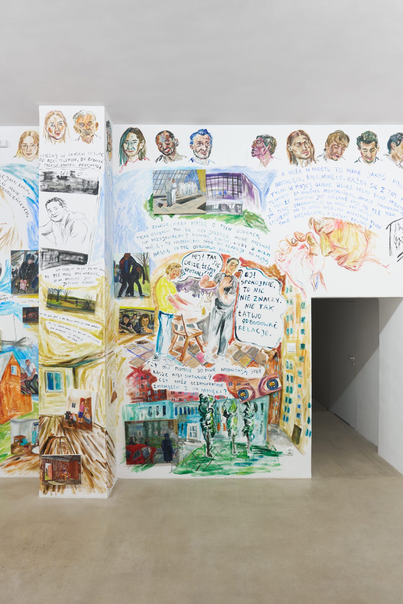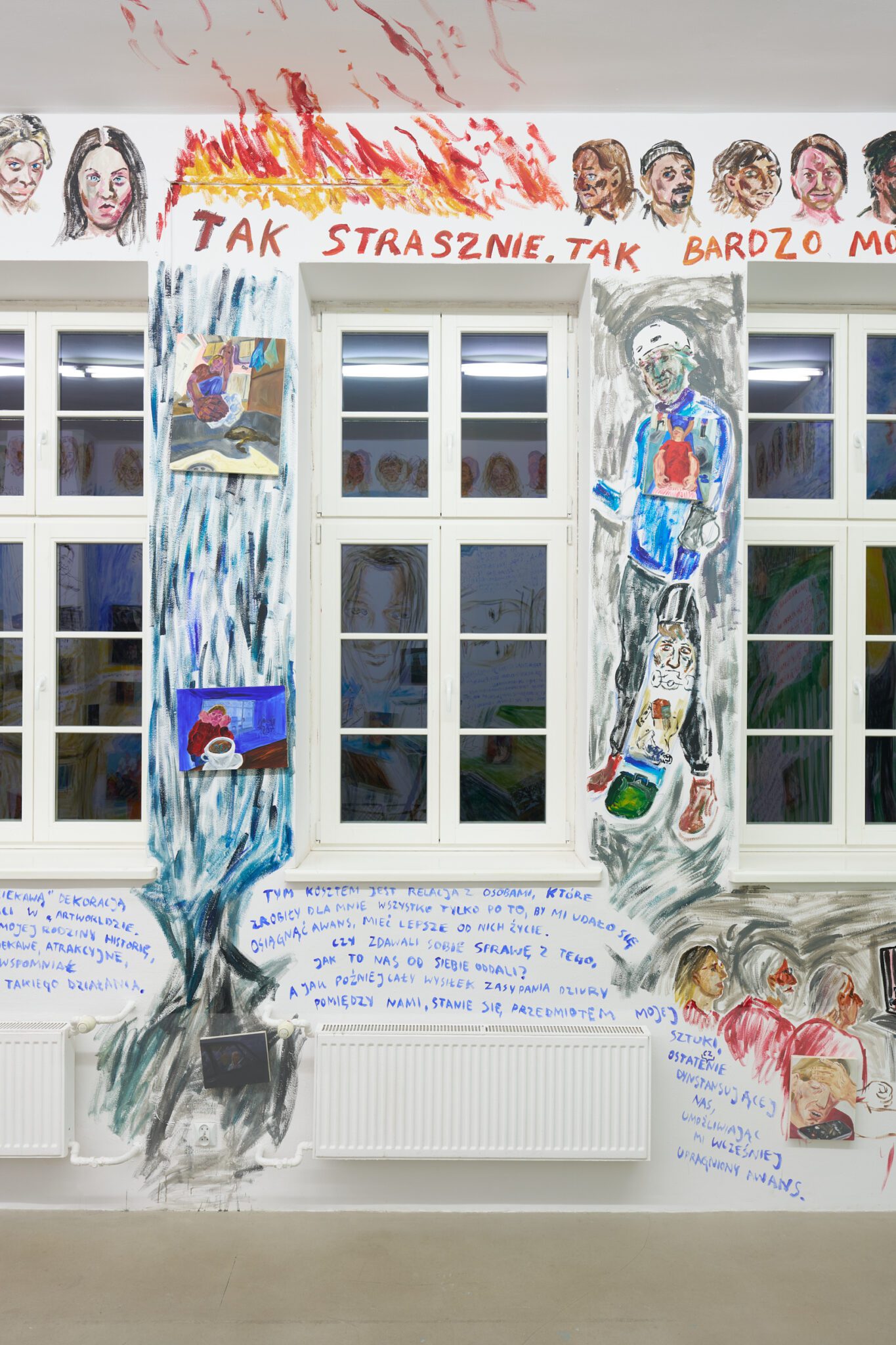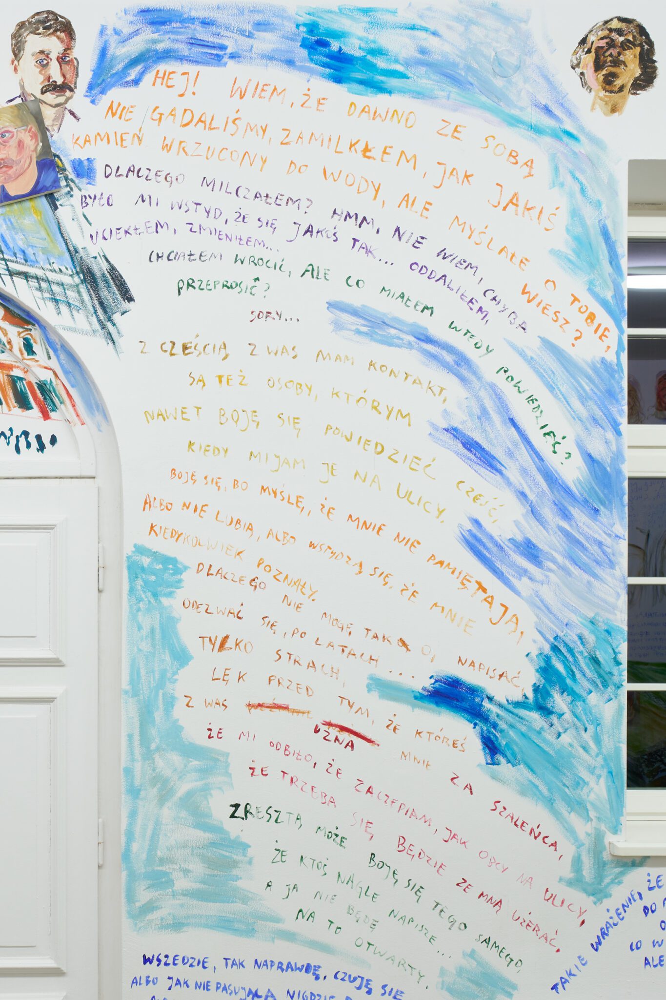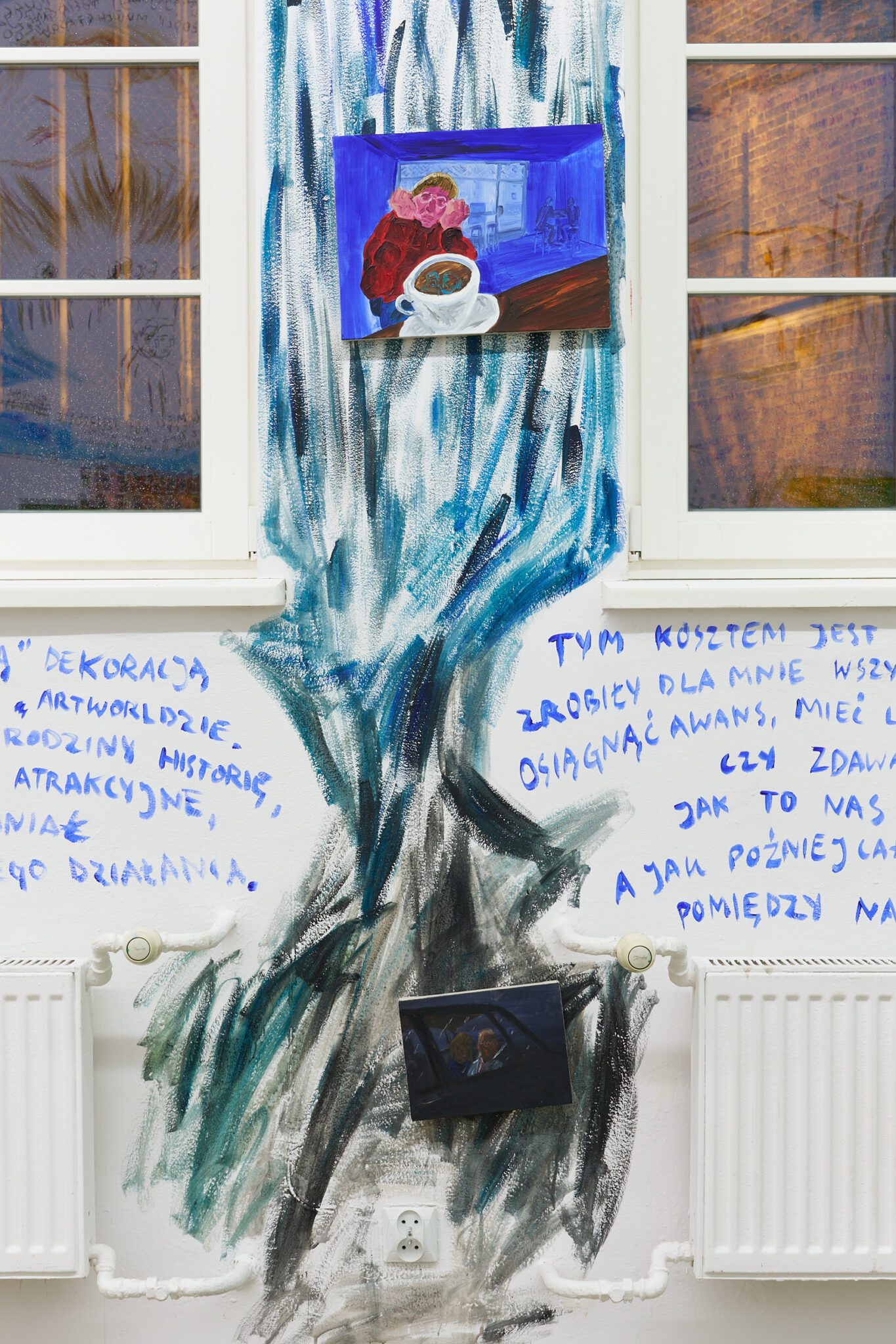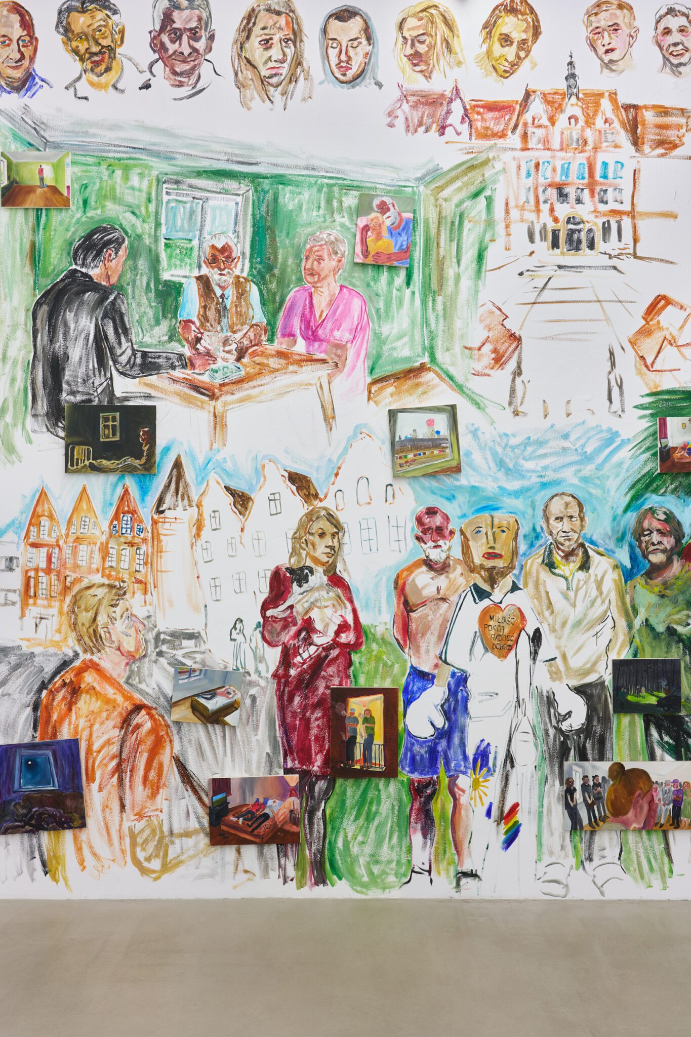 While Patryk is known for the confessional nature of his subject matter – painted images of personally experienced or witnessed moments of pain, awkwardness, vulnerability, intimacy, devotion, death – for this exhibition he takes a new formal approach. His memories are painted alongside dreams; real-life shame woven with fantasy, waking moments and scenes from films appearing on canvases slightly smaller than he conventionally paints. These elements introduce a relation to photography, and overlap large-scale mural-style paintings that cover the walls and extend to the ceiling of the gallery. In contrast to Patryk’s typical approach, this more immersive, installation-based format follows a lineage more closely associated with Mexican muralism and the early-mid 20th c. North American revitalization of fresco painting, both developed as didactic political tools for making art a part of public life, for promoting social values (popular or otherwise) and national history to the masses. A less secular reference but perhaps more regionally-relevant is the biblia pauperum – in both book and fresco format – which again play the role of narrator for a class of people that are typically not collectors or connoisseurs of art, who largely will not go to museums in search of culture but will instead experience and produce it in a more prosaic way. These points of reference have become important for Patryk as he shifts his focus from painting discrete moments to this more contemplative, holistic experience, both as a way of inviting viewers into his world and creating more space for the observer to find themselves within these walls. His ultimate desire is not to alienate or objectify anyone – subject or viewer – and perhaps most importantly, to not turn the figures in his paintings into characters but to proudly carry them with him.