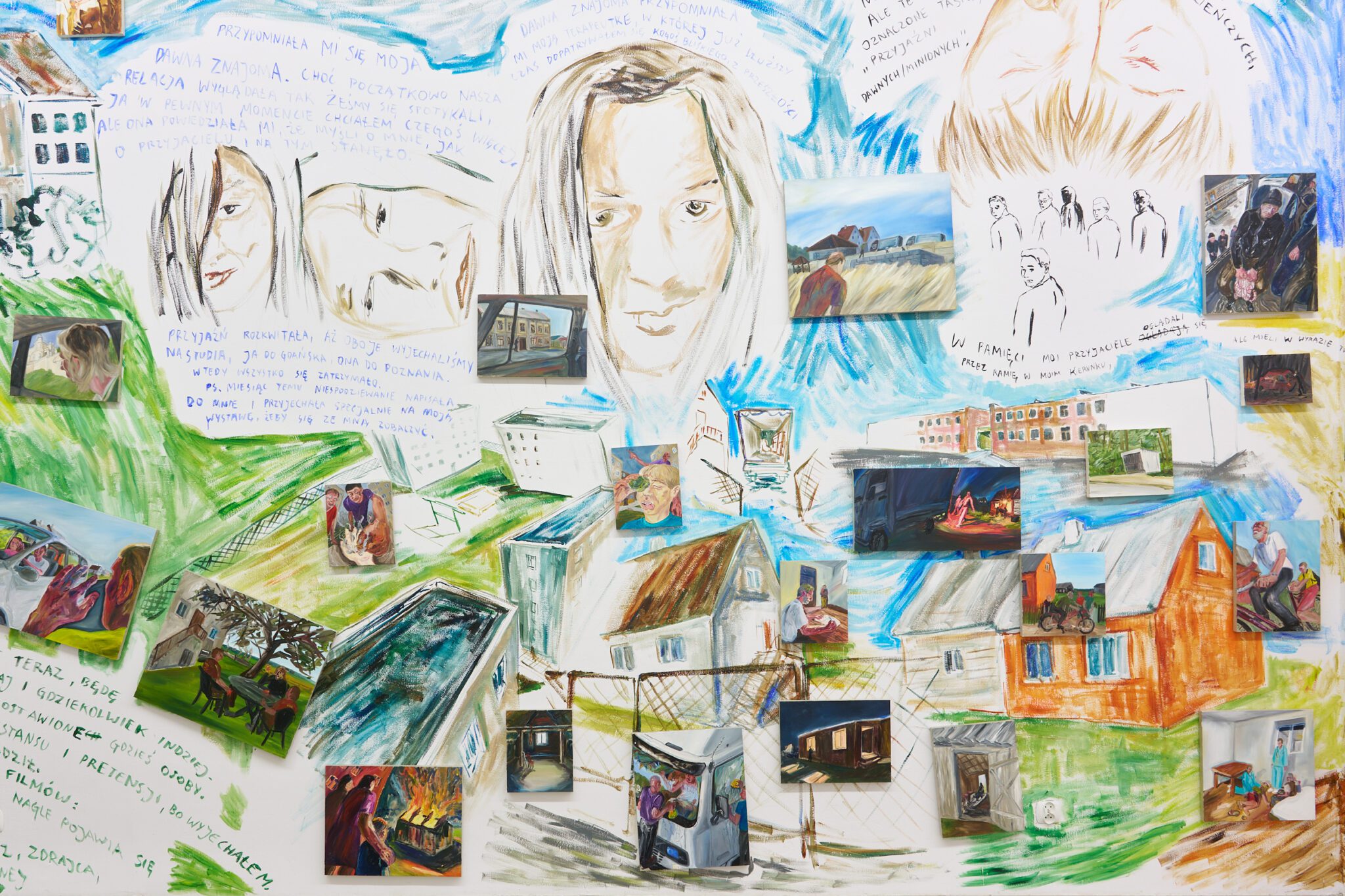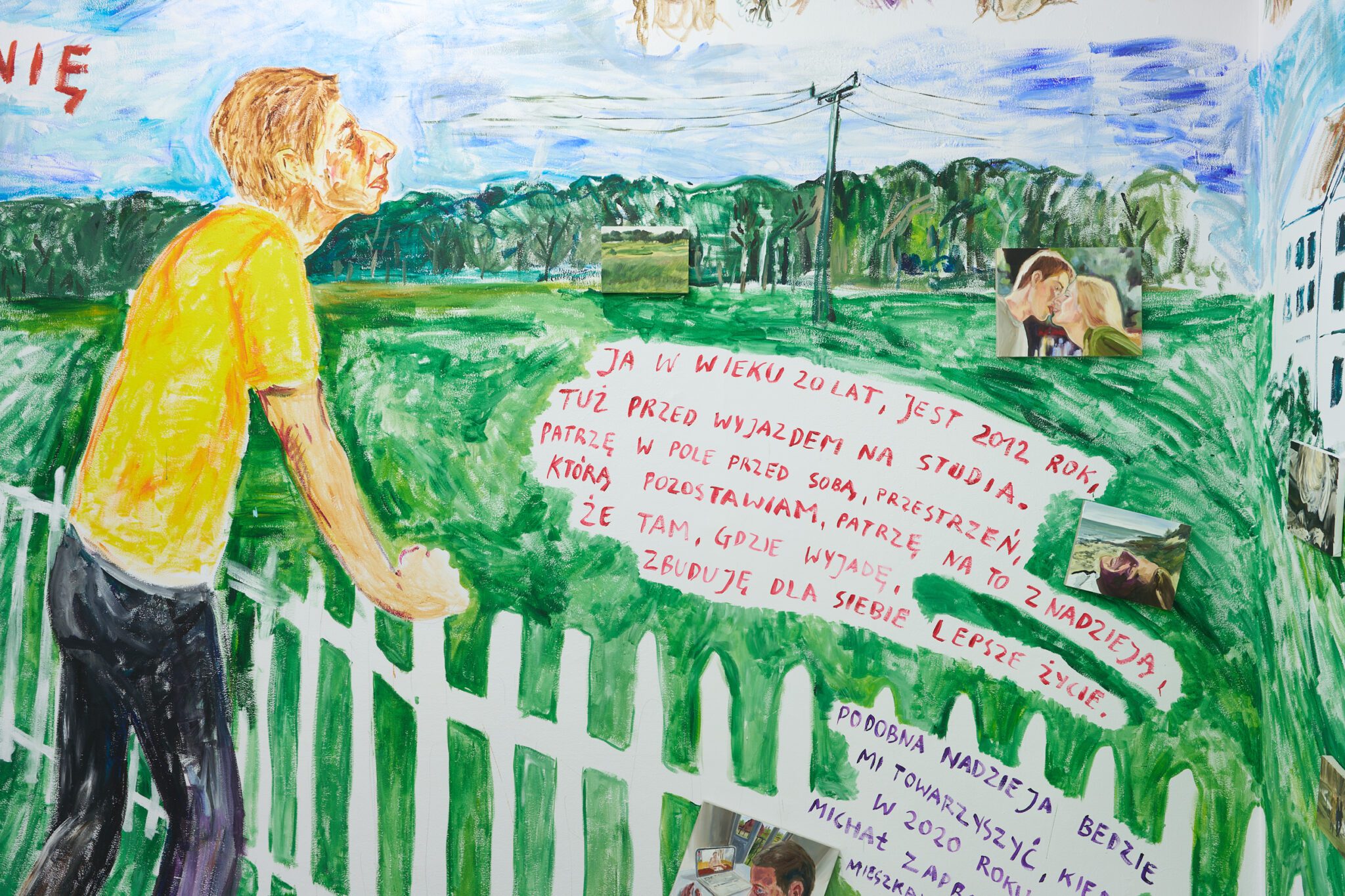 I don’t feel nostalgia for the shame, but for our time together presents an installation composed of mural-style wall paintings and paintings on canvas that work synchronously to tell Patryk’s stories of kinship, of isolation, of shame, of class and privilege and transition. Guiding us through his memories, mapped across time and place, this exhibition serves as an homage; a love letter of sorts or maybe even an apology, to those who he has kept with him despite the separation, be it through season or status.