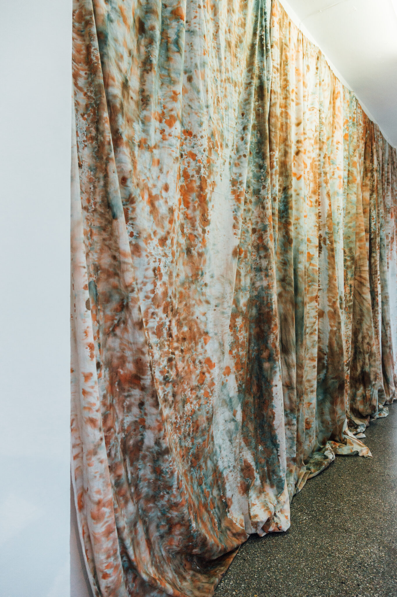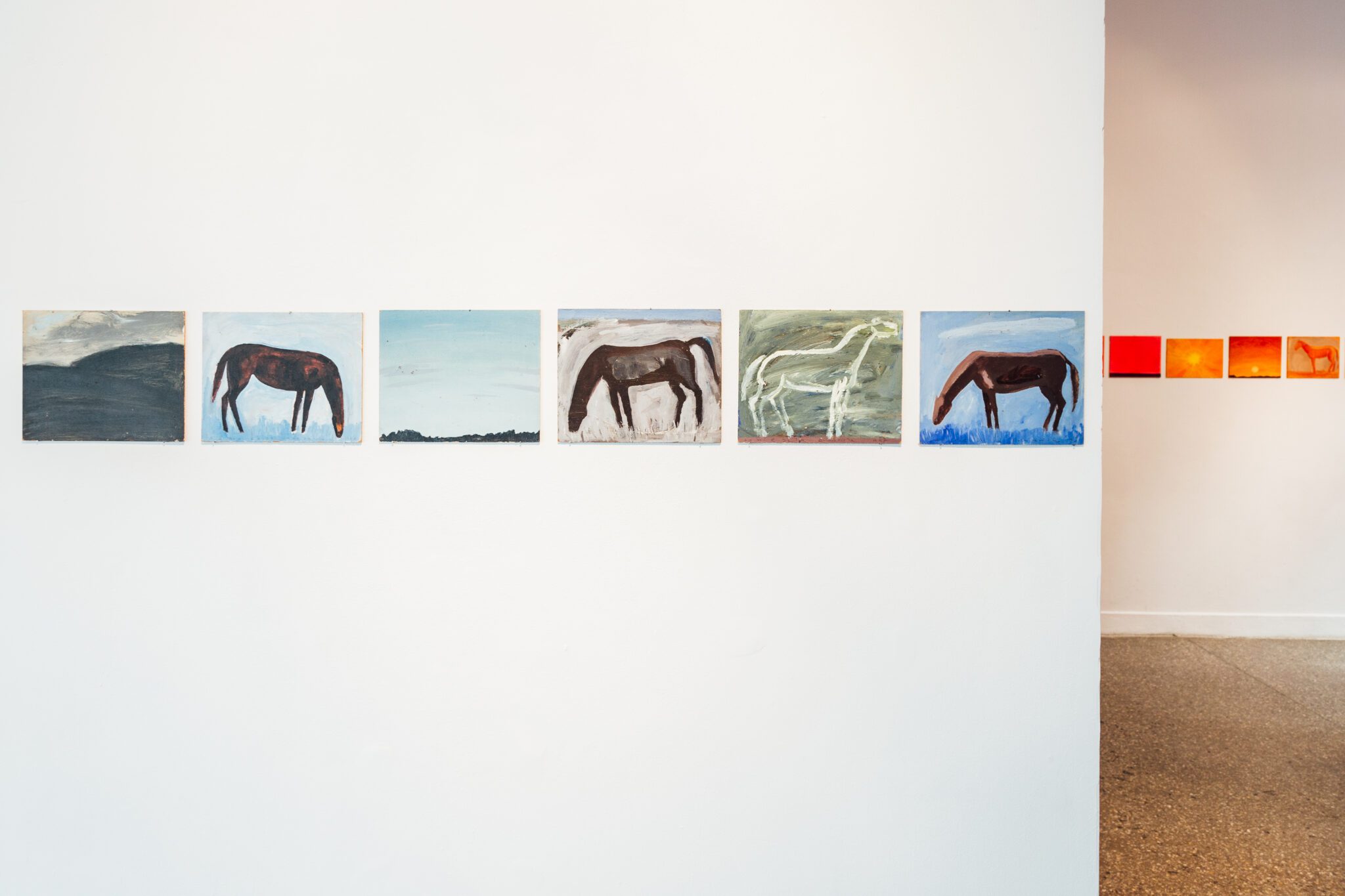 At times research turns into personal contribution in various cultures and traditions. Brzeżańska paints batiks on Java, calcinates ceramics in traditional japanese furnace on Kyushu island, takes part in psychodelic trips with shamans in Peru, Gathers herbs and mushrooms in grasslands near Mława, produces jaquard cloth in textile mill in Łódź and ceramic tiles in workshops of former craft school in Łysa Góra. She spends summer sailing a scow on Vistula river. Vastness of sky and water is common space for artists and their work, their art being an act of civic involvement in protection of wildlife. Capitalism and development of artificial intelligence are recognized as an evil force threatening all organic life on Earth, so artist saves the planet by singing ecological mantras and painting graphic spells, and sometimes puts small paper flags in dog poo. And nobody will tell us how to react to her work, contemplating foreseen doom with sheer seriousness or rather laugh at her ironic jokes and confusion. No one will help the viewer settle exhibition of Brzeżańska, if the images presented are swiftly painted, rooted in art history abstraction, or are they portraits of mysterious entities, plants, animals and spirits inhabiting Earth.