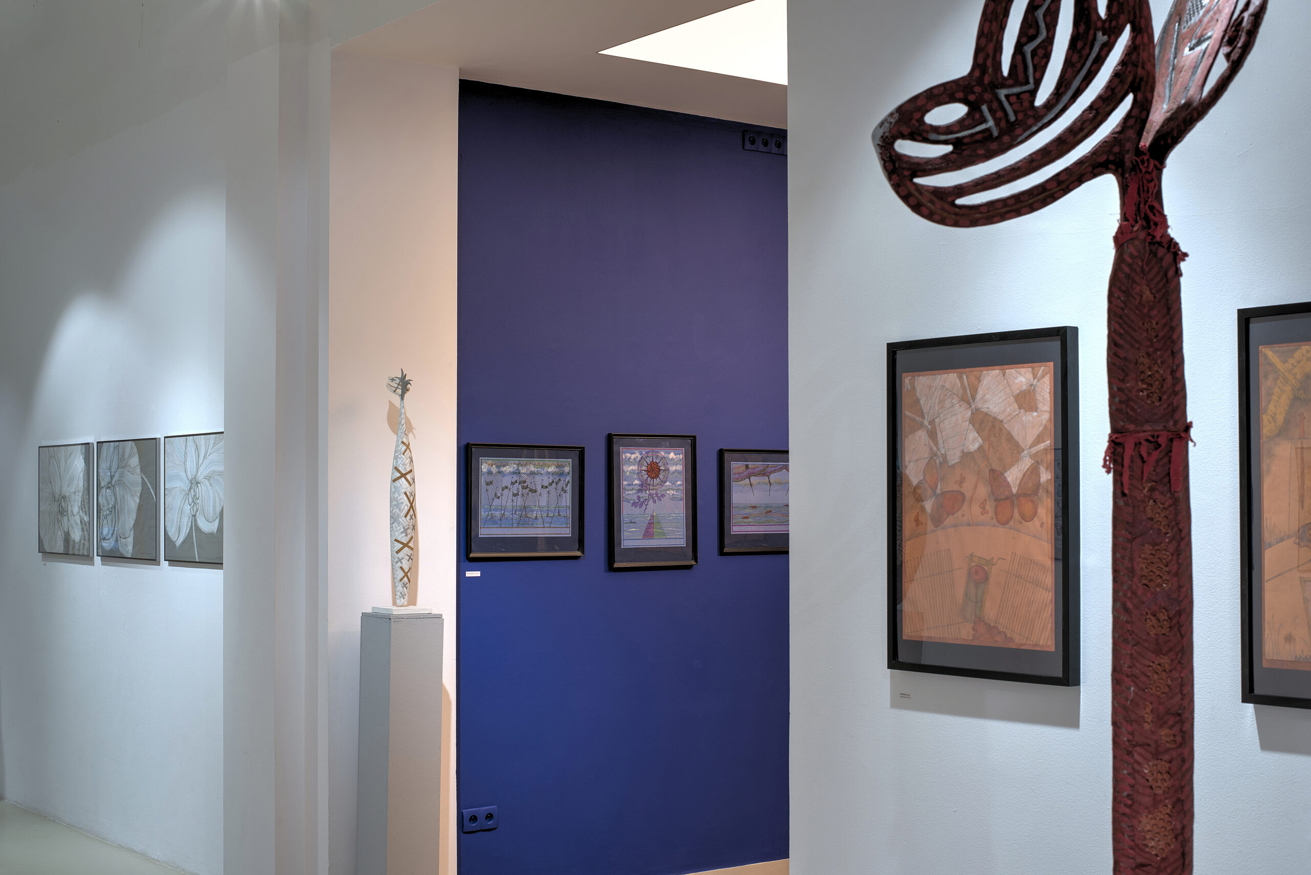 Marcin Kulpa, an interdisciplinary artist, sees borders of specific subject areas as opportunities for formal migrations and not as limits. Quite ferquently his works result from long-lasting artistic journeys. „[…] Being able to experience a specific site is an added value in itself, for me – indispensable in the proces of artistic creation” – he says. Among the most recognizable works of the artist are vertical sculptures, called totems by some, even though their origin and underlying idea arise from different premises. They are kind of „trees of life” in prevailing majority refering to organic forms. Abundant polychromous corpus is surmounted with a symbolic representation of natural forces: vital and frequently anthropomorphic. The artist looks into the nature with a scientific eye of a biologist, who is able to detect tiny, ephemeral elements, which later resonate in his works as symbols or metaphors. Although he tends to work with typical sculpting materials such as stone, metal or wood he does not restrain himself from less tangible matter: paper or fabric. A specific function is conferred to w word, which features deeply personal notion of his statements. His drawings, on the other hand, being much more than technical sketches of a forthcoming sculpture constitute autonomous means of expression, and particularly in those instances when they capture the intangible they become a personal diary of the artist. The exhibition Forms, Repertories and Collections is made up of several dozens of objects, sculptures and drawings collected mainly with the aim of this individual display will be accompanied by two short impressionistic films by Vahram Mkhitayan portraying Professor Mariusz Kulpa.