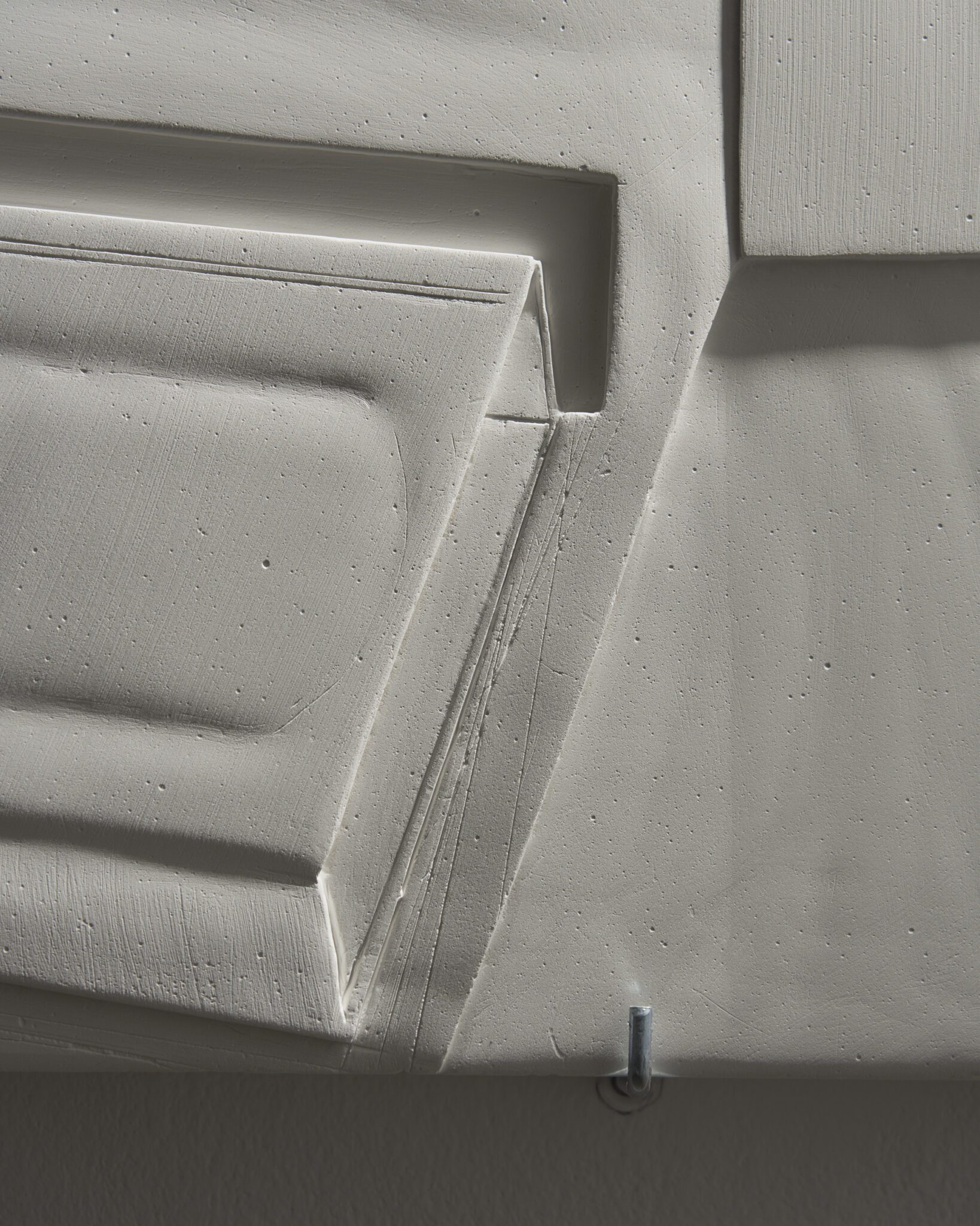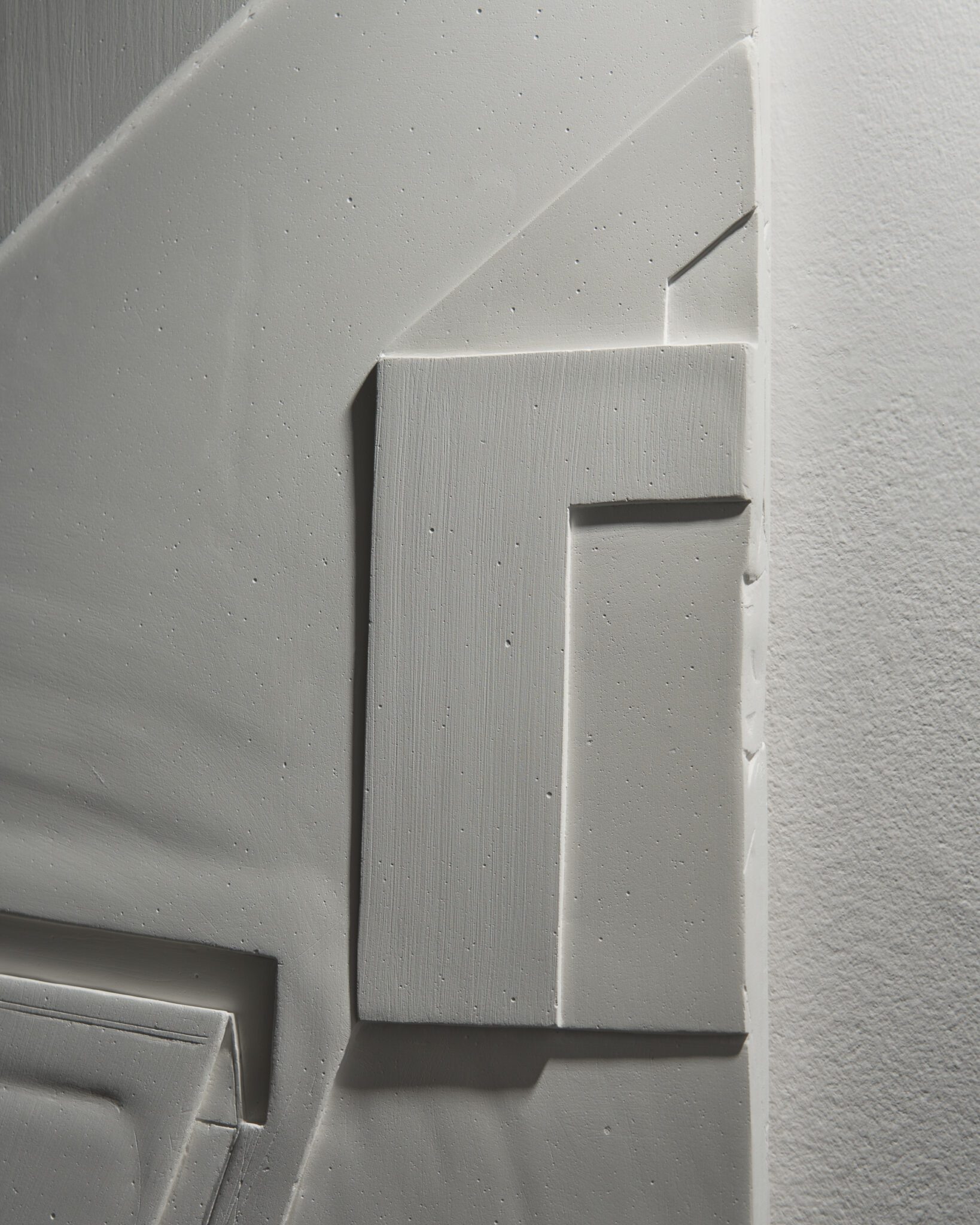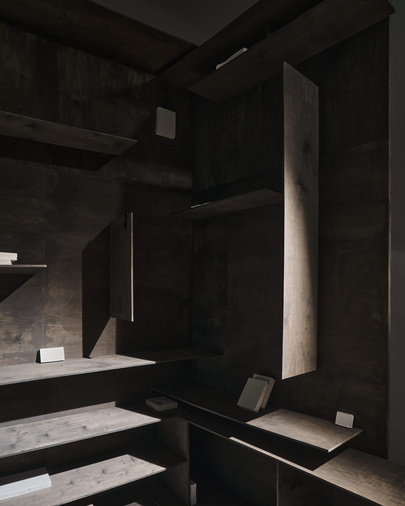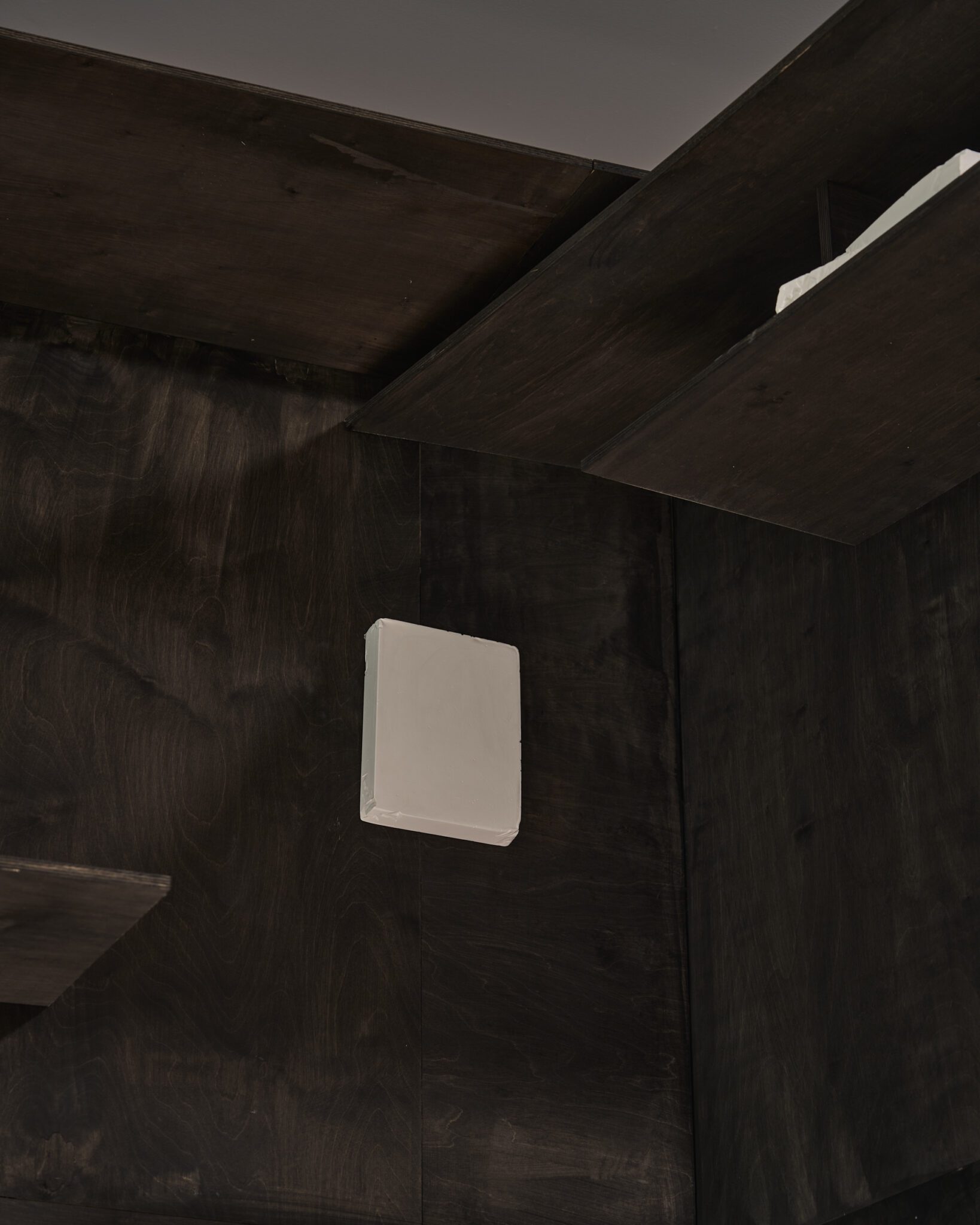 Plaster reliefs and plywood objects employ a language of reduction. They organise weight, rhythm and internal relationships ‒ both within individual works and across the exhibition as a whole. This restrained visual system allows elements typically perceived as cool or distanced to function as carriers of affect and emotional charge. In this way, the exhibition spatialises anxiety and uncertainty, which ‒ like vultures suspended midair – hover above the structure of THE GRAND MEMORY.