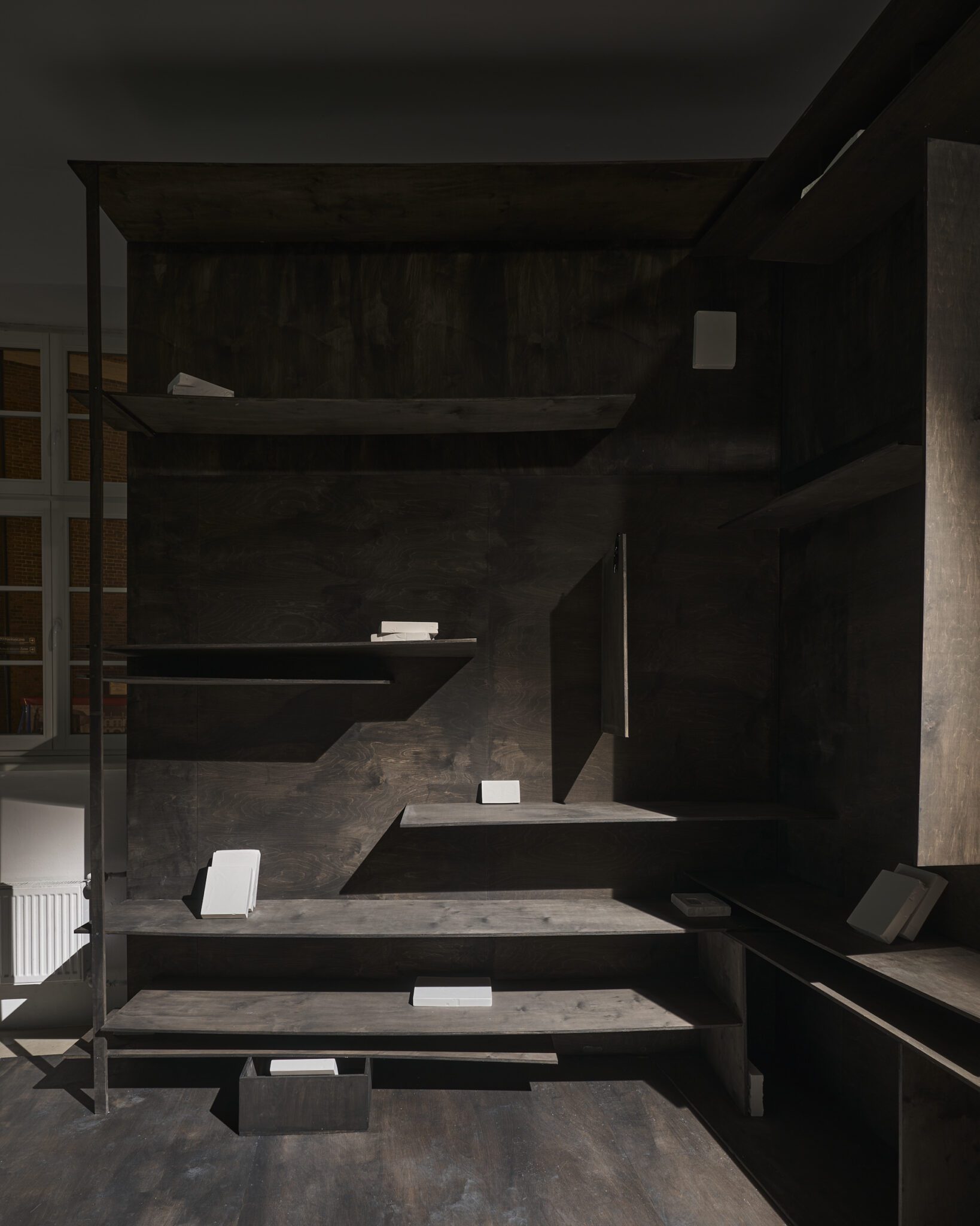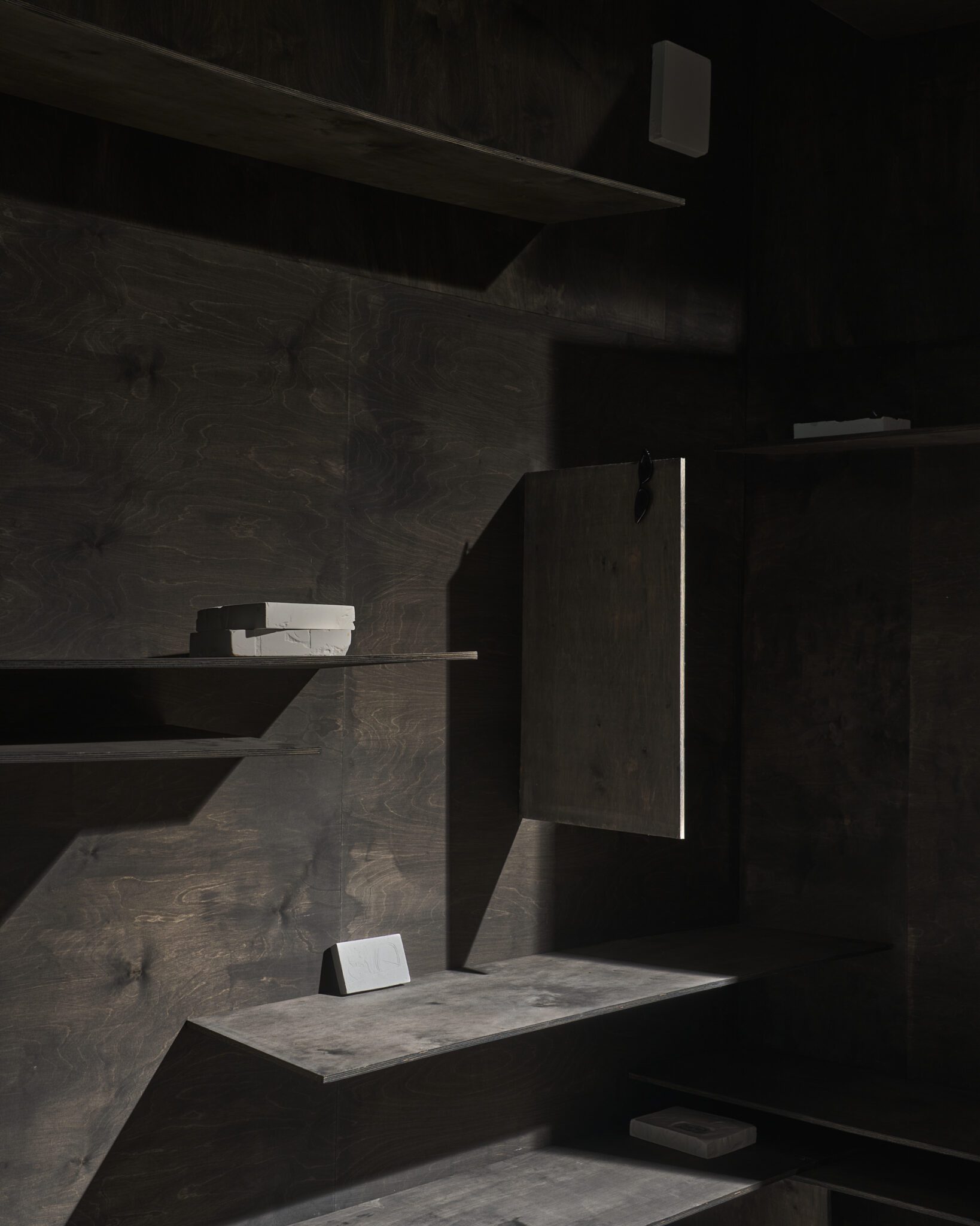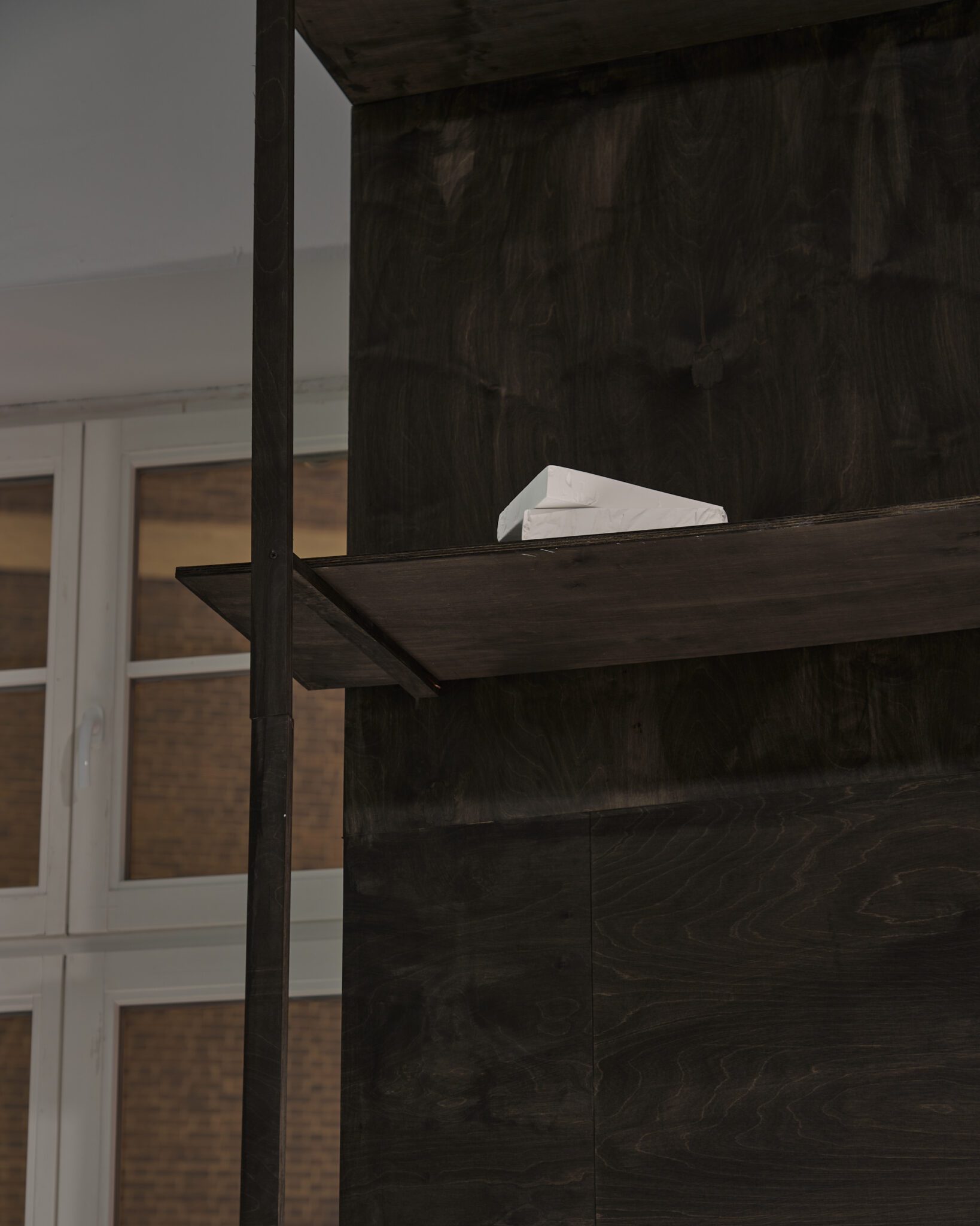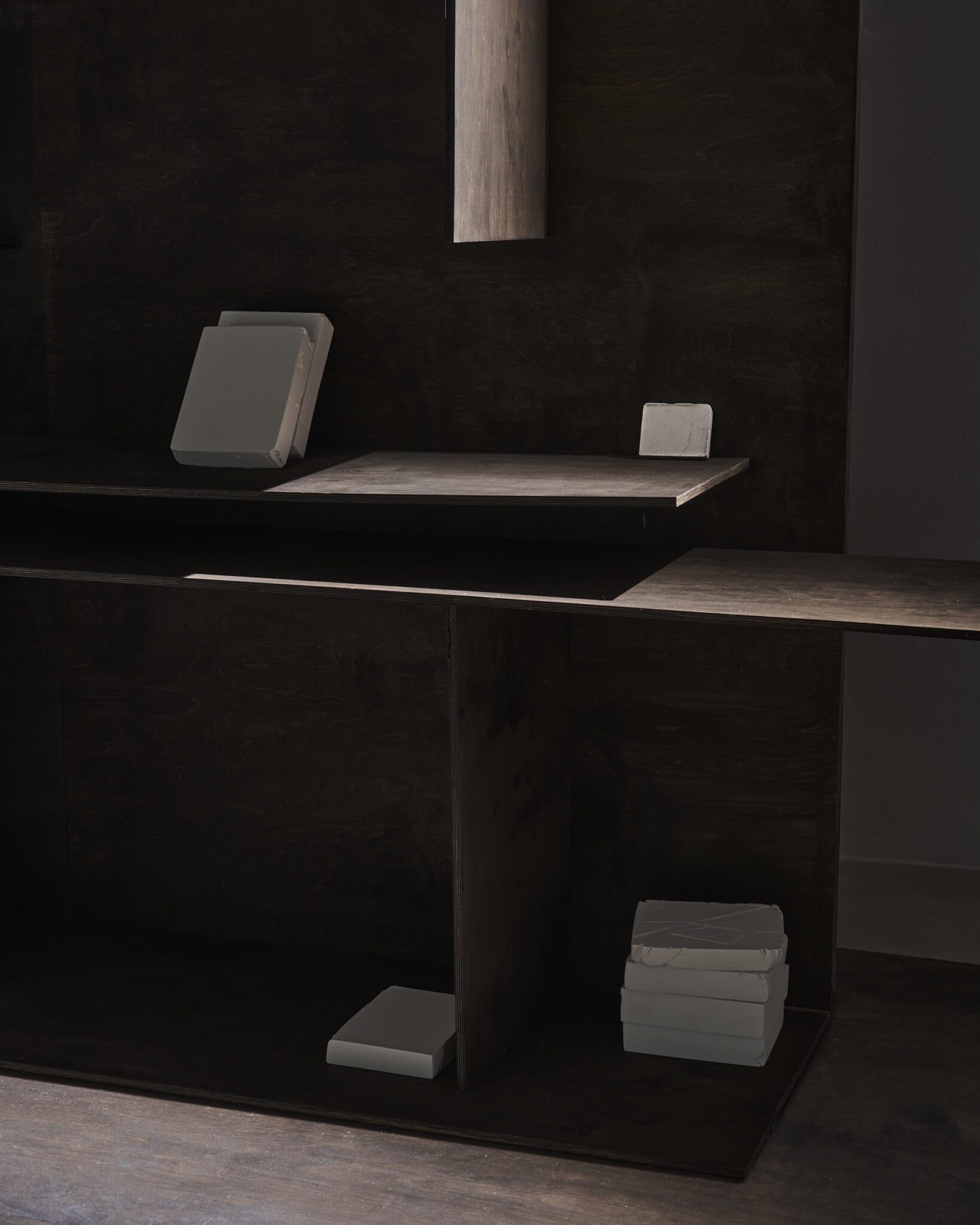 Plaster reliefs and plywood objects employ a language of reduction. They organise weight, rhythm and internal relationships ‒ both within individual works and across the exhibition as a whole. This restrained visual system allows elements typically perceived as cool or distanced to function as carriers of affect and emotional charge. In this way, the exhibition spatialises anxiety and uncertainty, which ‒ like vultures suspended midair – hover above the structure of THE GRAND MEMORY.