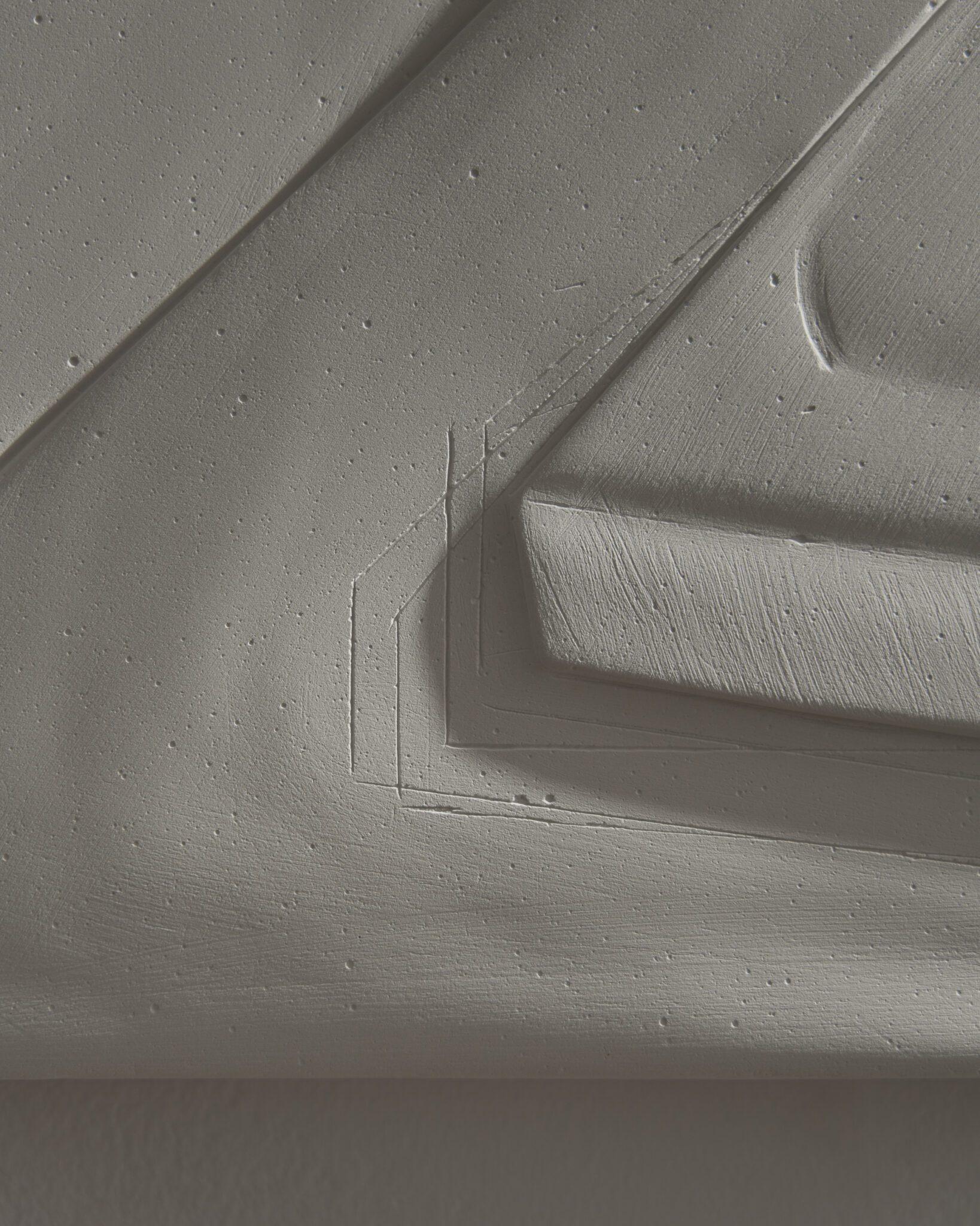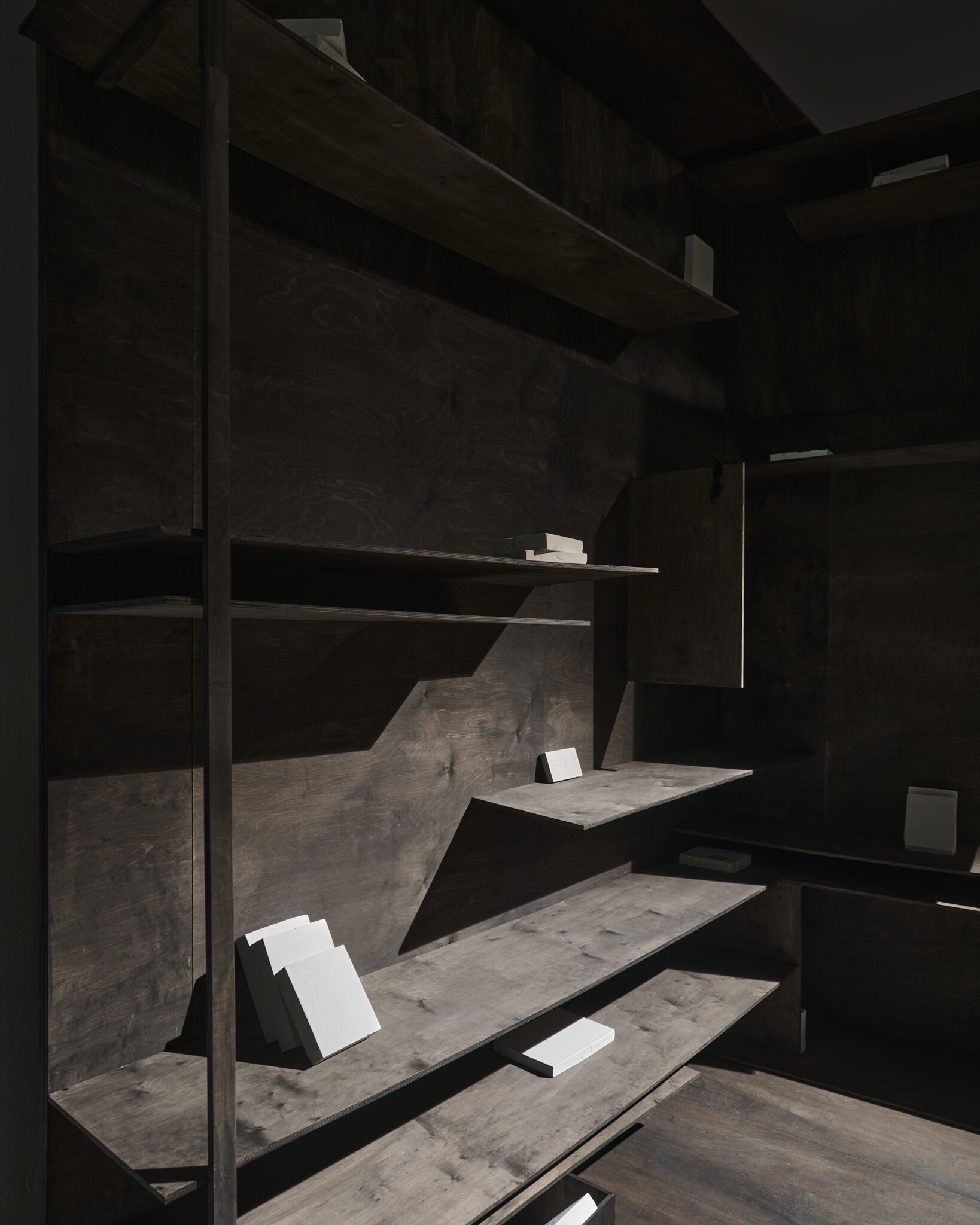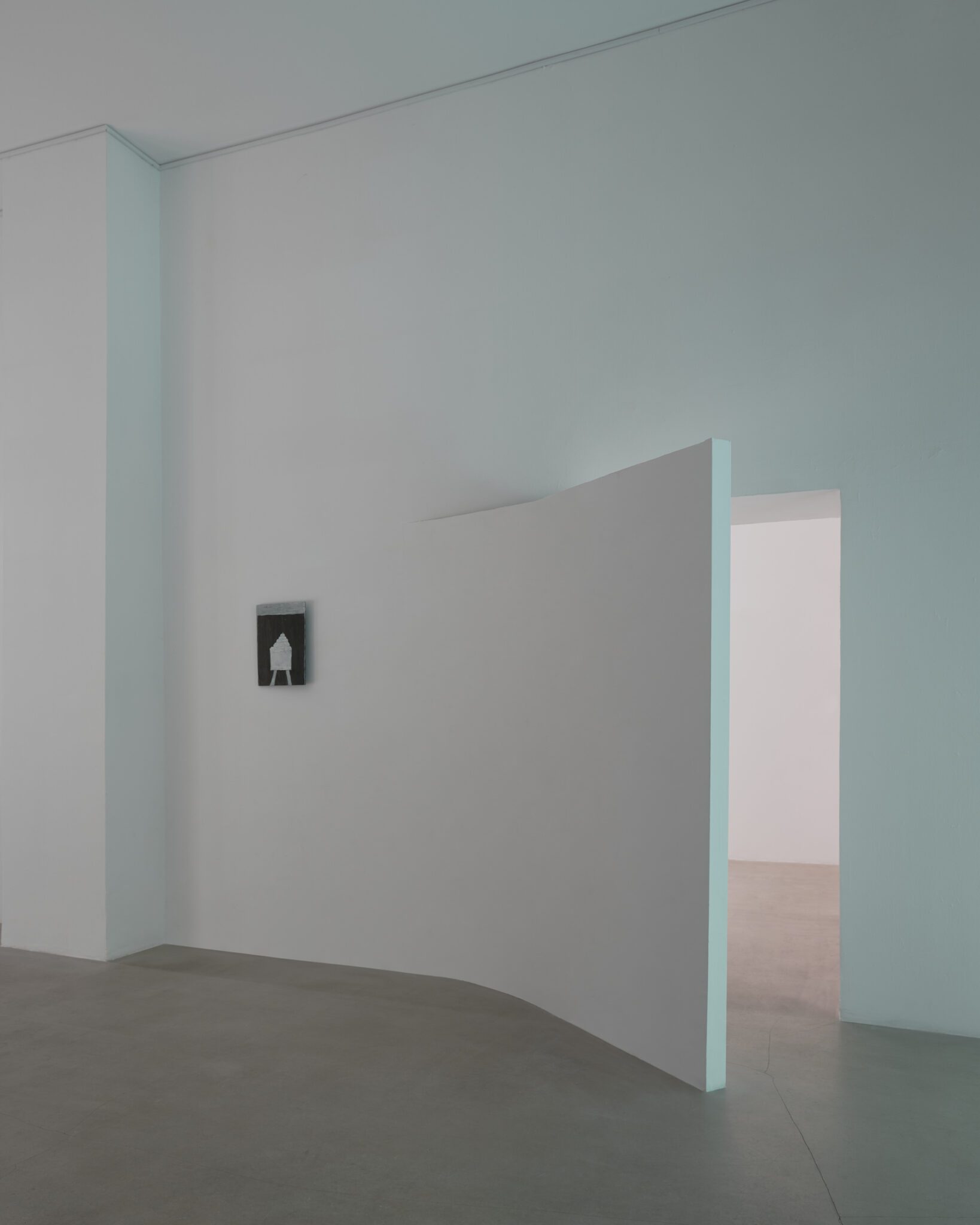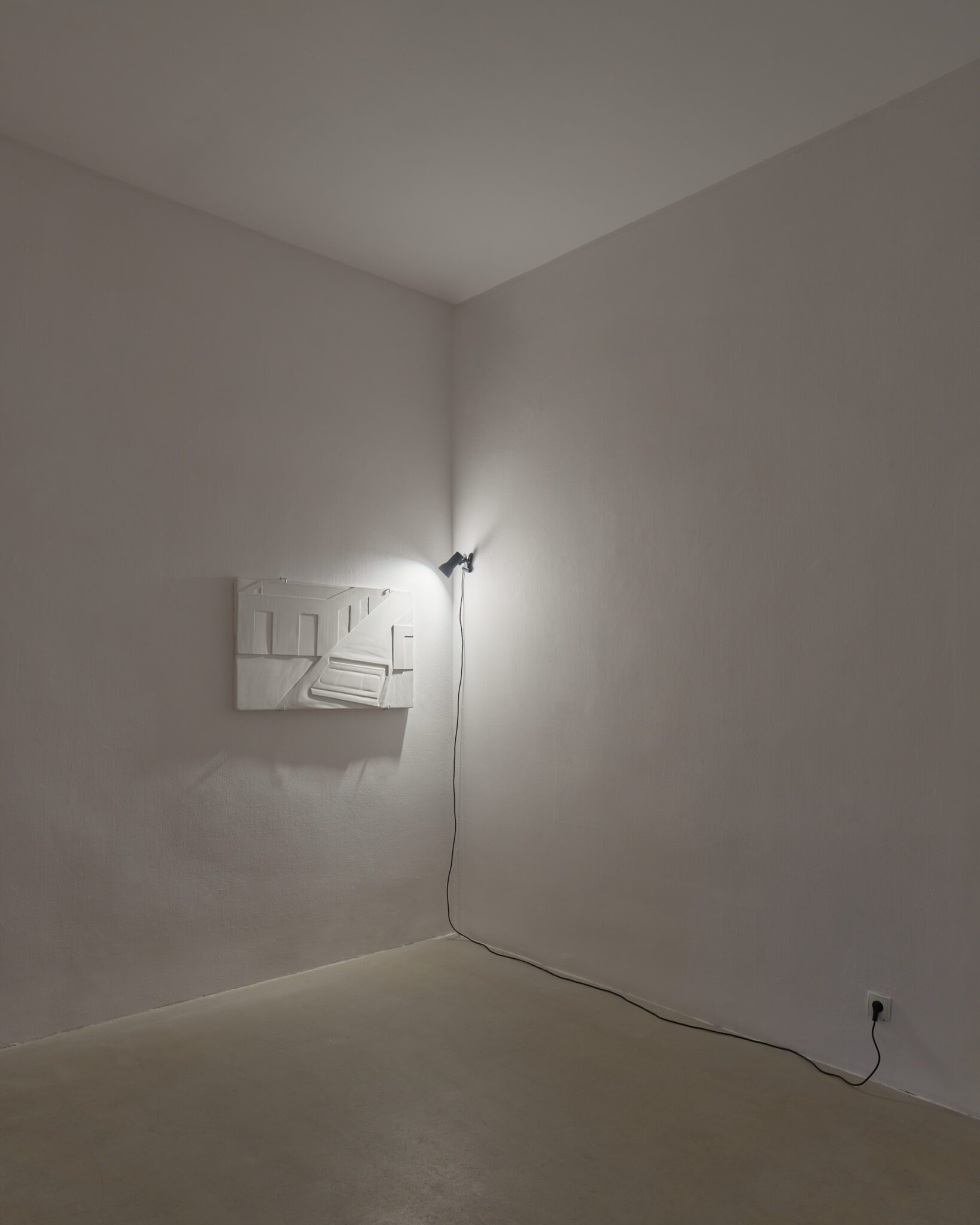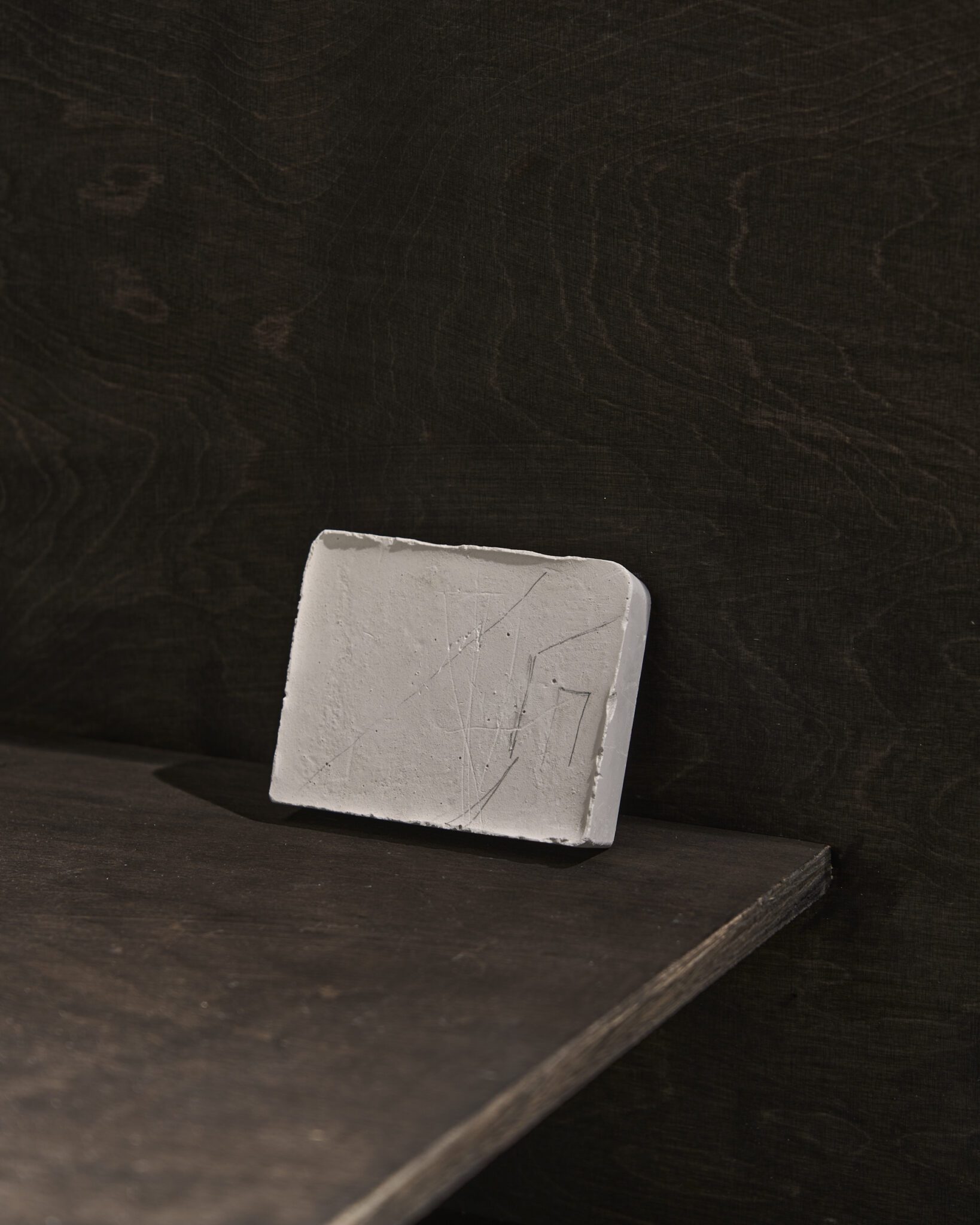 Plaster reliefs and plywood objects employ a language of reduction. They organise weight, rhythm and internal relationships ‒ both within individual works and across the exhibition as a whole. This restrained visual system allows elements typically perceived as cool or distanced to function as carriers of affect and emotional charge. In this way, the exhibition spatialises anxiety and uncertainty, which ‒ like vultures suspended midair – hover above the structure of THE GRAND MEMORY.