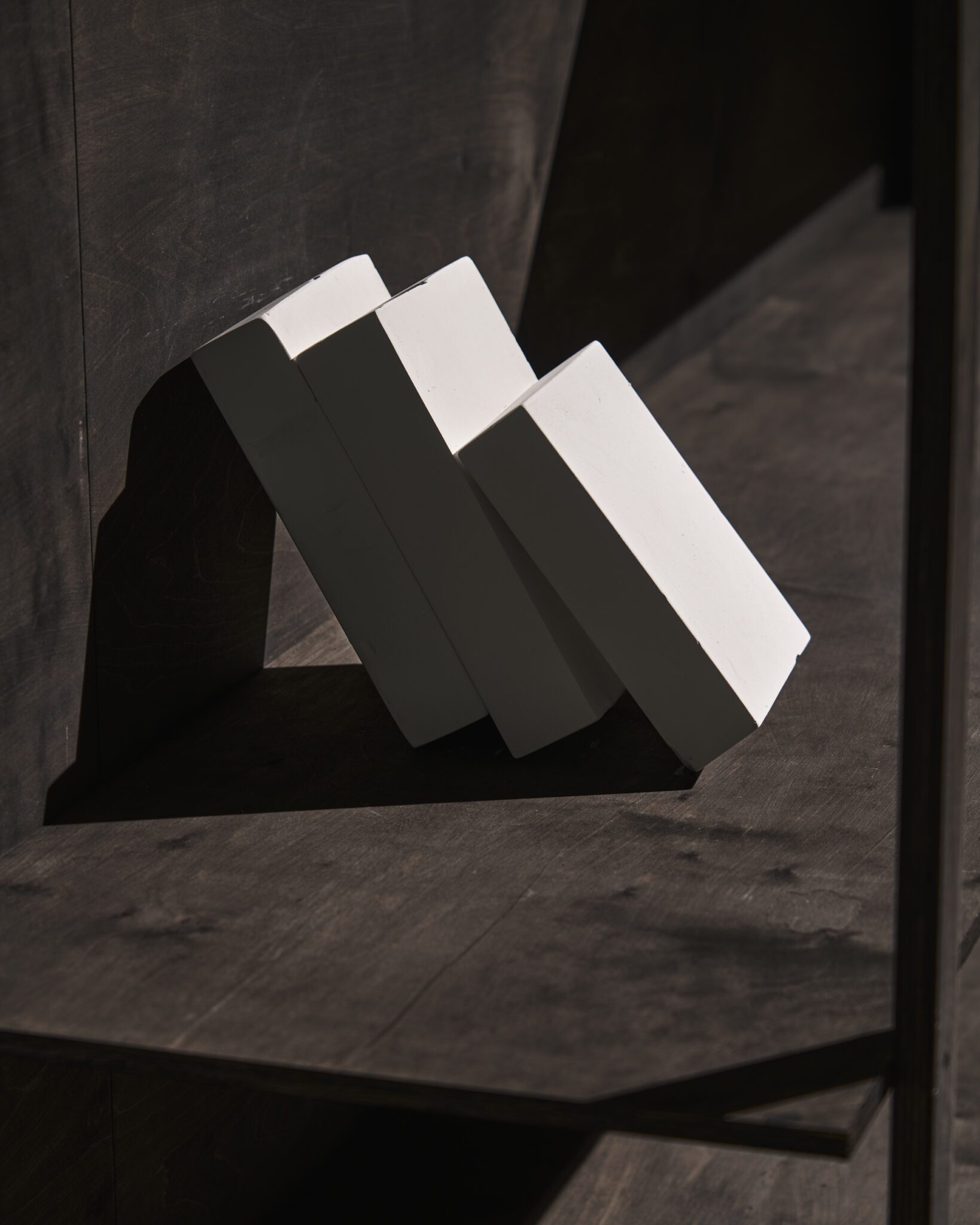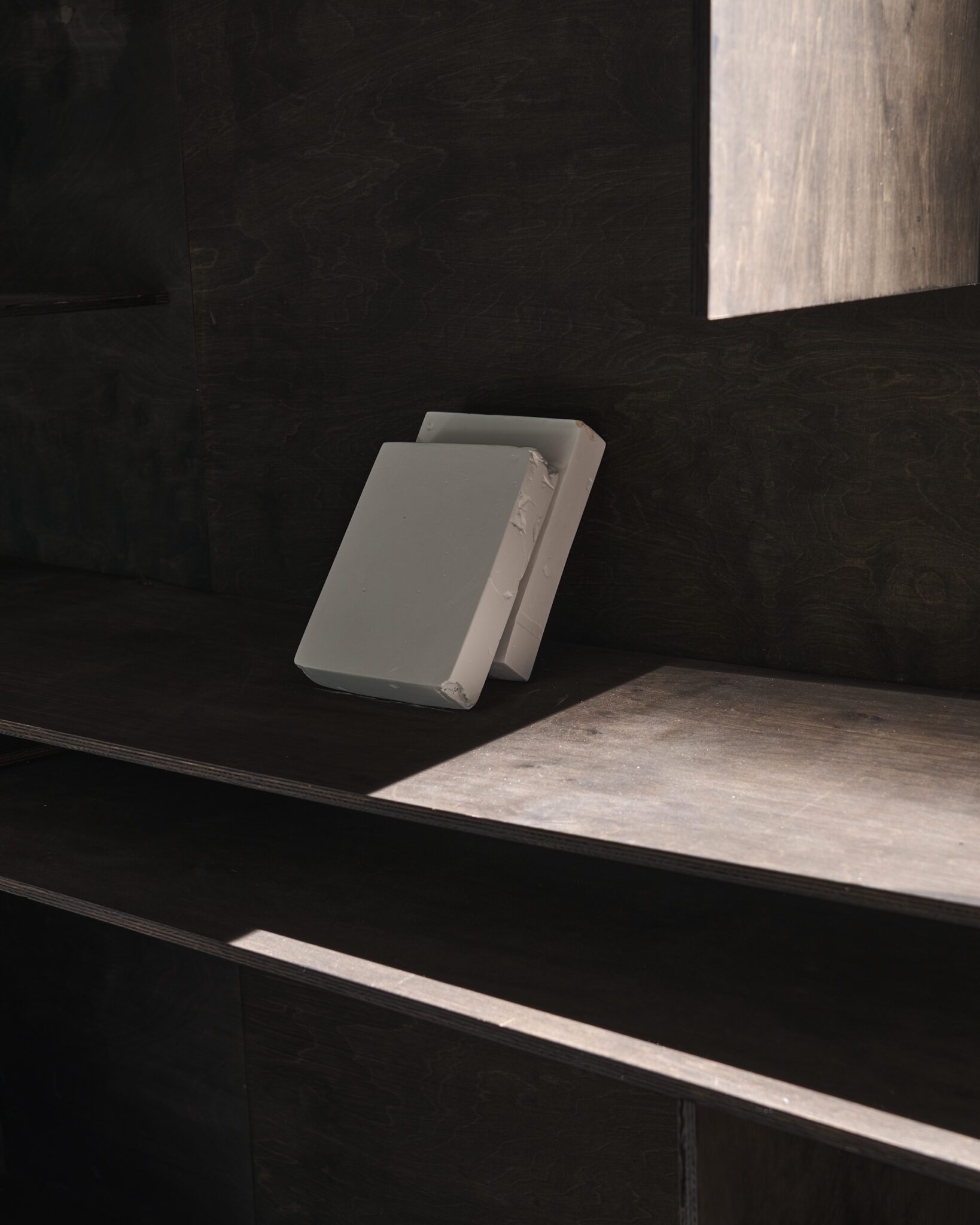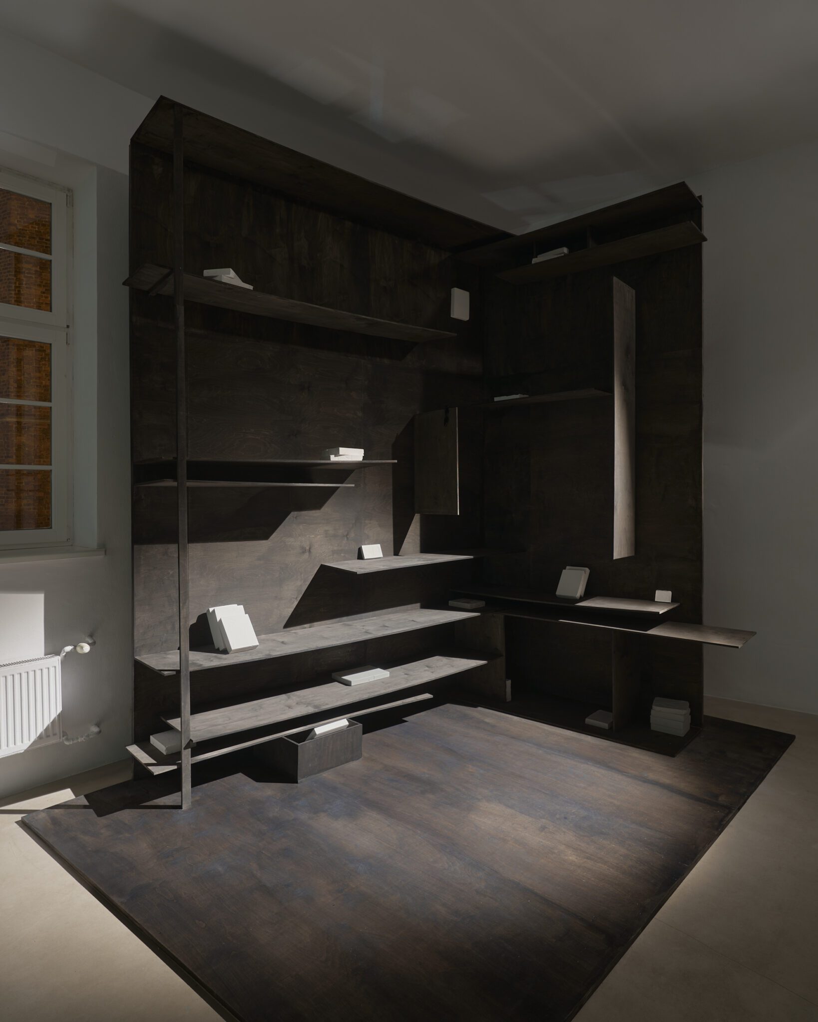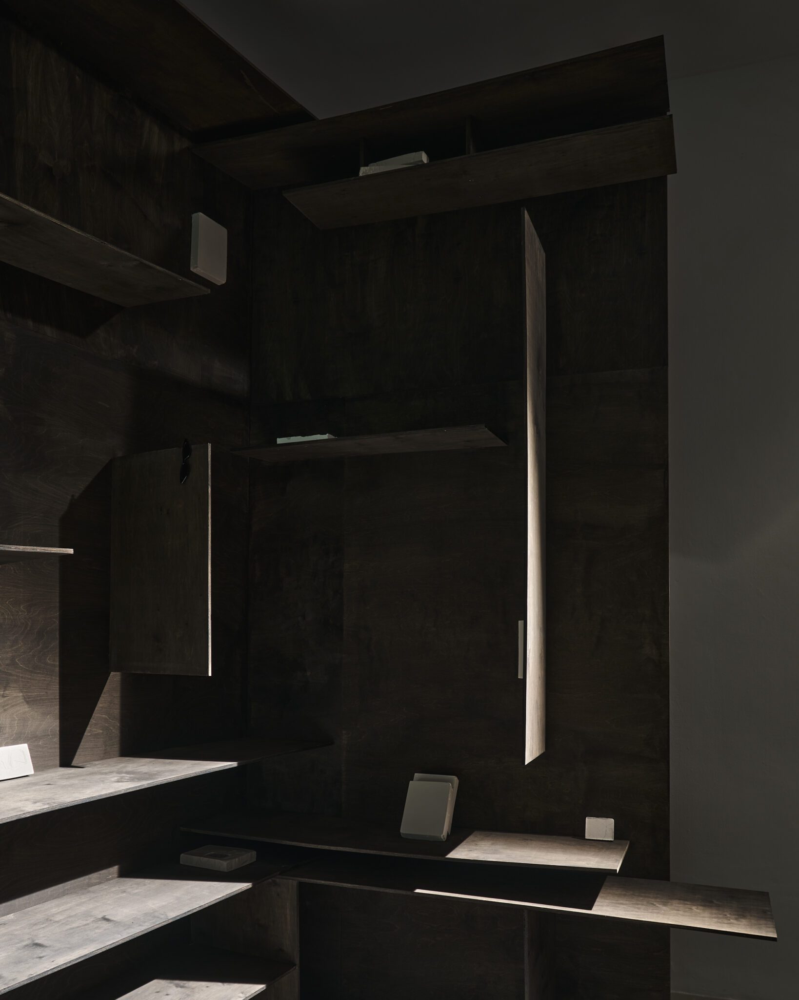 Plaster reliefs and plywood objects employ a language of reduction. They organise weight, rhythm and internal relationships ‒ both within individual works and across the exhibition as a whole. This restrained visual system allows elements typically perceived as cool or distanced to function as carriers of affect and emotional charge. In this way, the exhibition spatialises anxiety and uncertainty, which ‒ like vultures suspended midair – hover above the structure of THE GRAND MEMORY.