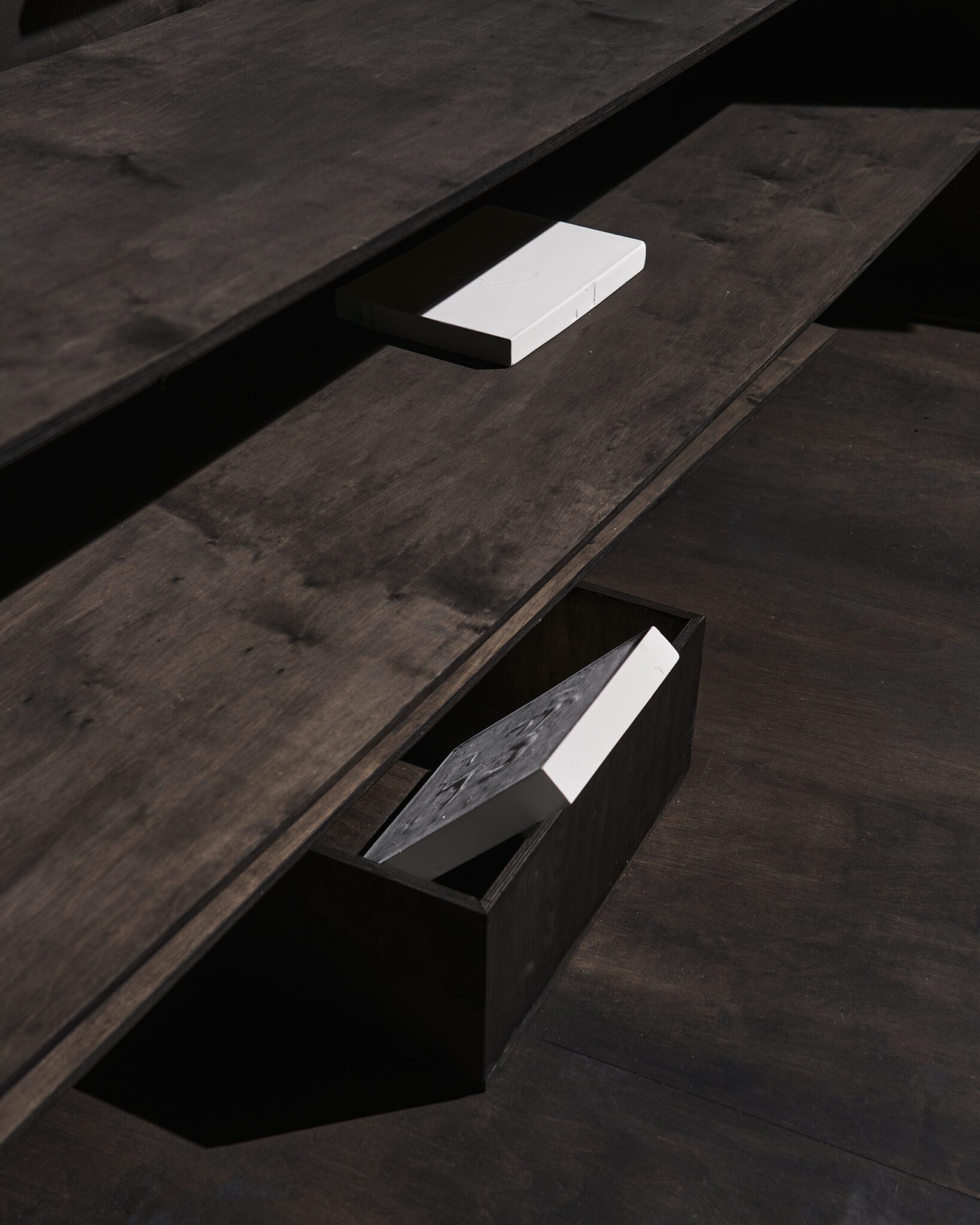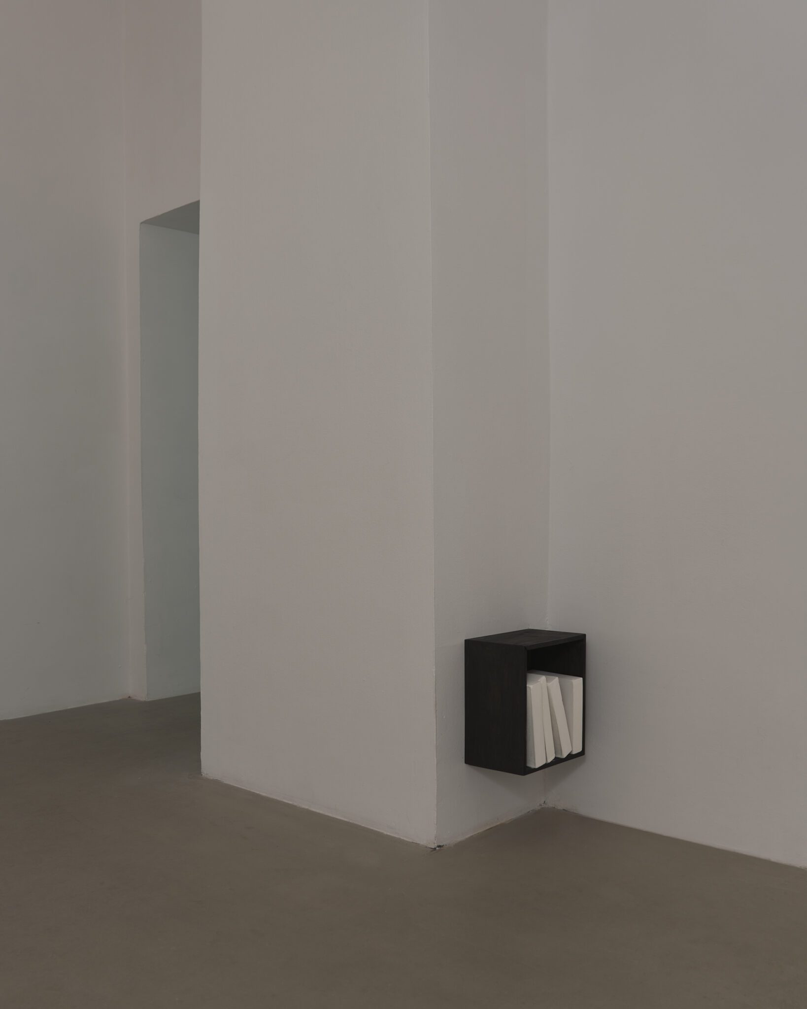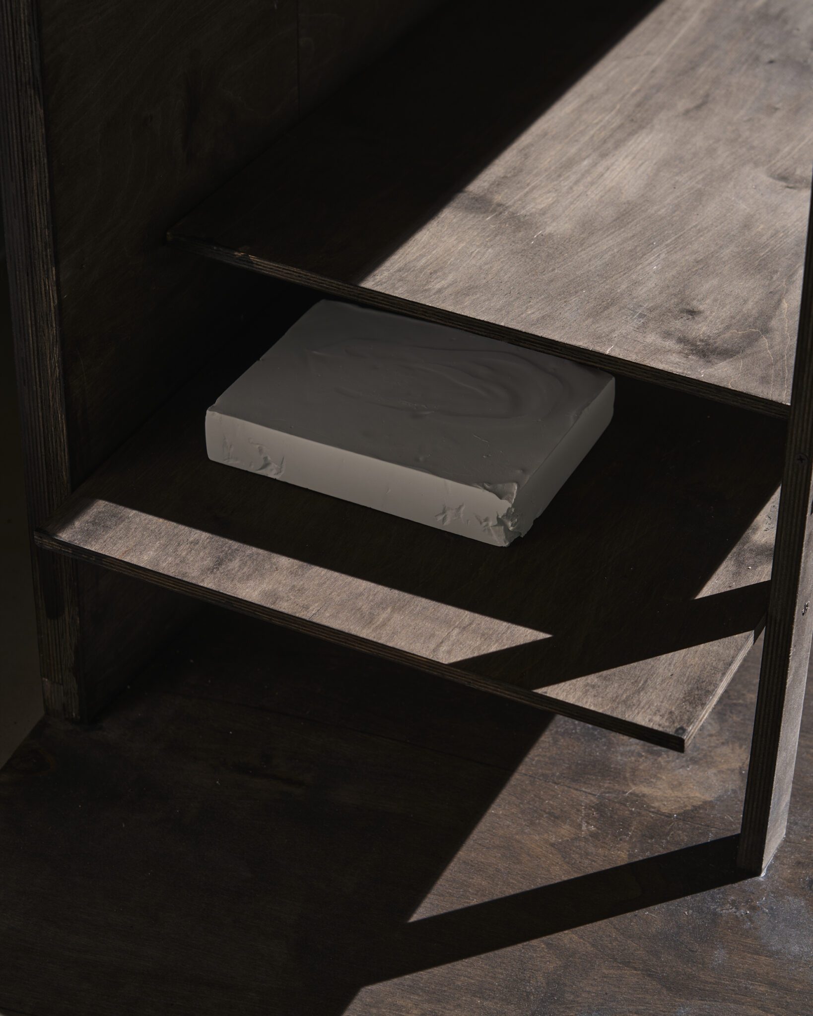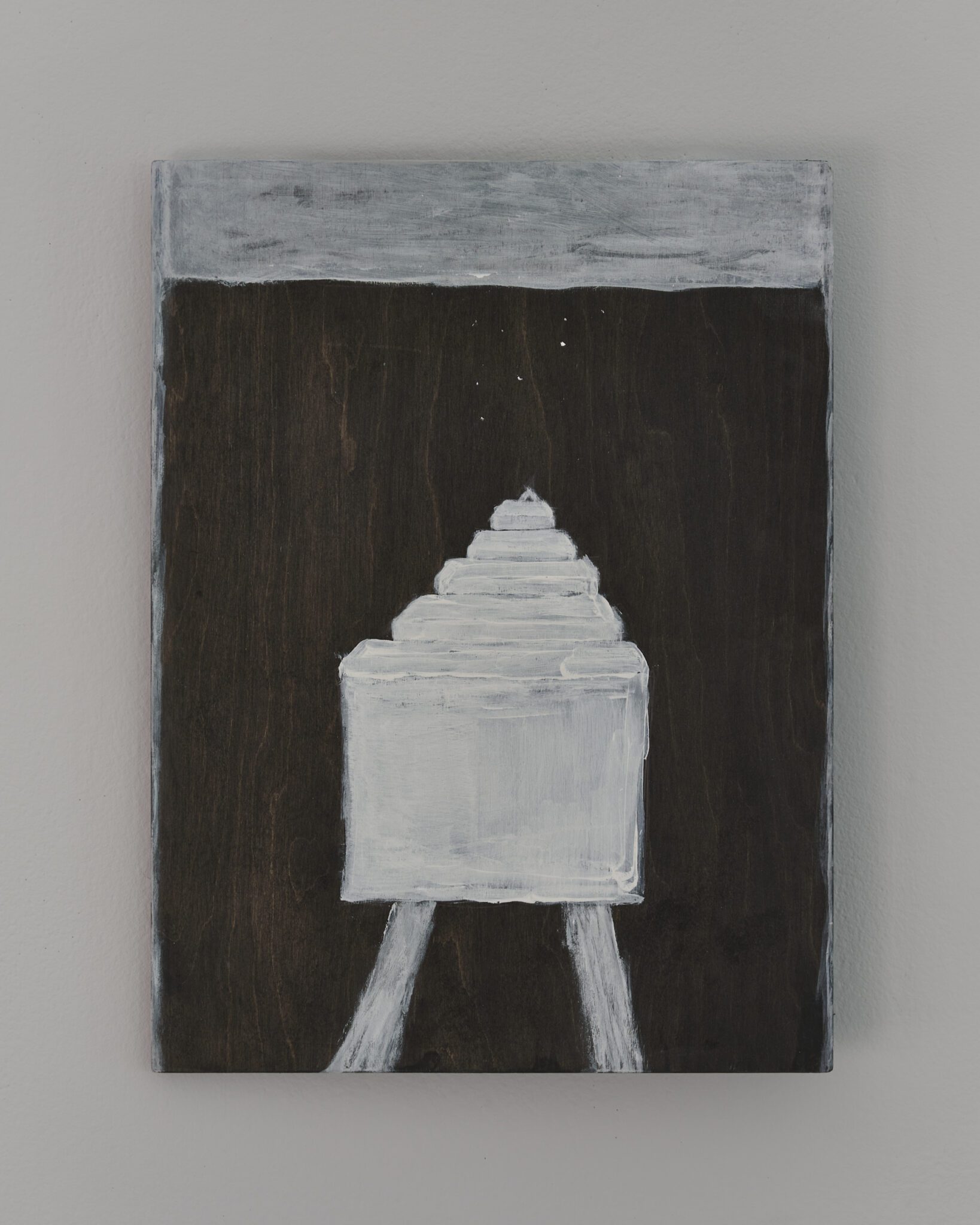 Plaster reliefs and plywood objects employ a language of reduction. They organise weight, rhythm and internal relationships ‒ both within individual works and across the exhibition as a whole. This restrained visual system allows elements typically perceived as cool or distanced to function as carriers of affect and emotional charge. In this way, the exhibition spatialises anxiety and uncertainty, which ‒ like vultures suspended midair – hover above the structure of THE GRAND MEMORY.