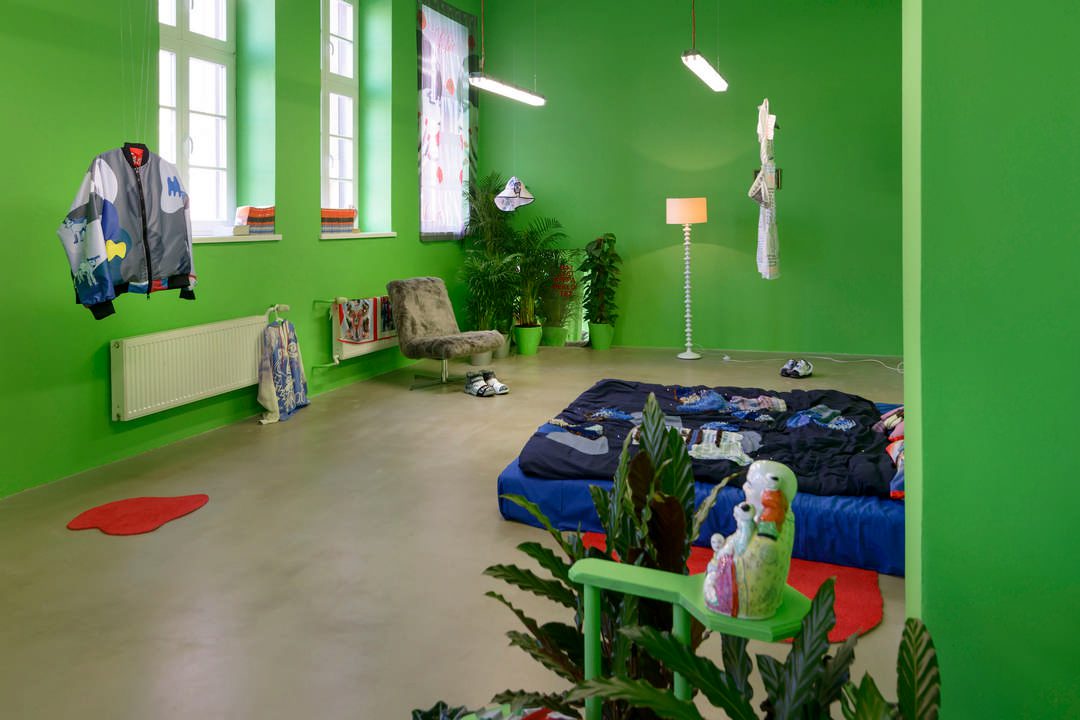 Kontynuując podróż palcem po mapie, wiedziemy ją między strefami wilgotnego klimatu kontynentalnego a zwrotnikowego klimatu monsunowego. Zbieramy doświadczenia, inspiracje, odkrywamy samych siebie. Zbliżamy się do miejsca, które nie ma rzeczywistego położenia, ale pozwala na zastąpienie tła zdarzeń dowolnym obrazem przychodzącym nam na myśl.W tej przestrzeni, wykorzystując technikę green screen, zastajemy codzienność, w której ubrania są nośnikiem historii i przeżyć. Bez kompulsywnego przemieszczania się docieramy do prawdziwego sedna podróży. Cumujemy wraz z wszystkimi smutnymi, niechcianymi ubraniami, które świadomie nie chcą być trendy.Miejsce, do którego dotarliśmy, pozornie znajduje się w centrum. Jednak pozostając tu dłużej, czujemy, jakby było na uboczu – wyłączone z ciągłego uczestniczenia. Tu nie trzeba pytać: czy pasujesz? Jesteś w bezpiecznej przestrzeni, wolny od osądu. Na jasnej betonowej podłodze leżą wymieszane ciuchy; zmiksowane, zrzucone z wieszaków. Między nimi biegają Niebieskie Psy. Opowiadają nam swoje niewygodne prawdy, ocierając się i gubiąc sierść.