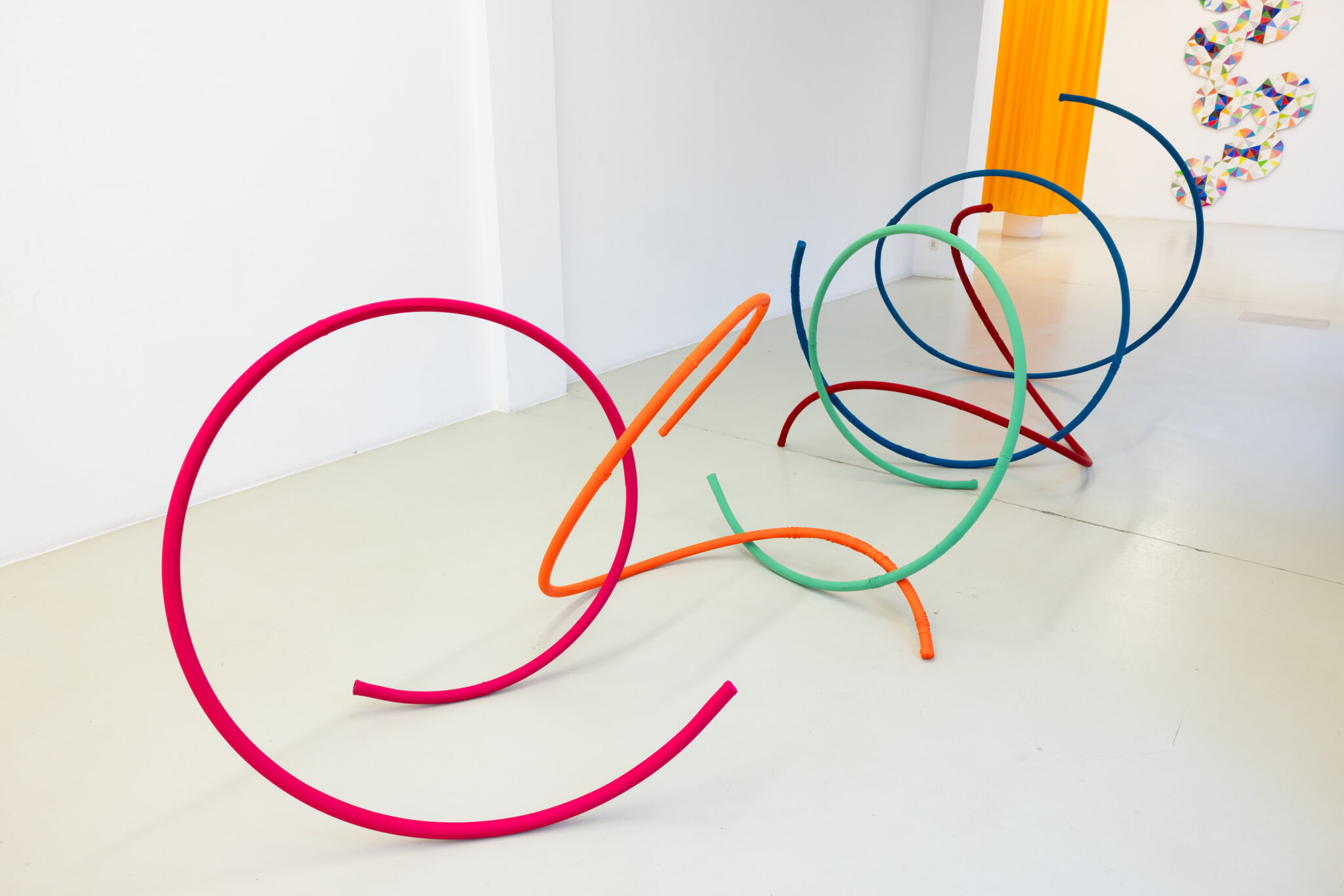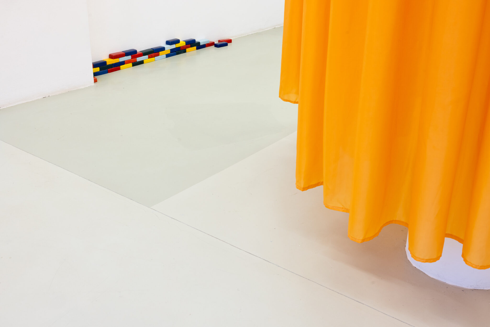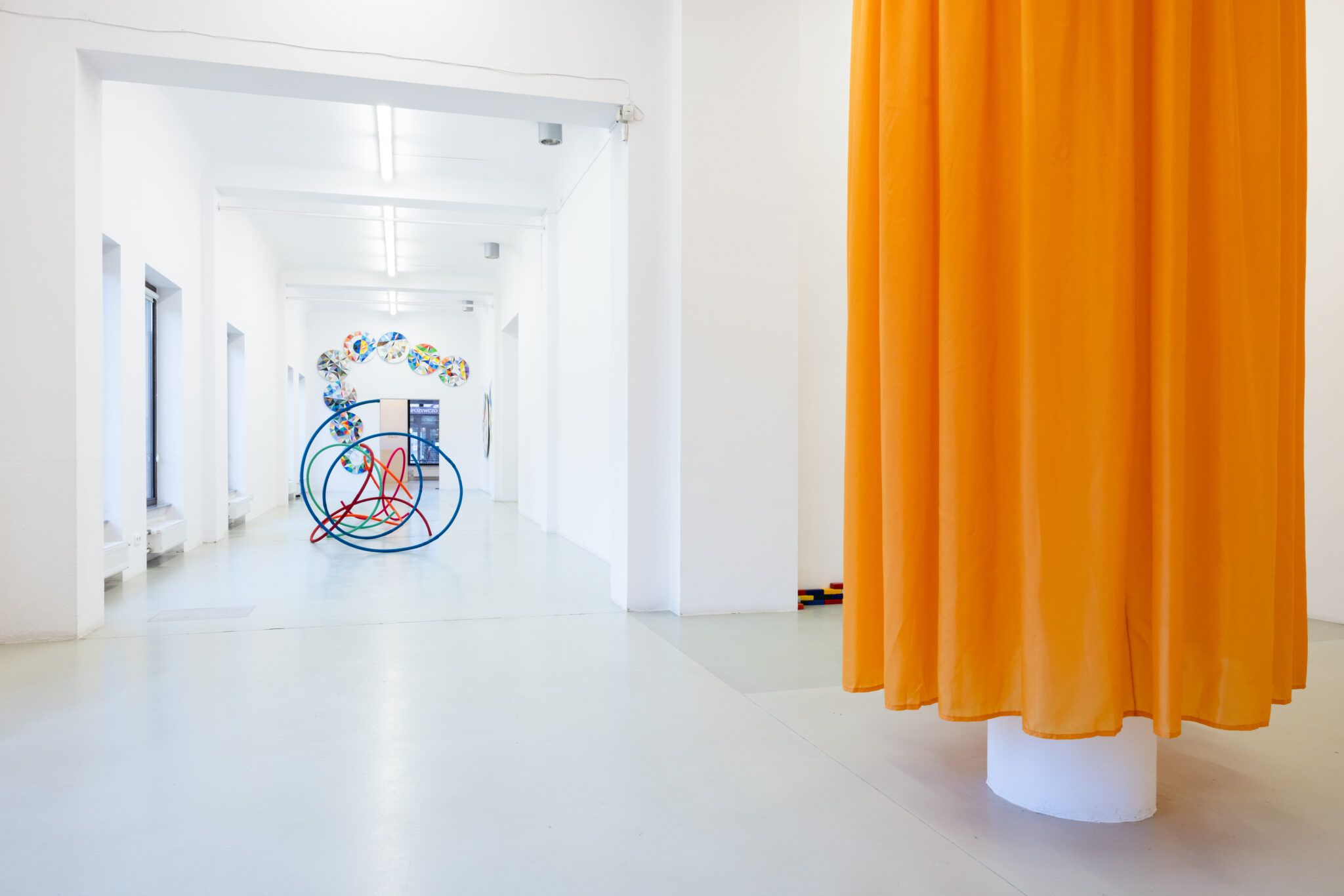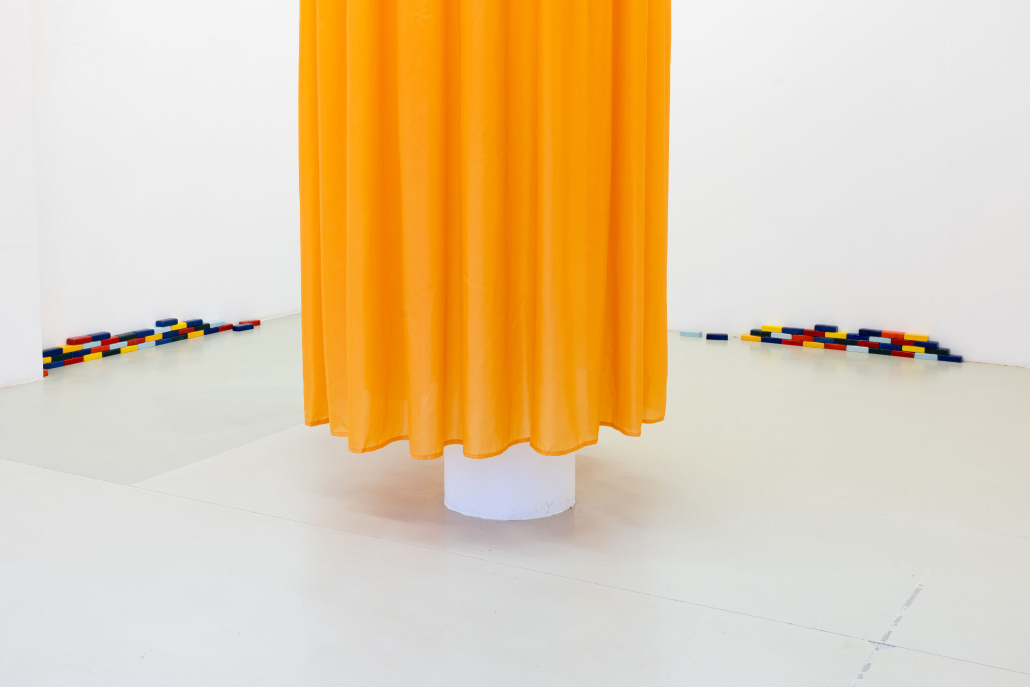 Alicja Bielawska swoje zainteresowania skupia wokół fenomenów codzienności, a jej szczegółowa obserwacja przybiera często odległe od swoich pierwowzorów uproszczone formy. Artystka posługuje się charakterystycznym językiem wizualnym, stawiając na jego wrażeniowość, a tym samym sensoryczną zdolność oddziaływania na widzki i widzów. Elementem równie istotnym jak kolor i forma, staje się dla niej zastana przestrzeń lub architektura. Bielawska zdaje się pracować głównie względem niej – znajdujący się w przestrzeni wystawienniczej filar okala tekstylną instalacją zatytułowaną O tej porze dnia nawet cienie są w kolorze (2018), a pośrodku wystawy umiejscawia zespół prac pod tytułem Uśpione trajektorie (2020), które przypominają rysunek w przestrzeni. Performatywny potencjał tego przestrzennego szkicu podkreśla sam fakt, że wobec instalacji pierwotnie wykonywane były akcje z udziałem performerek. Bielawska ponownie animuje swoją pracę, zapraszając do współpracy Danę Chmielewską, która przygotowała premierowe działanie choreograficzne dla Gdańskiej Galerii Güntera Grassa.