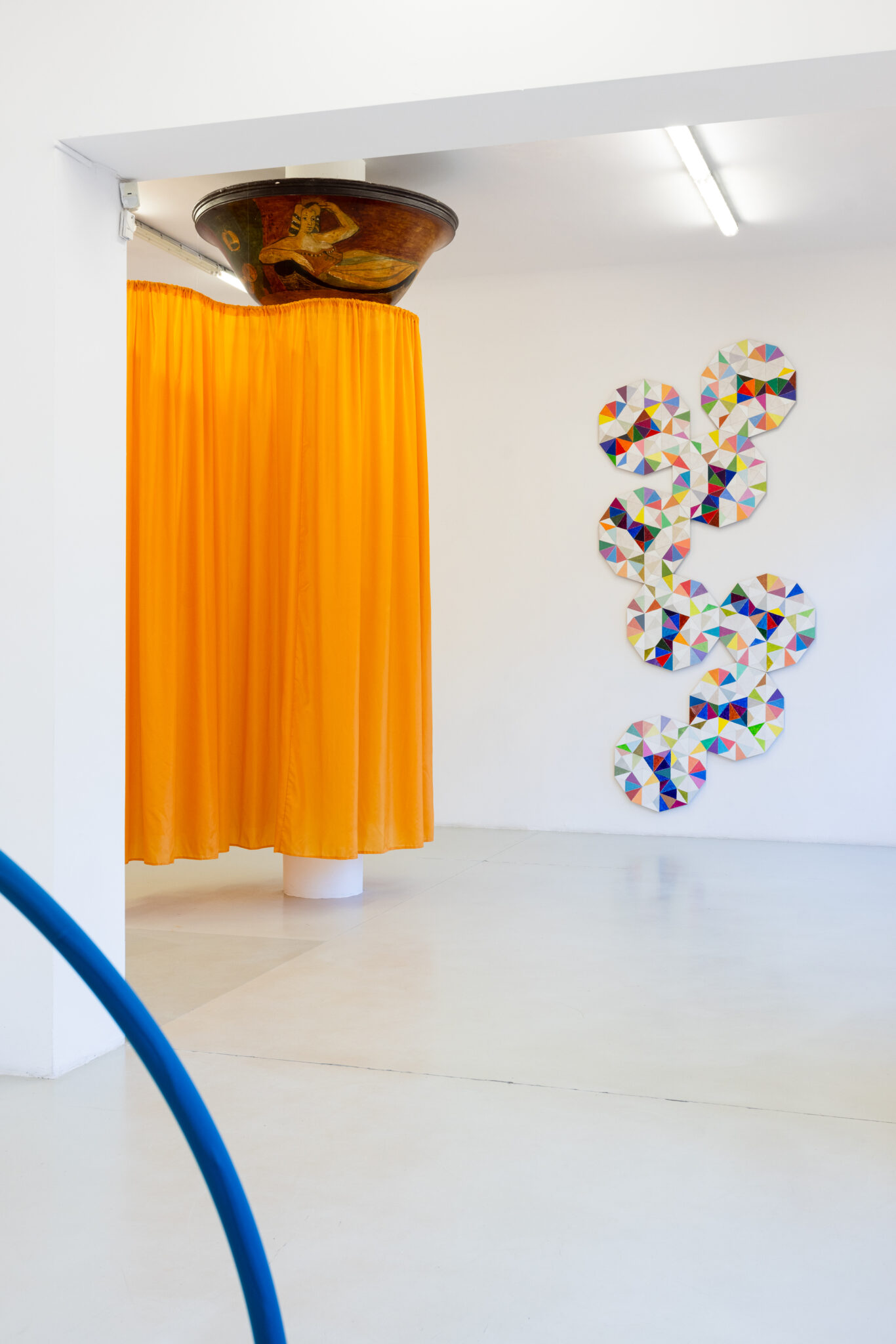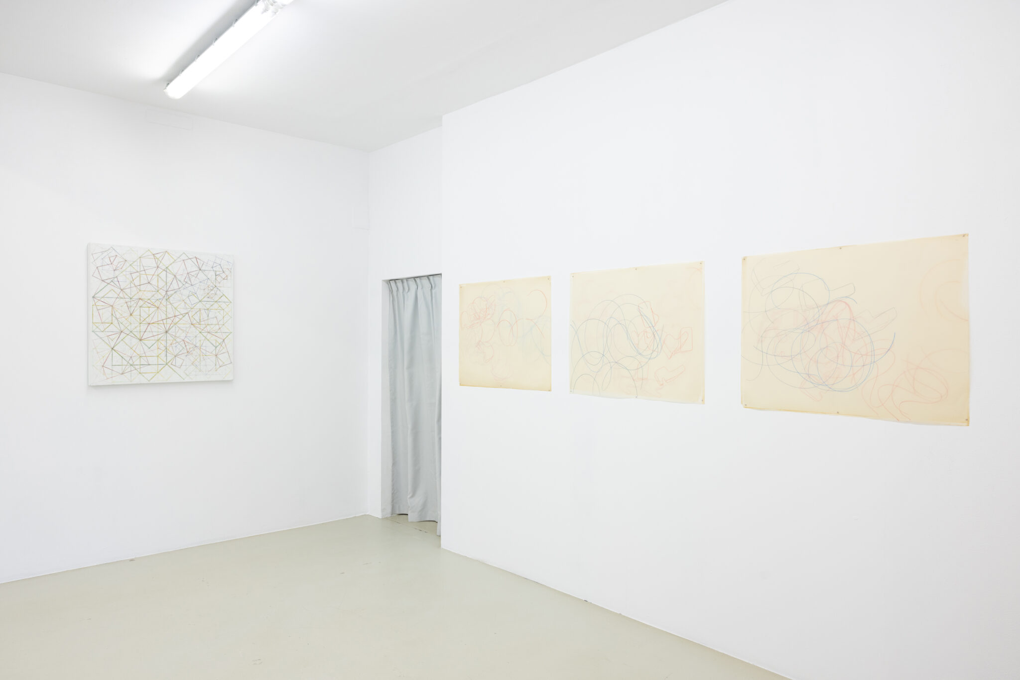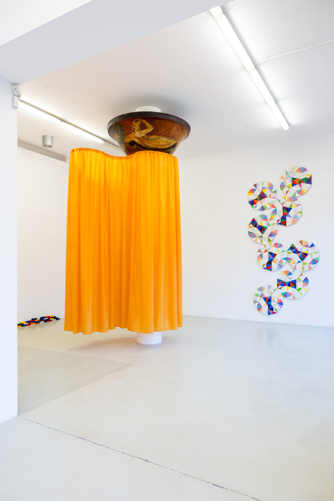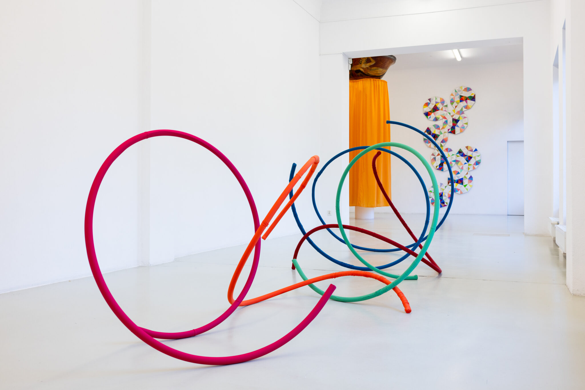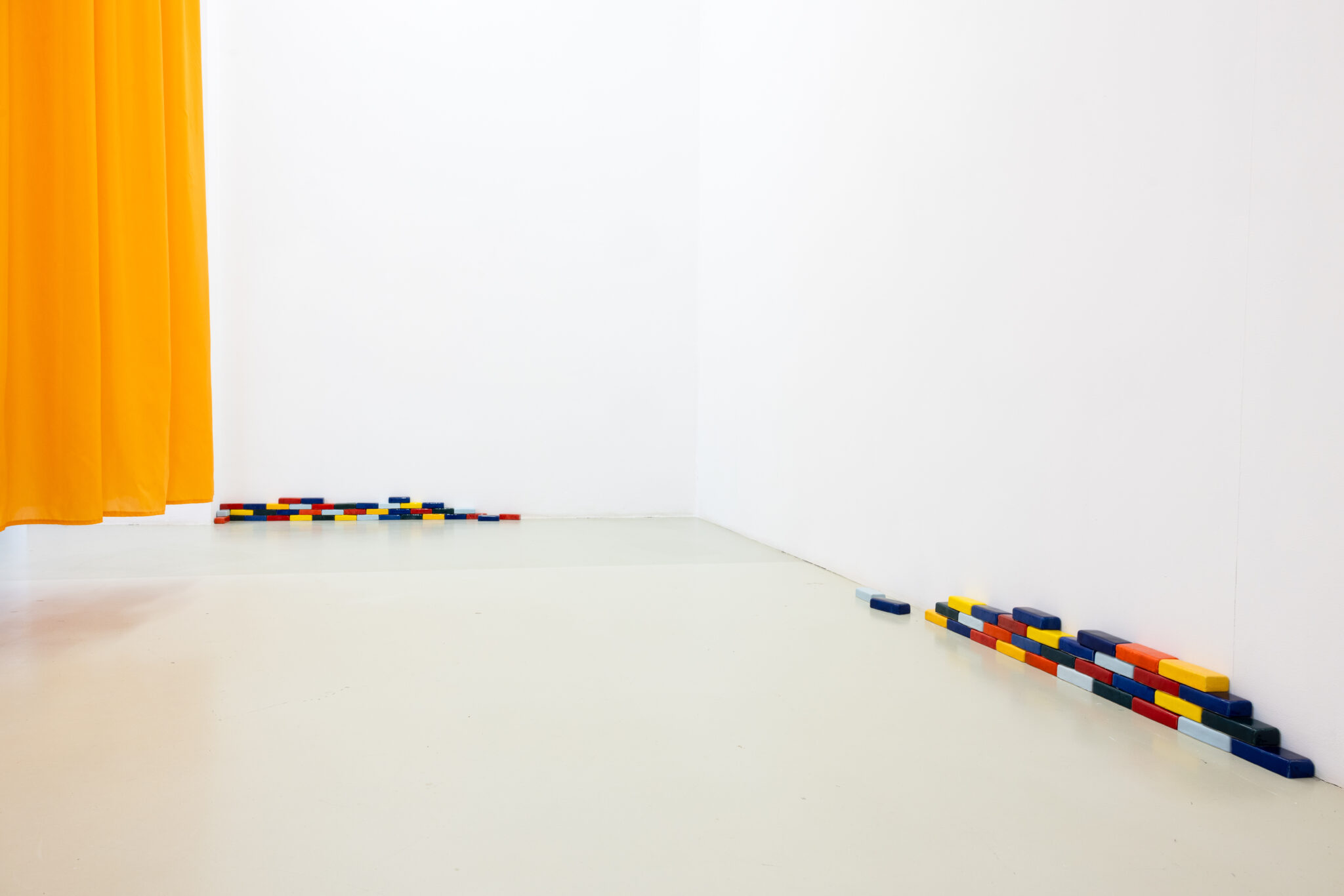Alicja Bielawska swoje zainteresowania skupia wokół fenomenów codzienności, a jej szczegółowa obserwacja przybiera często odległe od swoich pierwowzorów uproszczone formy. Artystka posługuje się charakterystycznym językiem wizualnym, stawiając na jego wrażeniowość, a tym samym sensoryczną zdolność oddziaływania na widzki i widzów. Elementem równie istotnym jak kolor i forma, staje się dla niej zastana przestrzeń lub architektura. Bielawska zdaje się pracować głównie względem niej – znajdujący się w przestrzeni wystawienniczej filar okala tekstylną instalacją zatytułowaną O tej porze dnia nawet cienie są w kolorze (2018), a pośrodku wystawy umiejscawia zespół prac pod tytułem Uśpione trajektorie (2020), które przypominają rysunek w przestrzeni. Performatywny potencjał tego przestrzennego szkicu podkreśla sam fakt, że wobec instalacji pierwotnie wykonywane były akcje z udziałem performerek. Bielawska ponownie animuje swoją pracę, zapraszając do współpracy Danę Chmielewską, która przygotowała premierowe działanie choreograficzne dla Gdańskiej Galerii Güntera Grassa.
