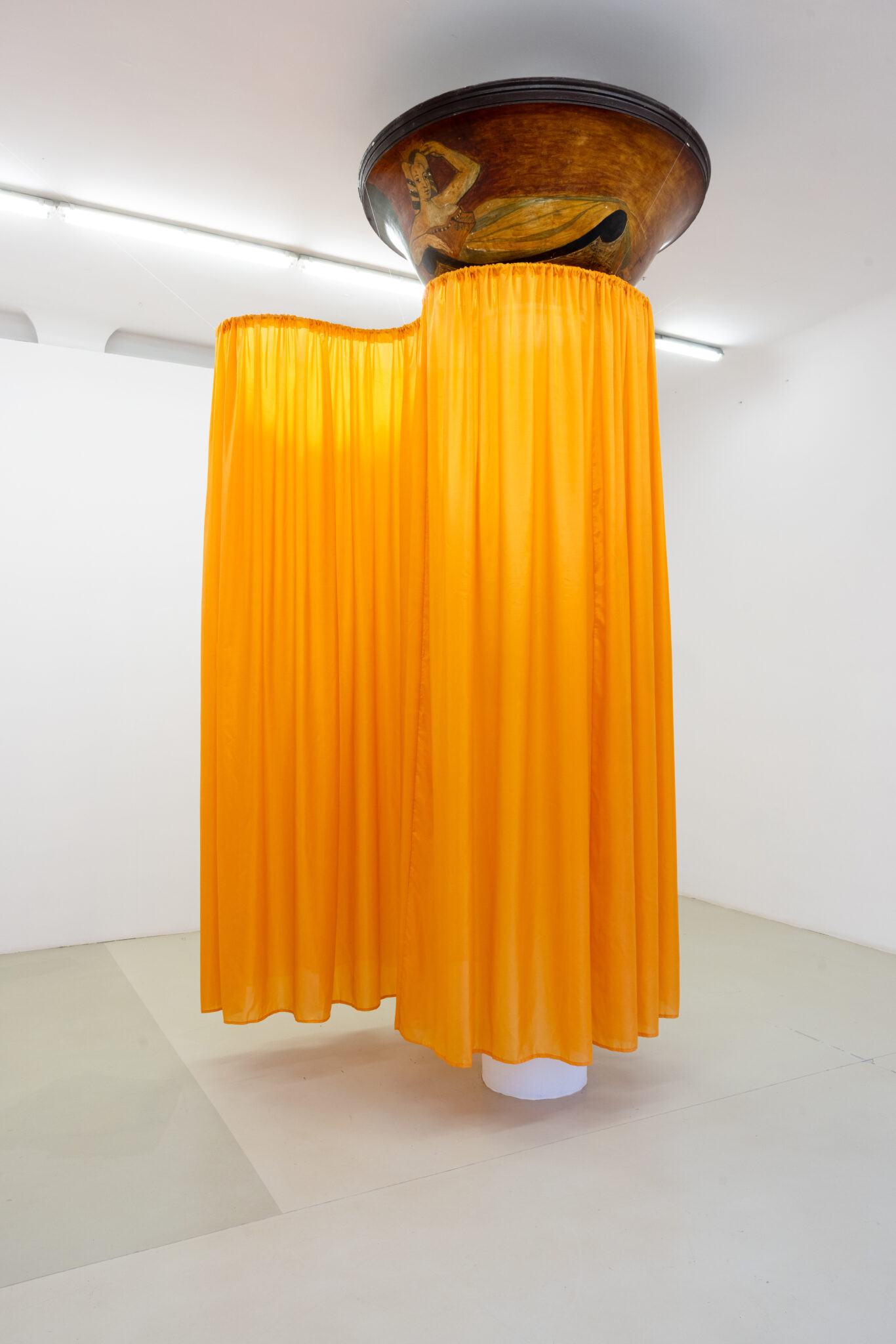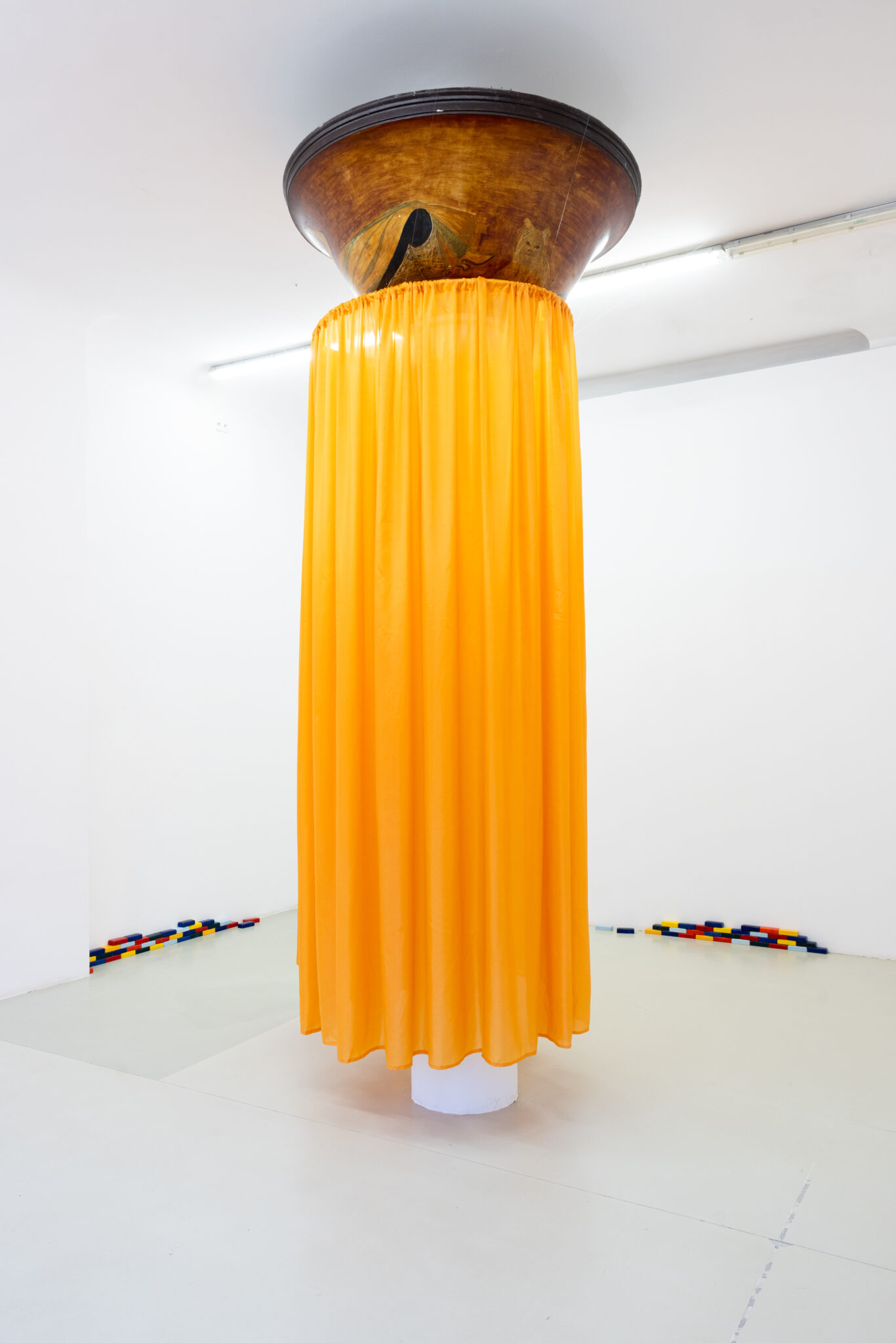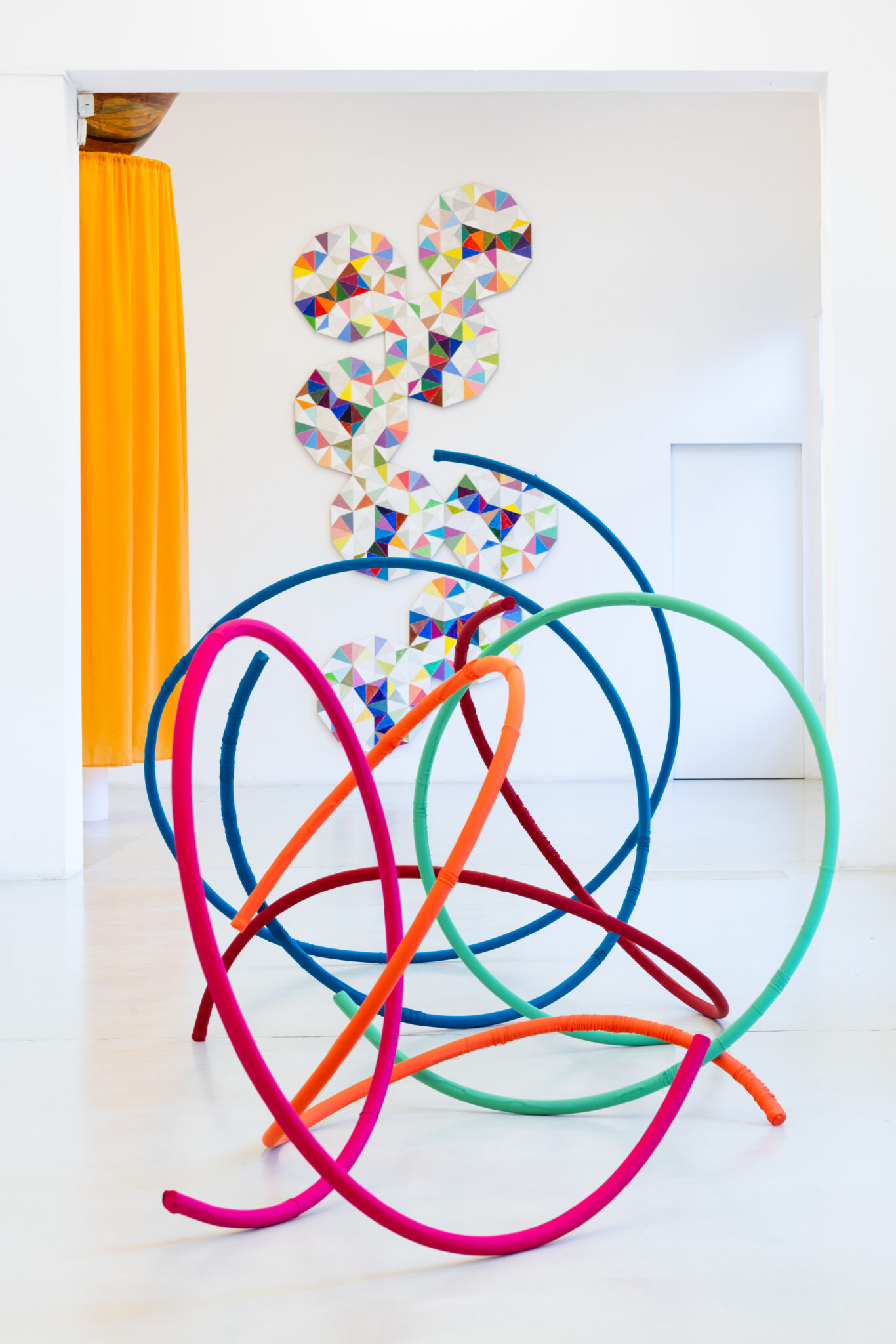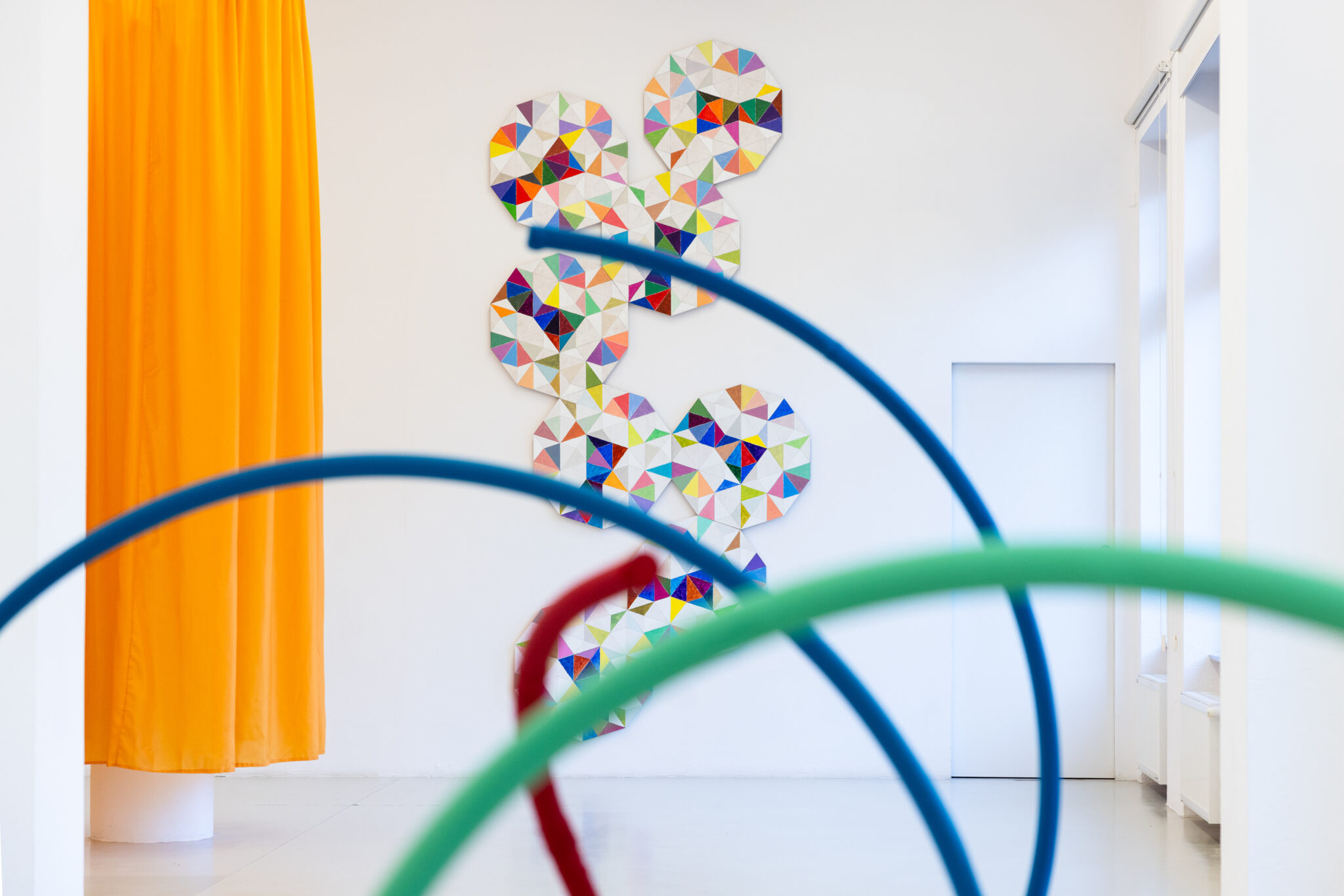 Alicja Bielawska swoje zainteresowania skupia wokół fenomenów codzienności, a jej szczegółowa obserwacja przybiera często odległe od swoich pierwowzorów uproszczone formy. Artystka posługuje się charakterystycznym językiem wizualnym, stawiając na jego wrażeniowość, a tym samym sensoryczną zdolność oddziaływania na widzki i widzów. Elementem równie istotnym jak kolor i forma, staje się dla niej zastana przestrzeń lub architektura. Bielawska zdaje się pracować głównie względem niej – znajdujący się w przestrzeni wystawienniczej filar okala tekstylną instalacją zatytułowaną O tej porze dnia nawet cienie są w kolorze (2018), a pośrodku wystawy umiejscawia zespół prac pod tytułem Uśpione trajektorie (2020), które przypominają rysunek w przestrzeni. Performatywny potencjał tego przestrzennego szkicu podkreśla sam fakt, że wobec instalacji pierwotnie wykonywane były akcje z udziałem performerek. Bielawska ponownie animuje swoją pracę, zapraszając do współpracy Danę Chmielewską, która przygotowała premierowe działanie choreograficzne dla Gdańskiej Galerii Güntera Grassa.
