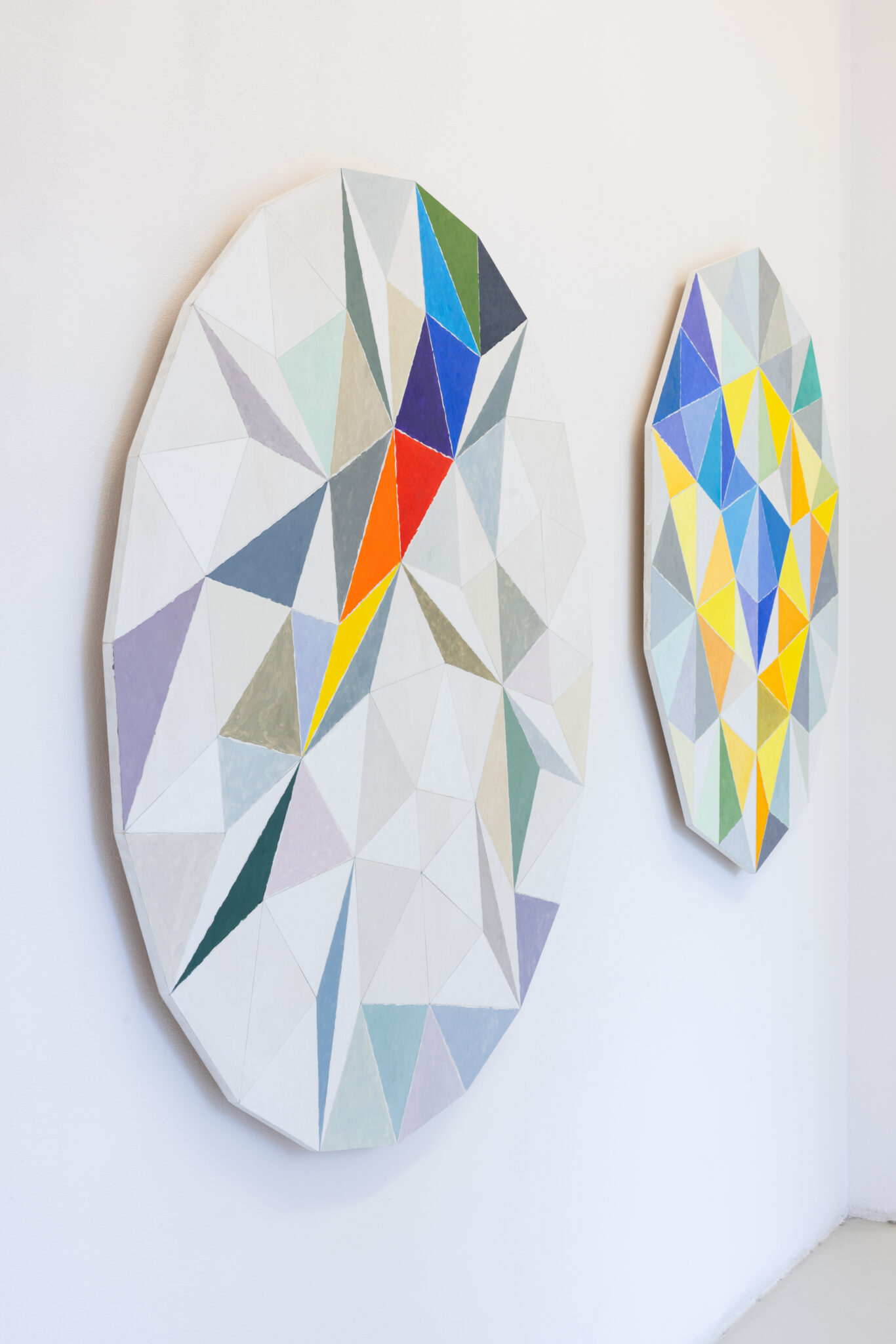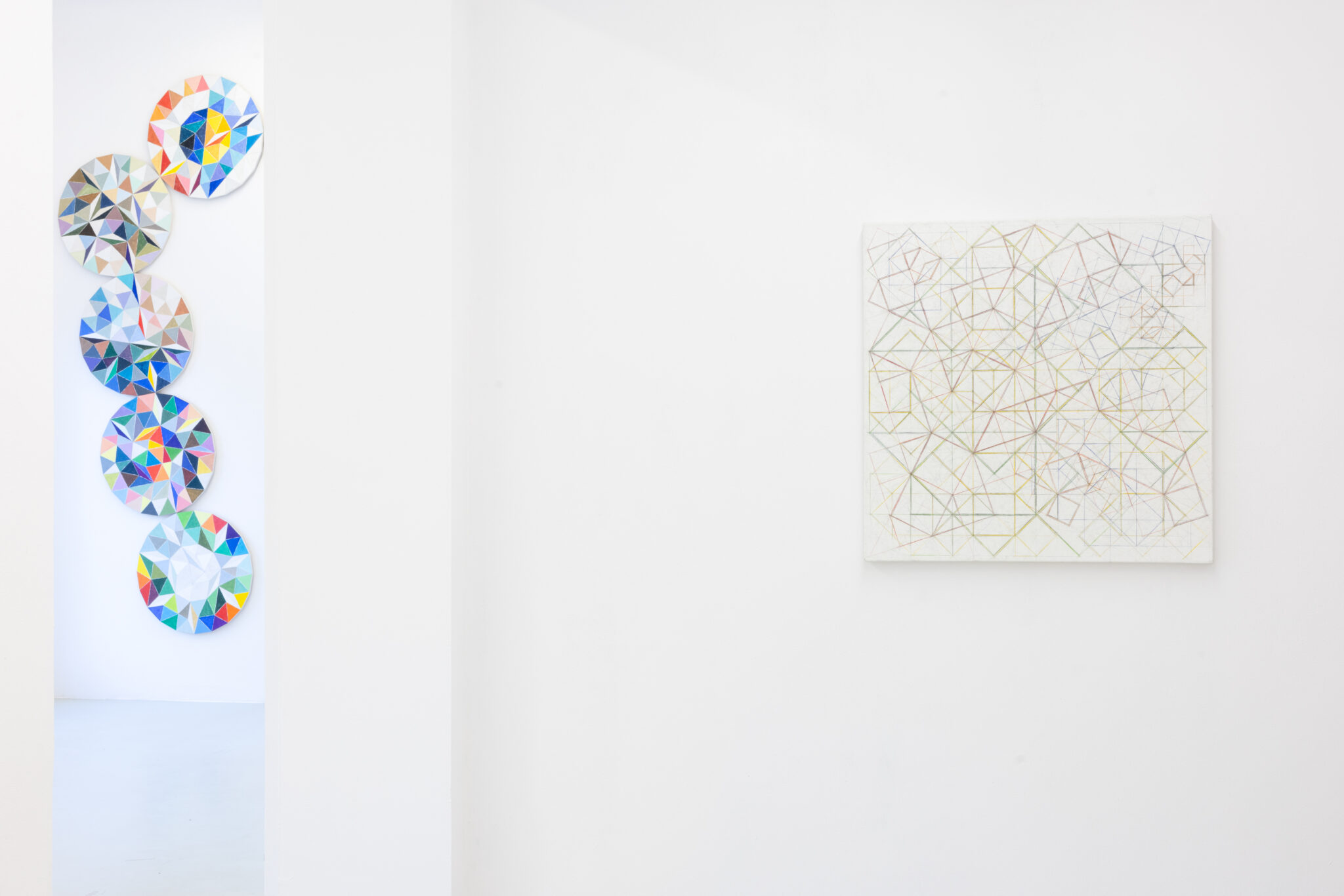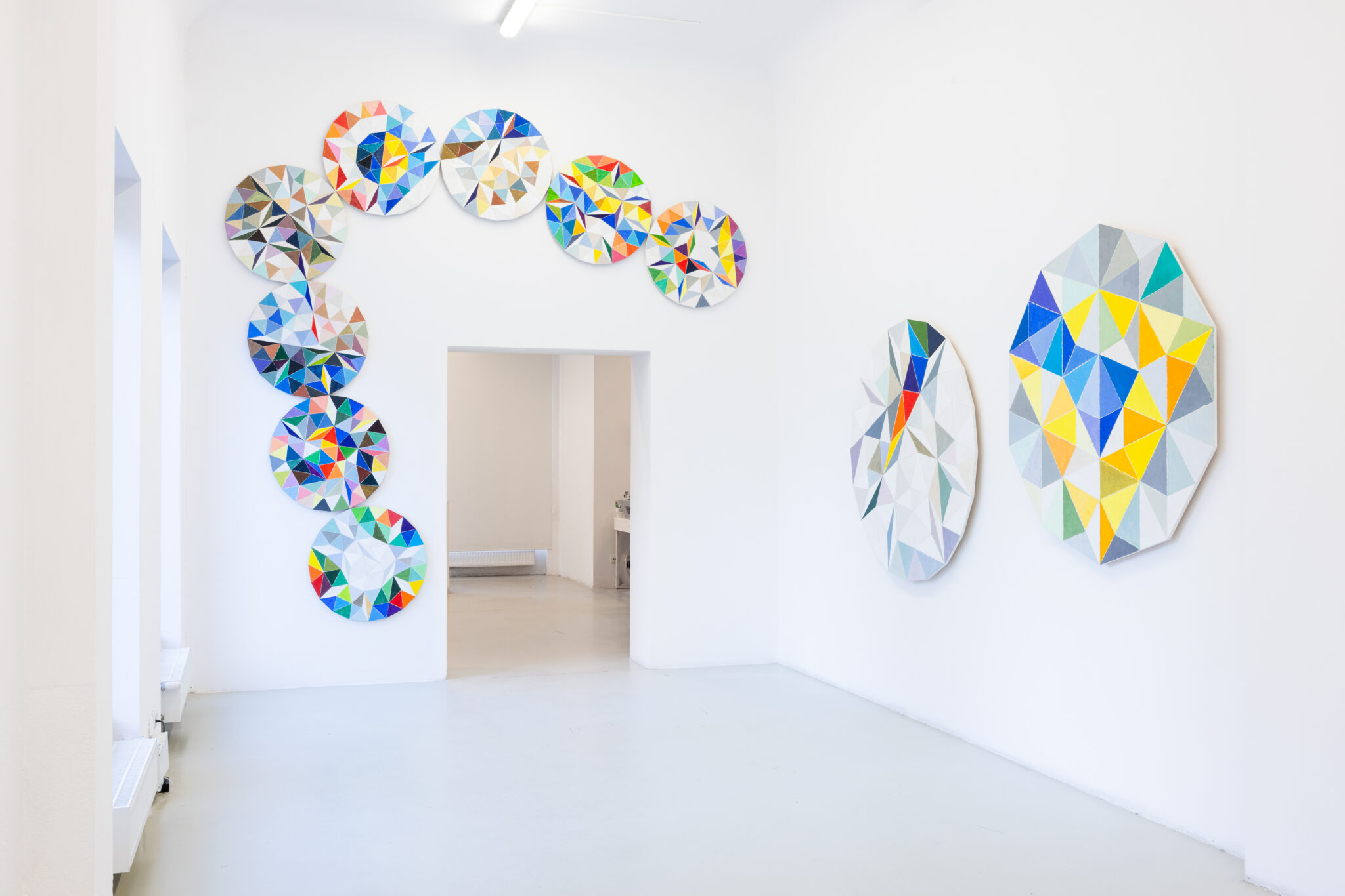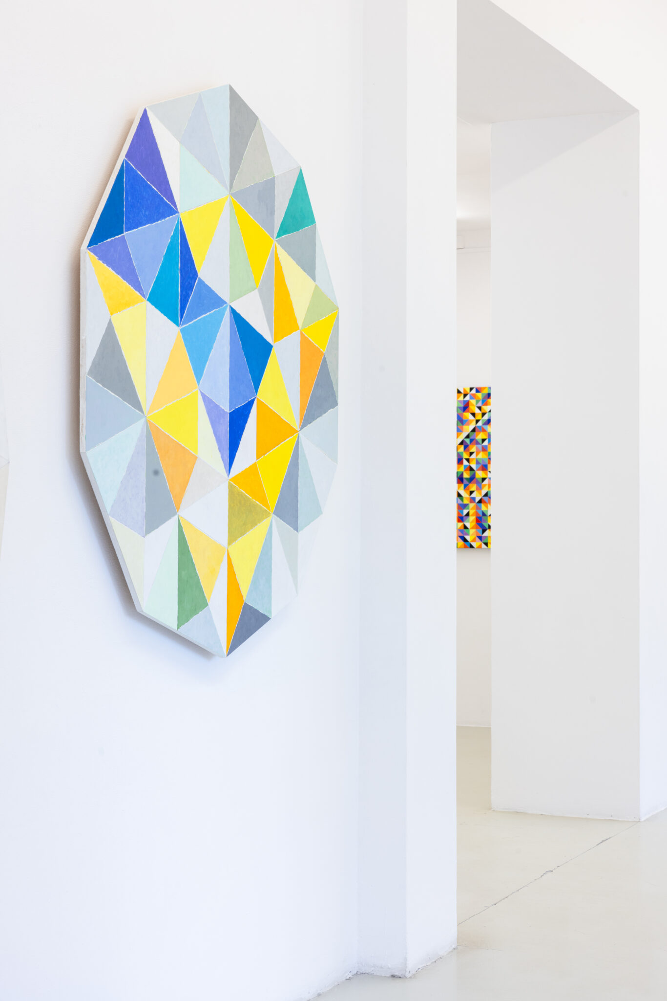 Odwrotnie zdaje się działać Krzysztof Wróblewski – obraz stanowi dla niego podstawową formę opisywania świata, a ich natłok postrzega jako zbiór otrzymywanych od otoczenia komunikatów. W prezentowanych na wystawie pracach, przygotowanych z myślą o niej, przenosi doświadczenie wzrokowe na odwzorowywanie rzeczywistości obrazem. Jednak nie jest zainteresowany realistyczną narracją wizualną, za punkt wyjścia obiera nauki ścisłe, które niczym zaciekły badacz poddaje nagięciom, przenosi na pole sztuk wizualnych i rozwija o własne rozwiązania kompozycyjne. Widzenie przestrzeni przekłada na sekwencje geometrycznych figur – uzyskiwane w ten sposób wzory zamyka w matematycznych strukturach i permutacjach, odnosząc się do wzorów stworzonych przez Rogera Penrose’a. Przybierają one modułowe reliefowe formy budowane z kombinacji dziesięcio i dwudziestoboków. Najnowsze dzieła artysty to nie tylko kontynuacja jego własnej praktyki, ale odpowiedź na propozycje Alicji Bielawskiej. W swoje prace wpisuje fragmentaryczność i ograniczenia naszej percepcji, przywołując na myśl słowa wspomnianego już Pereca: „Przestrzeń jest tym, co zatrzymuje nasz wzrok, o co się on potyka: przeszkodą, cegłą, kątem, znikającym punktem. Przestrzeń jest wtedy, gdy tworzy kąt, gdy się zatrzymuje, gdy musimy się obrócić, by znów ruszyła. Nie ma w niej nic ektoplazmatycznego; ma krawędzie, nie rozchodzi się we wszystkich kierunkach, robi wszystko, co trzeba, by linie kolejowe spotykały się na długo przed nieskończonością”[2].