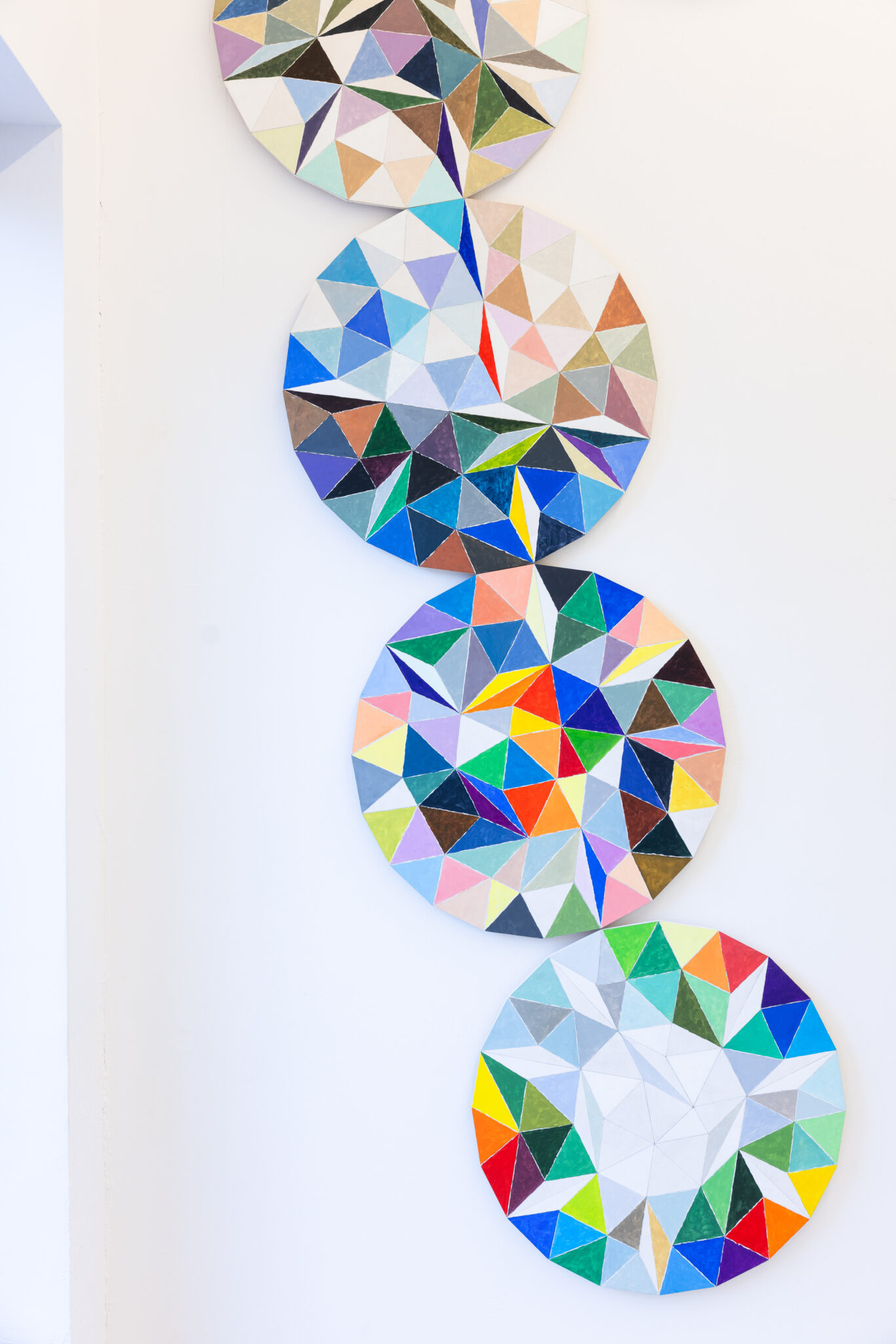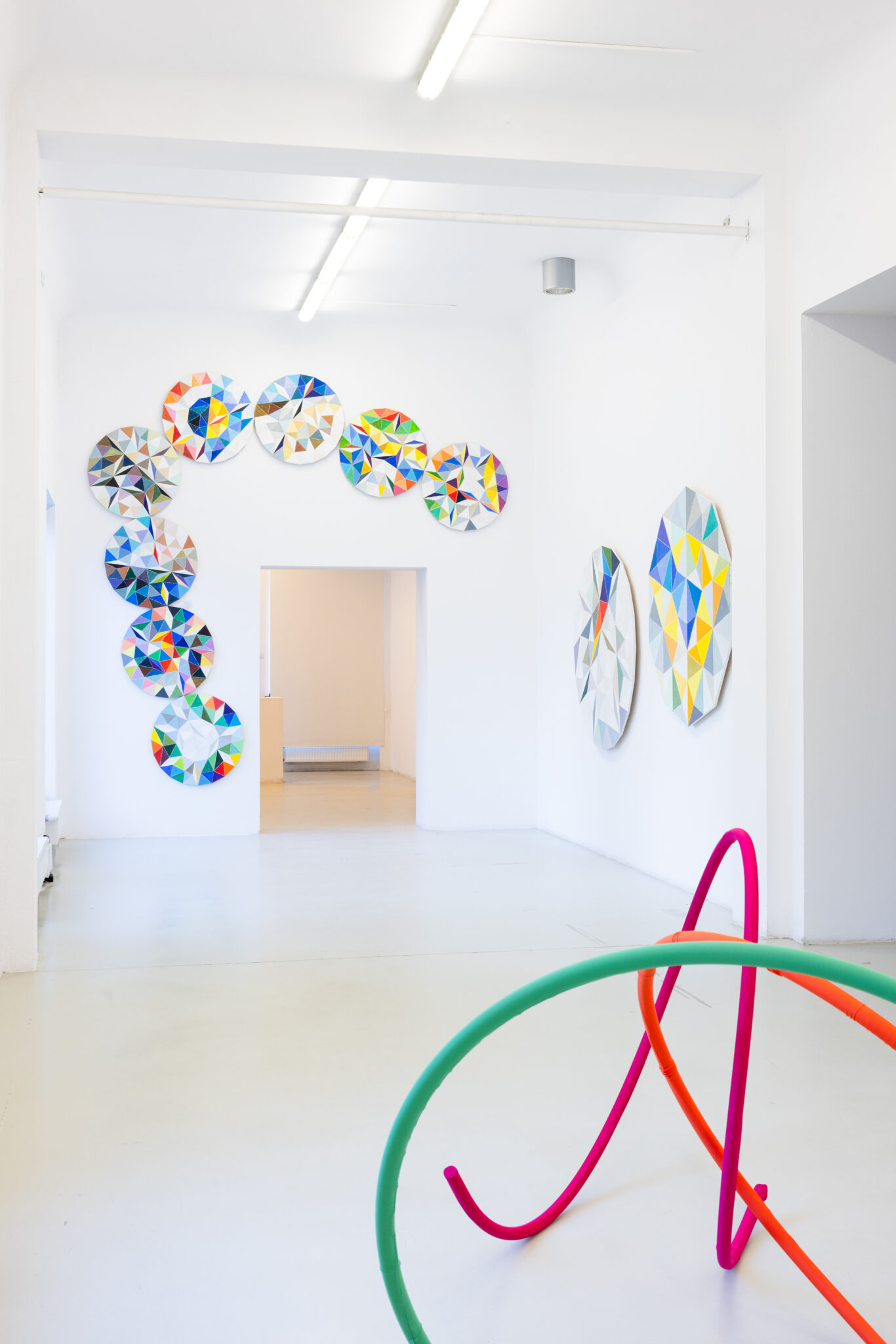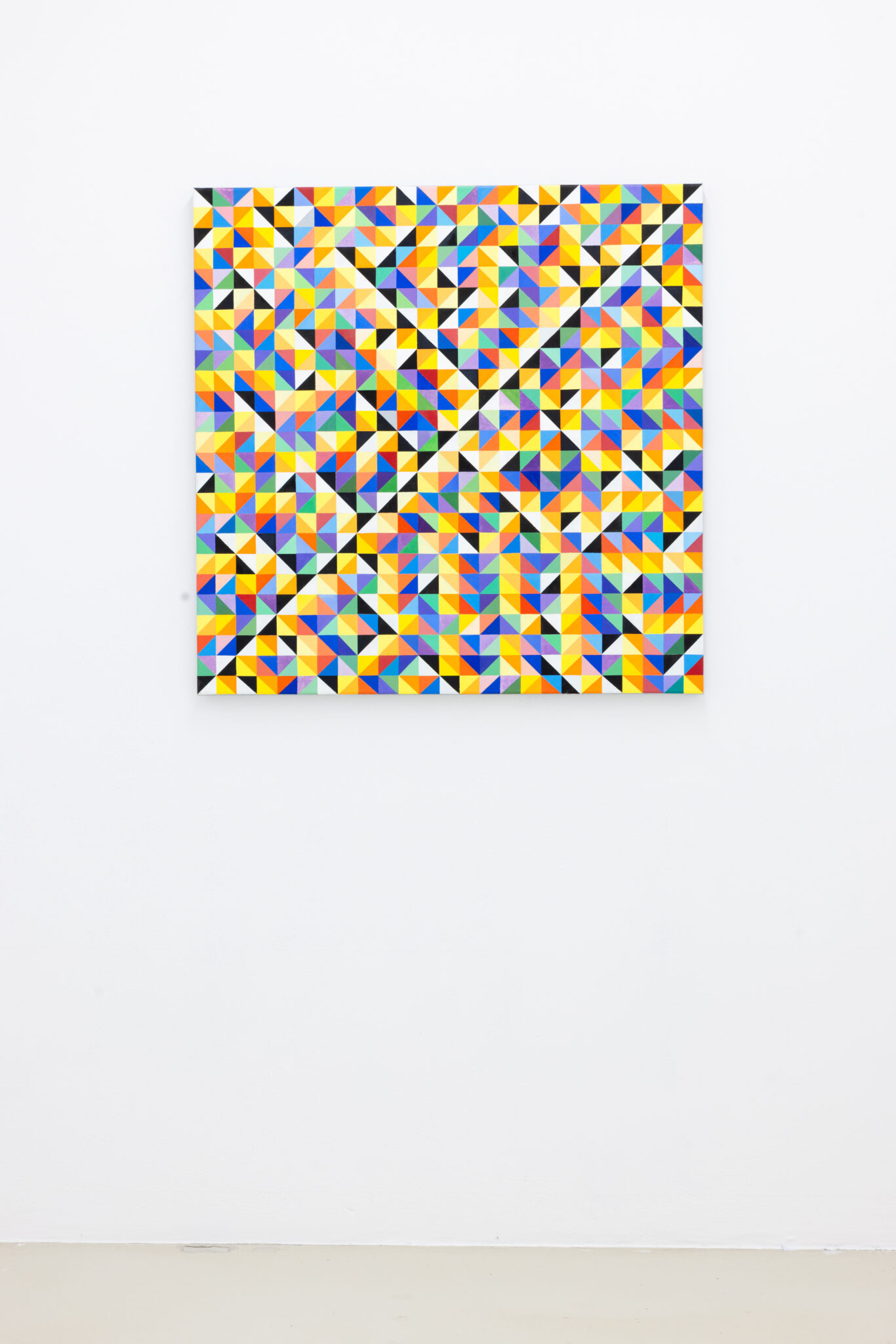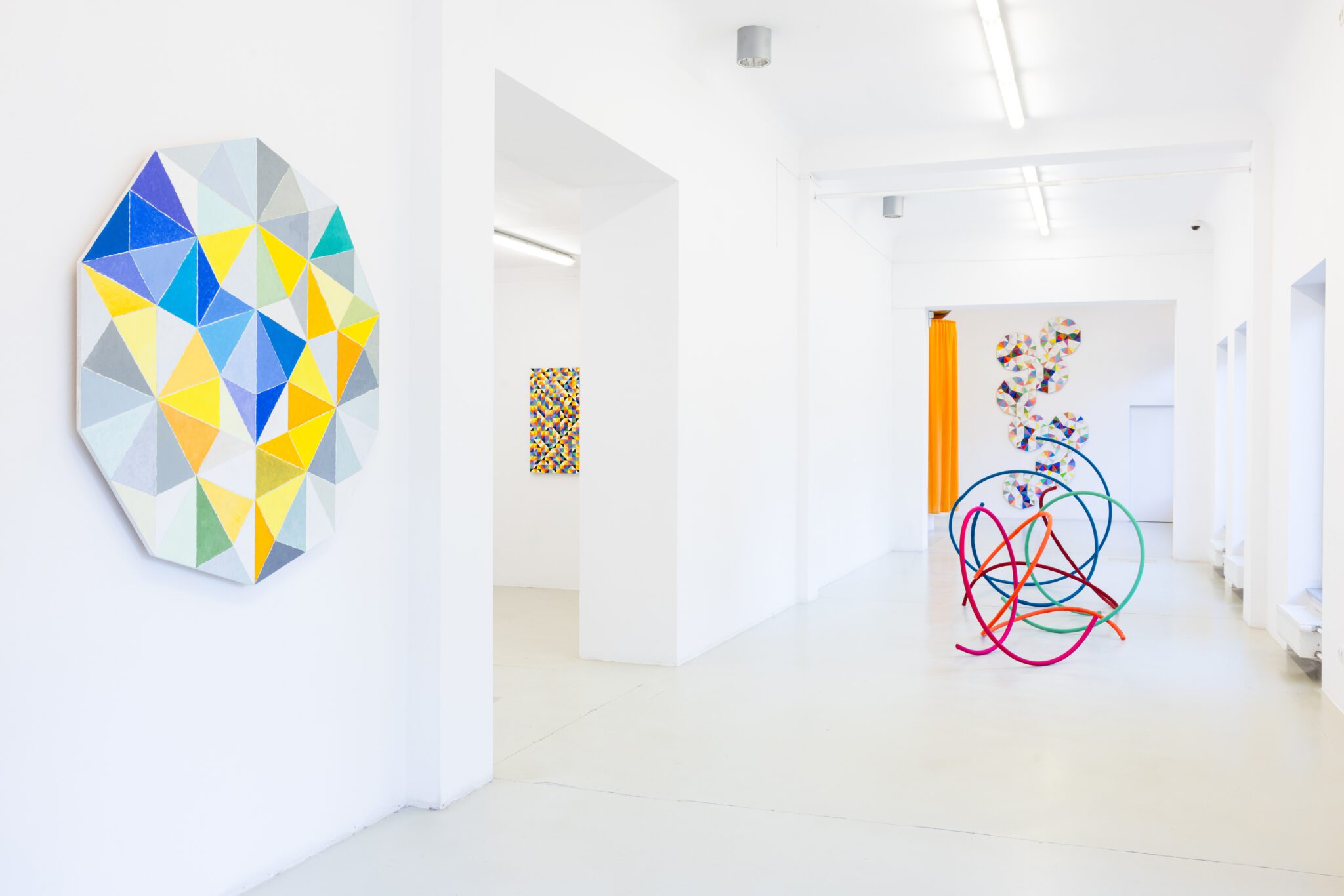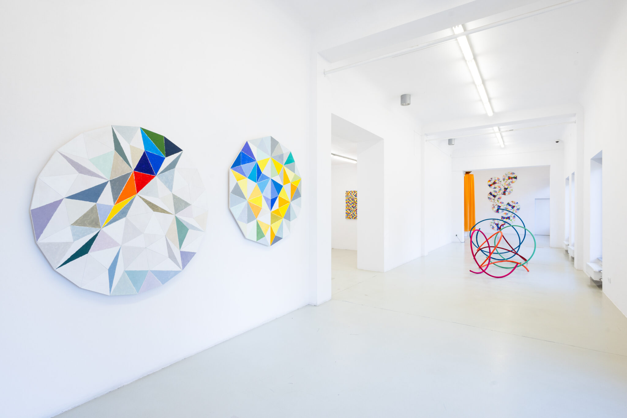Odwrotnie zdaje się działać Krzysztof Wróblewski – obraz stanowi dla niego podstawową formę opisywania świata, a ich natłok postrzega jako zbiór otrzymywanych od otoczenia komunikatów. W prezentowanych na wystawie pracach, przygotowanych z myślą o niej, przenosi doświadczenie wzrokowe na odwzorowywanie rzeczywistości obrazem. Jednak nie jest zainteresowany realistyczną narracją wizualną, za punkt wyjścia obiera nauki ścisłe, które niczym zaciekły badacz poddaje nagięciom, przenosi na pole sztuk wizualnych i rozwija o własne rozwiązania kompozycyjne. Widzenie przestrzeni przekłada na sekwencje geometrycznych figur – uzyskiwane w ten sposób wzory zamyka w matematycznych strukturach i permutacjach, odnosząc się do wzorów stworzonych przez Rogera Penrose’a. Przybierają one modułowe reliefowe formy budowane z kombinacji dziesięcio i dwudziestoboków. Najnowsze dzieła artysty to nie tylko kontynuacja jego własnej praktyki, ale odpowiedź na propozycje Alicji Bielawskiej. W swoje prace wpisuje fragmentaryczność i ograniczenia naszej percepcji, przywołując na myśl słowa wspomnianego już Pereca: „Przestrzeń jest tym, co zatrzymuje nasz wzrok, o co się on potyka: przeszkodą, cegłą, kątem, znikającym punktem. Przestrzeń jest wtedy, gdy tworzy kąt, gdy się zatrzymuje, gdy musimy się obrócić, by znów ruszyła. Nie ma w niej nic ektoplazmatycznego; ma krawędzie, nie rozchodzi się we wszystkich kierunkach, robi wszystko, co trzeba, by linie kolejowe spotykały się na długo przed nieskończonością”[2].