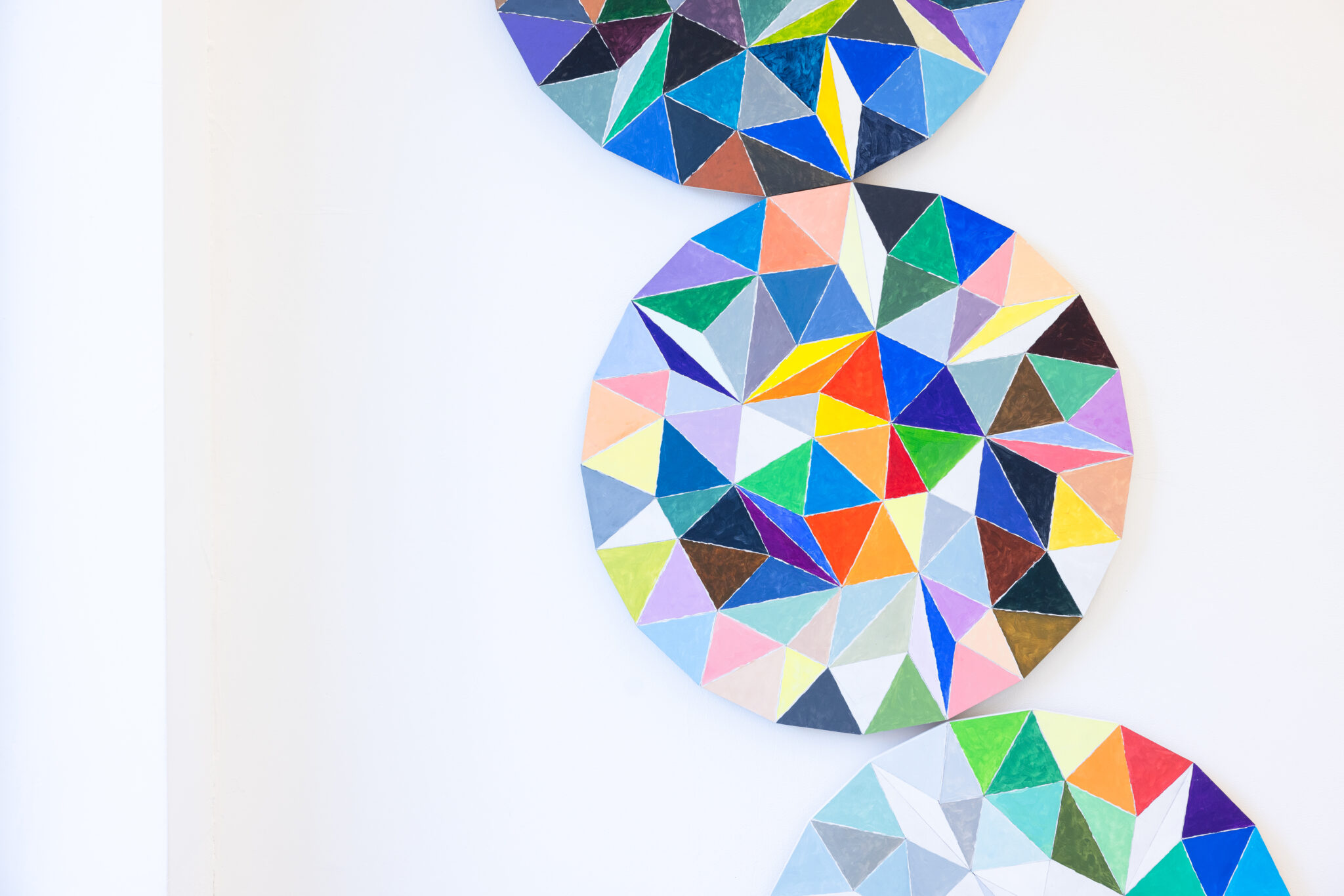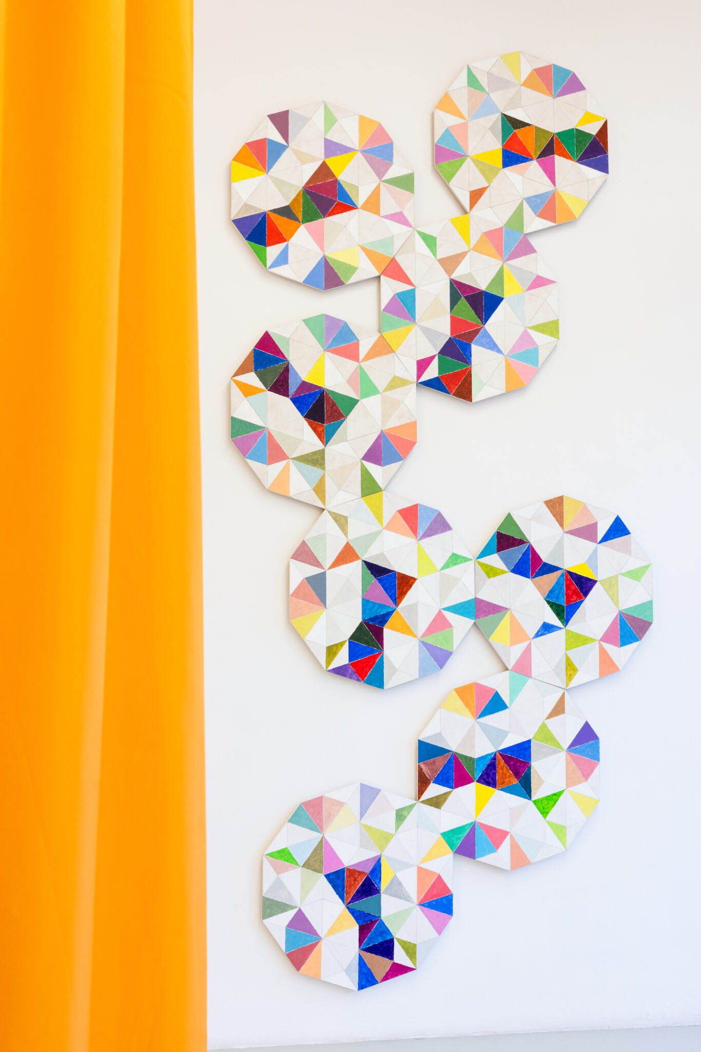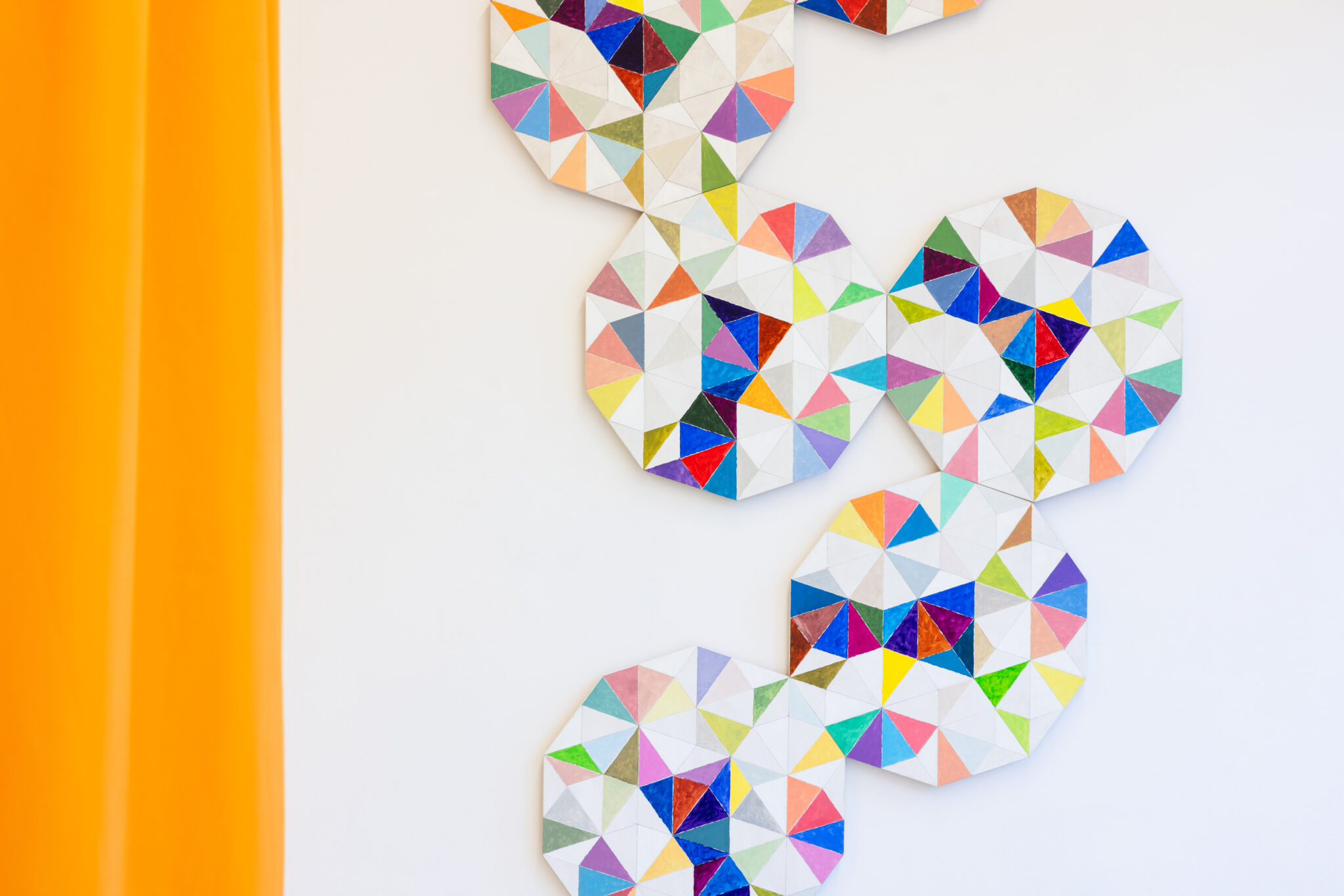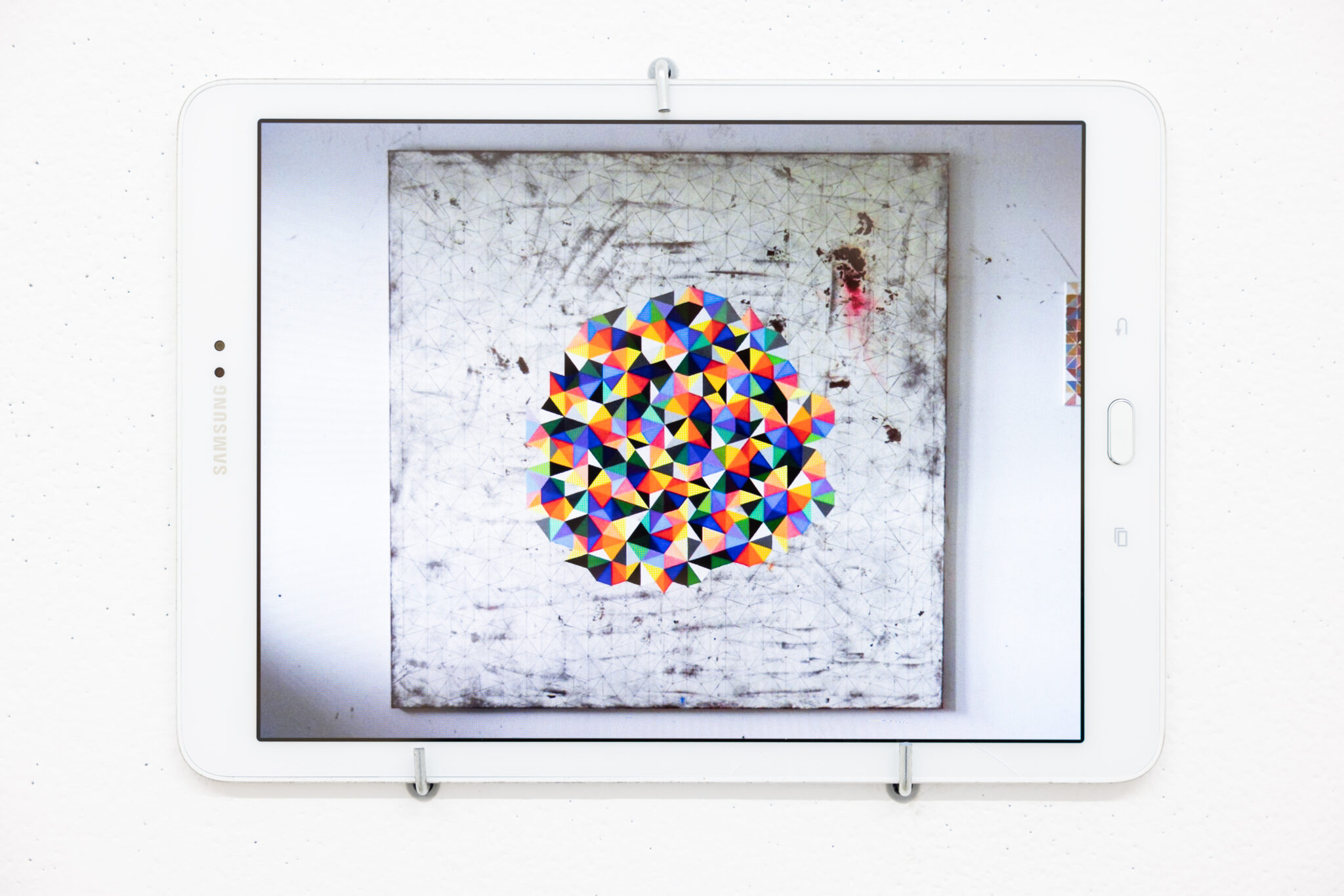 Odwrotnie zdaje się działać Krzysztof Wróblewski – obraz stanowi dla niego podstawową formę opisywania świata, a ich natłok postrzega jako zbiór otrzymywanych od otoczenia komunikatów. W prezentowanych na wystawie pracach, przygotowanych z myślą o niej, przenosi doświadczenie wzrokowe na odwzorowywanie rzeczywistości obrazem. Jednak nie jest zainteresowany realistyczną narracją wizualną, za punkt wyjścia obiera nauki ścisłe, które niczym zaciekły badacz poddaje nagięciom, przenosi na pole sztuk wizualnych i rozwija o własne rozwiązania kompozycyjne. Widzenie przestrzeni przekłada na sekwencje geometrycznych figur – uzyskiwane w ten sposób wzory zamyka w matematycznych strukturach i permutacjach, odnosząc się do wzorów stworzonych przez Rogera Penrose’a. Przybierają one modułowe reliefowe formy budowane z kombinacji dziesięcio i dwudziestoboków. Najnowsze dzieła artysty to nie tylko kontynuacja jego własnej praktyki, ale odpowiedź na propozycje Alicji Bielawskiej. W swoje prace wpisuje fragmentaryczność i ograniczenia naszej percepcji, przywołując na myśl słowa wspomnianego już Pereca: „Przestrzeń jest tym, co zatrzymuje nasz wzrok, o co się on potyka: przeszkodą, cegłą, kątem, znikającym punktem. Przestrzeń jest wtedy, gdy tworzy kąt, gdy się zatrzymuje, gdy musimy się obrócić, by znów ruszyła. Nie ma w niej nic ektoplazmatycznego; ma krawędzie, nie rozchodzi się we wszystkich kierunkach, robi wszystko, co trzeba, by linie kolejowe spotykały się na długo przed nieskończonością”[2].