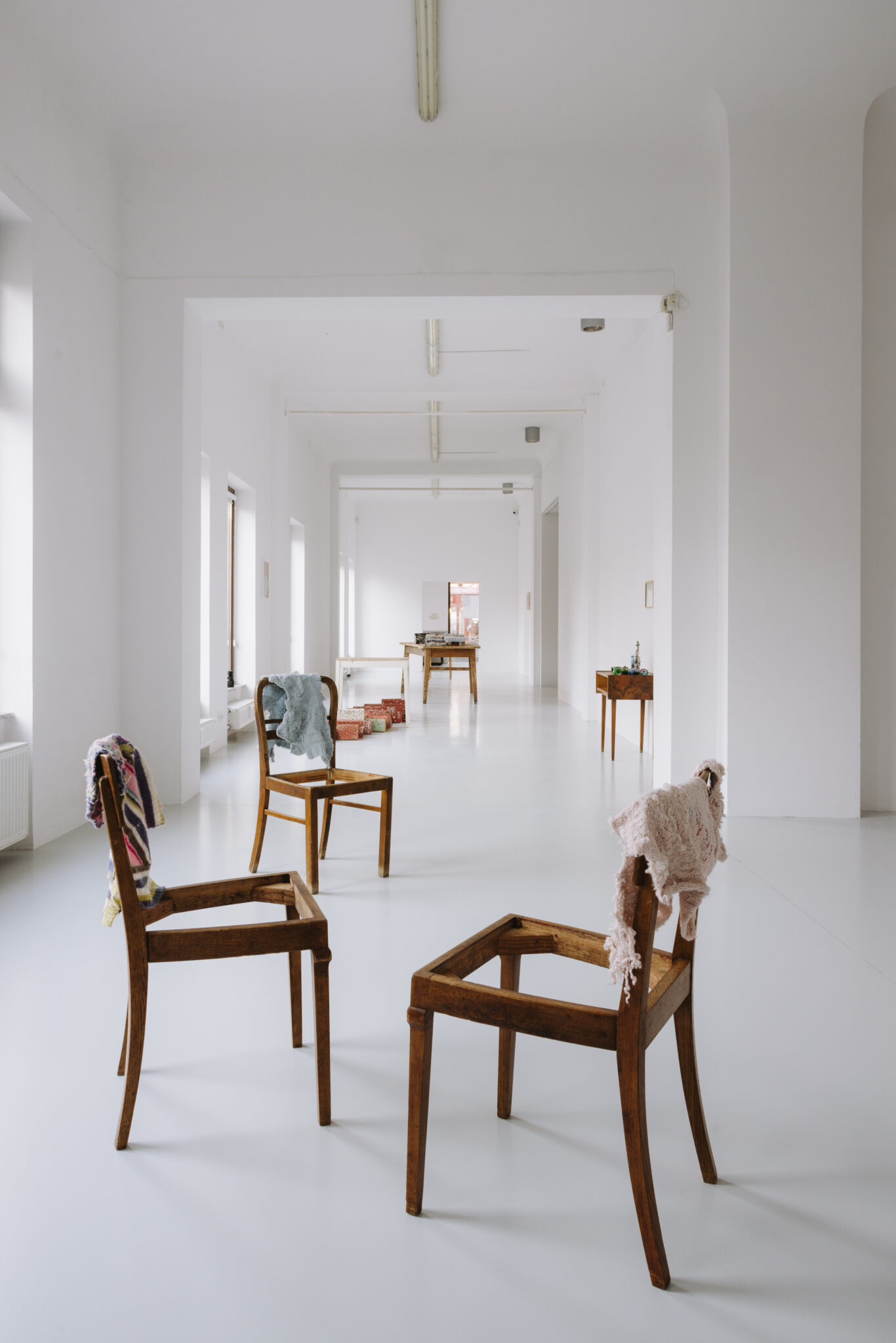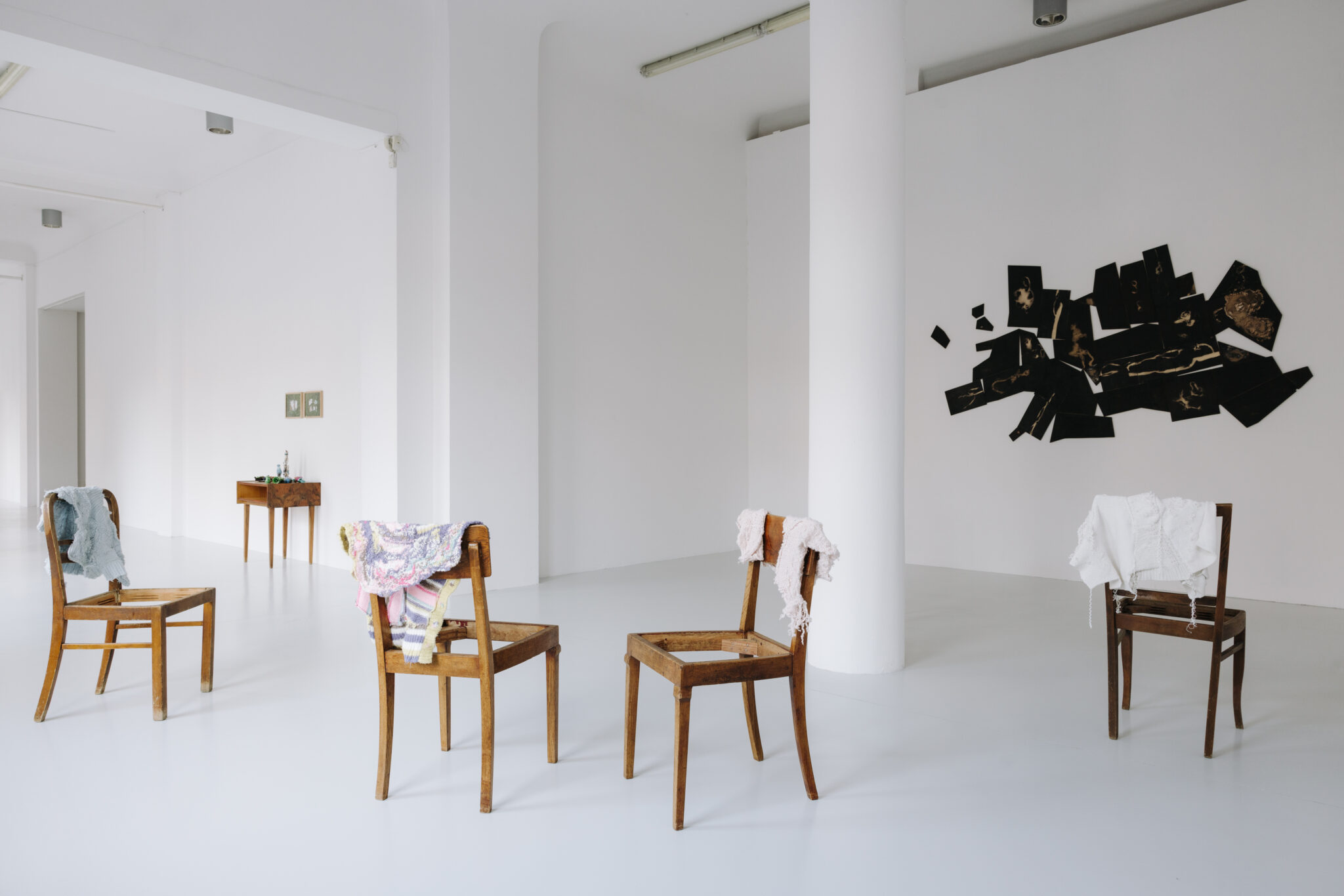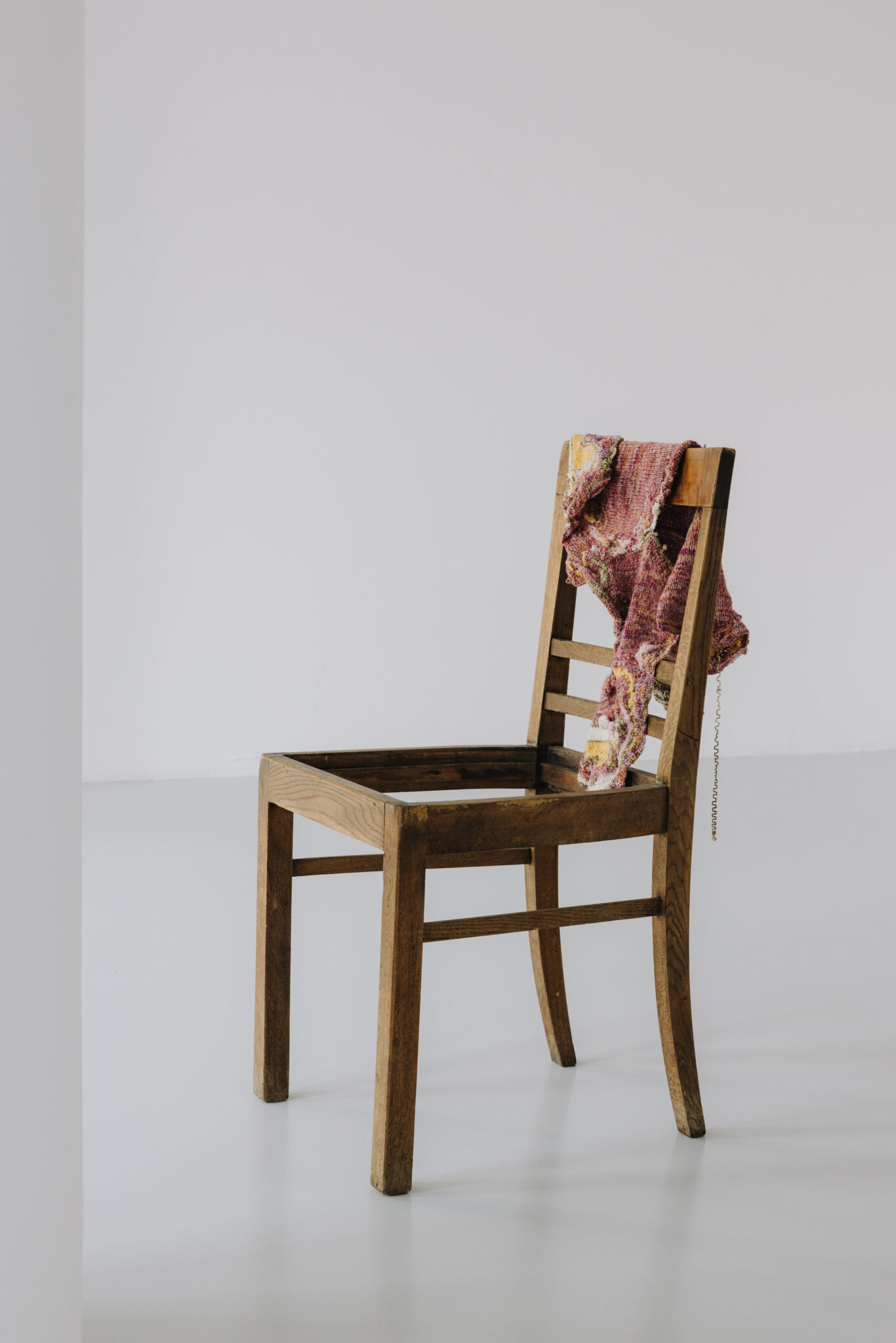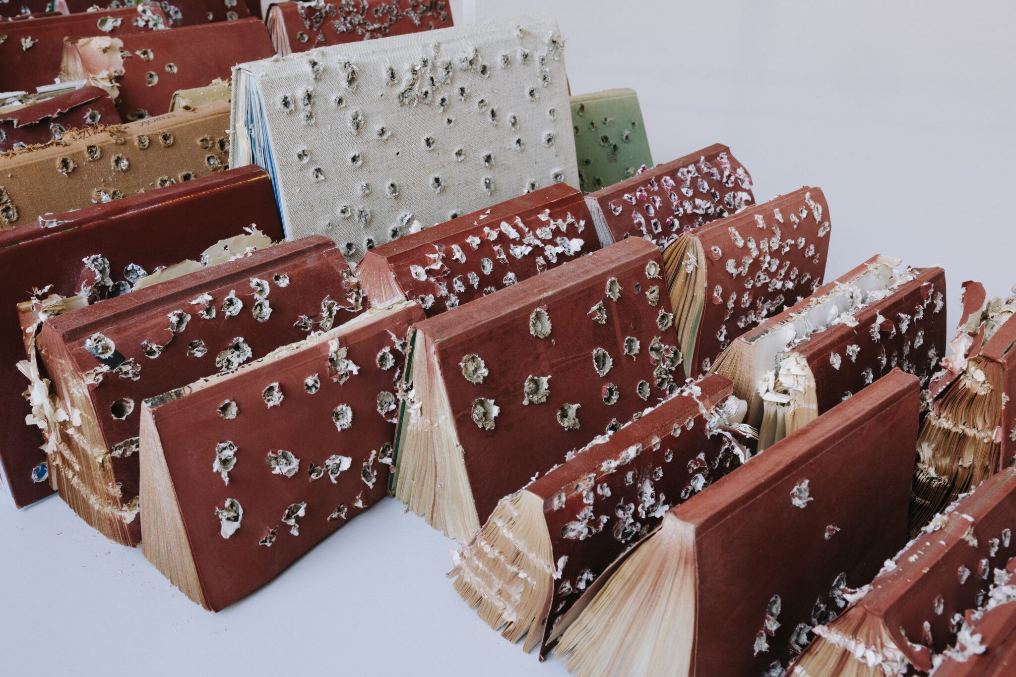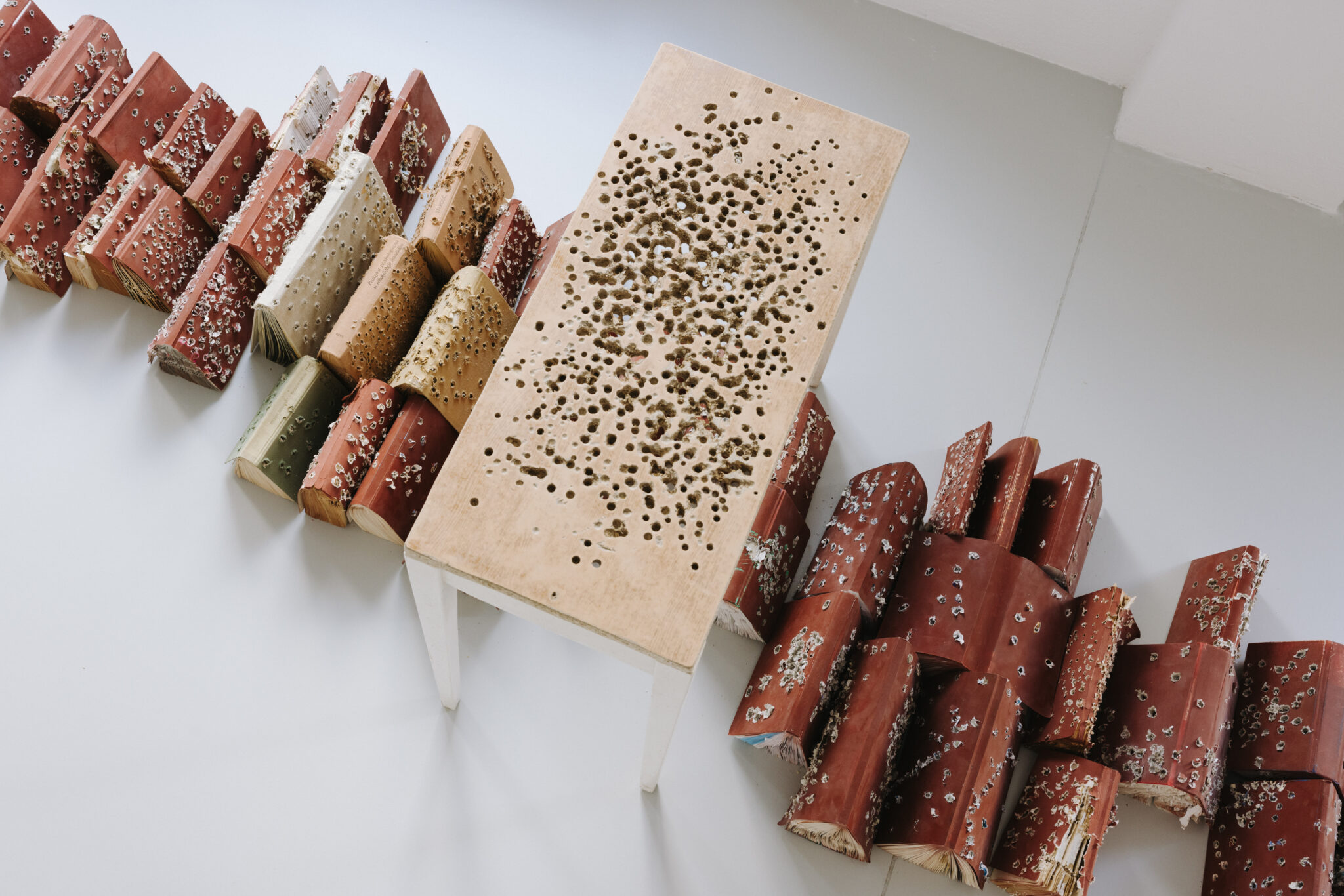Artystka sytuuje swoje najnowsze prace gdzieś pomiędzy materią a gestem destrukcji. W tym „pomiędzy” odsłania przestrzeń, którą można odczytywać jako miejsce prowizoryczne, kruche, ale konieczne – schron. Pozornie zniszczone meble, książki, notesy, choć naruszone, wciąż istnieją; ich perforacja nie jest jedynie destrukcją czy dekoracja, lecz także gestem ukrywania. To, co miało być zapisane, zostaje zasłonięte, a znikanie staje się formą ochrony: treści nie są już dostępne, nie mogą zostać przechwycone, użyte, ocenione.