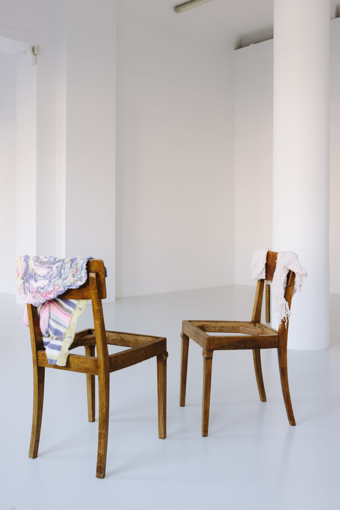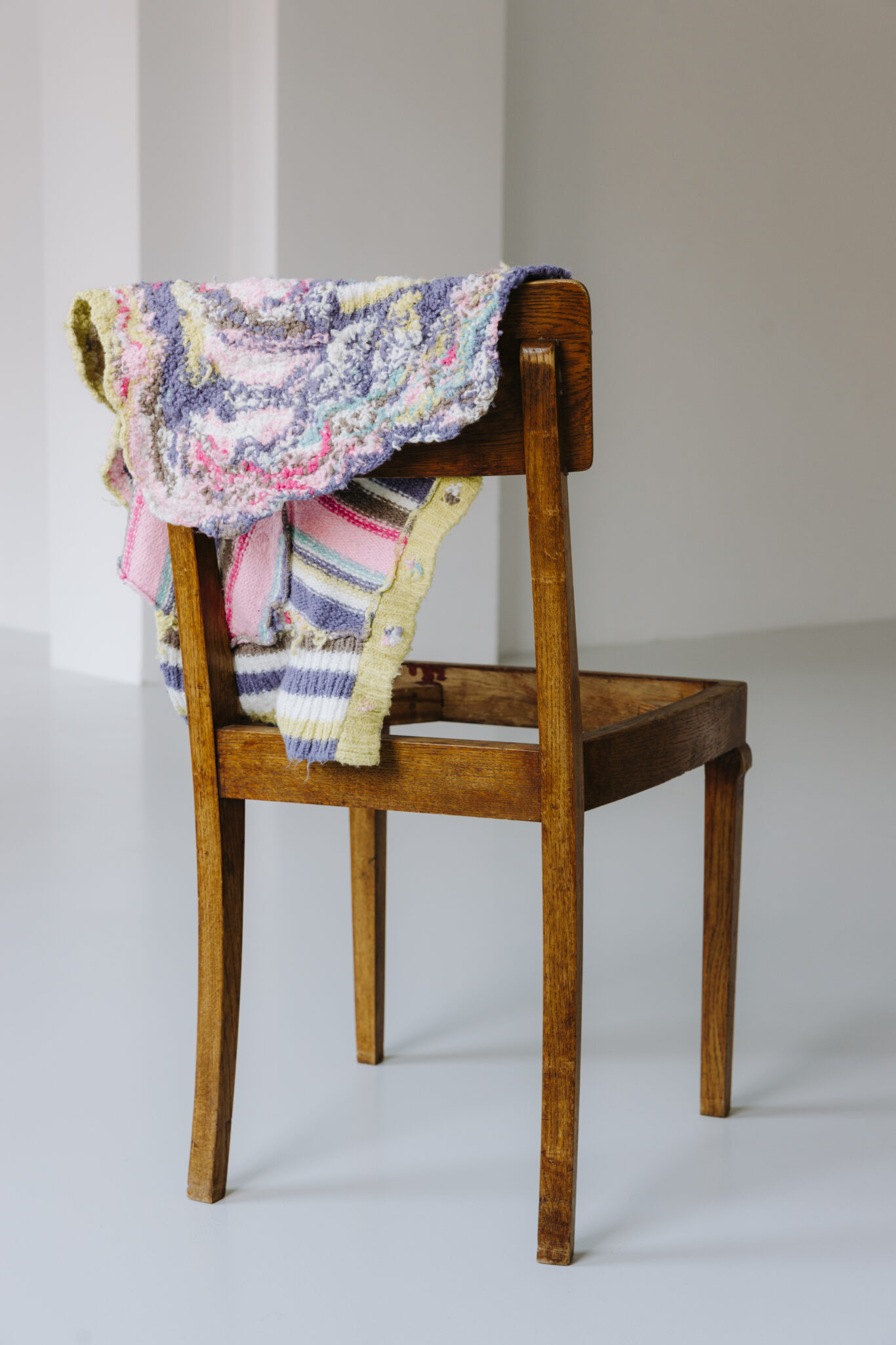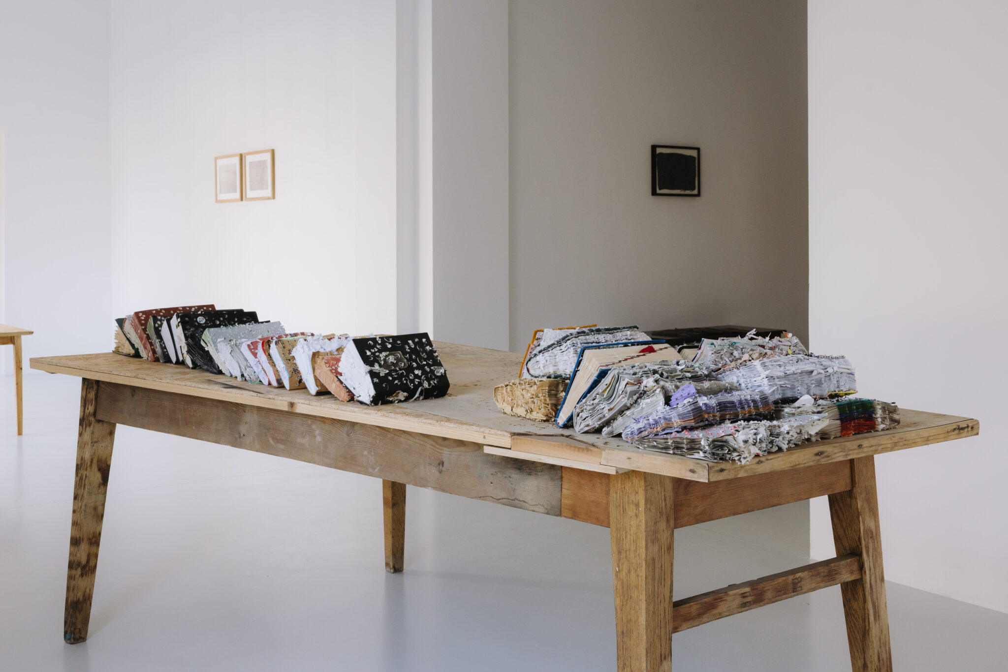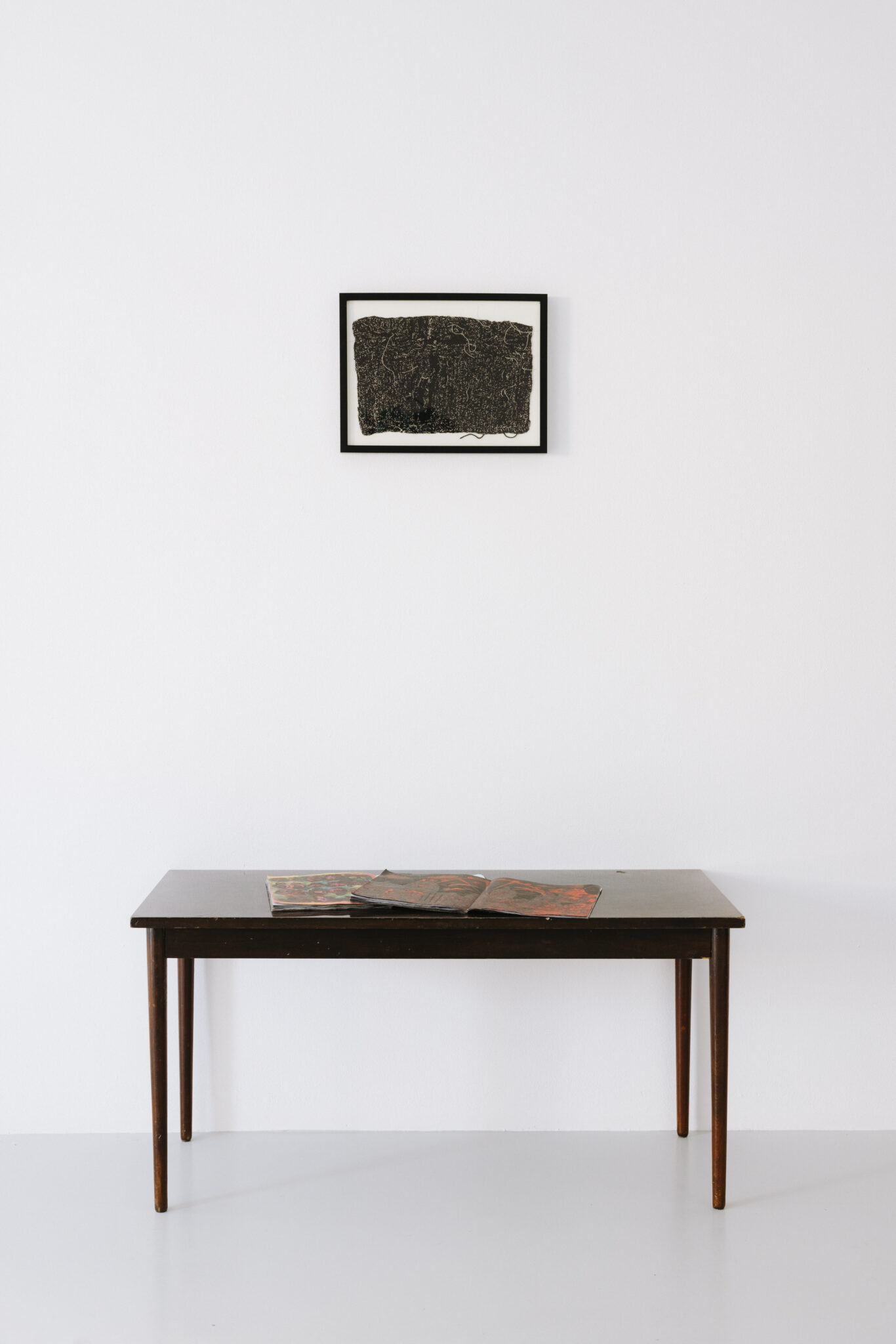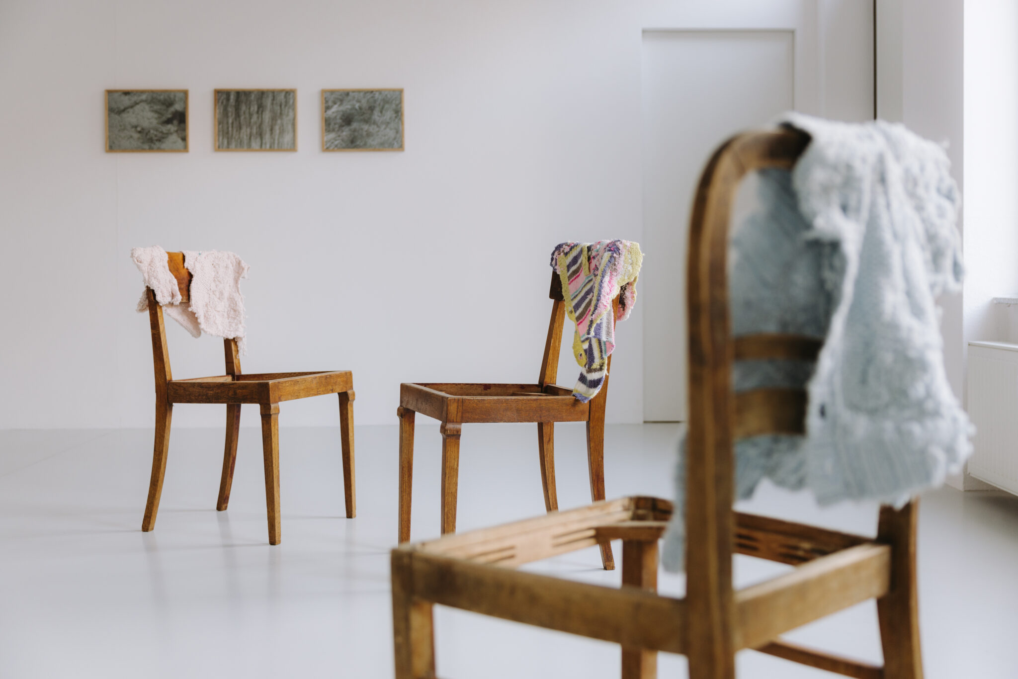 Artystka sytuuje swoje najnowsze prace gdzieś pomiędzy materią a gestem destrukcji. W tym „pomiędzy” odsłania przestrzeń, którą można odczytywać jako miejsce prowizoryczne, kruche, ale konieczne – schron. Pozornie zniszczone meble, książki, notesy, choć naruszone, wciąż istnieją; ich perforacja nie jest jedynie destrukcją czy dekoracja, lecz także gestem ukrywania. To, co miało być zapisane, zostaje zasłonięte, a znikanie staje się formą ochrony: treści nie są już dostępne, nie mogą zostać przechwycone, użyte, ocenione.