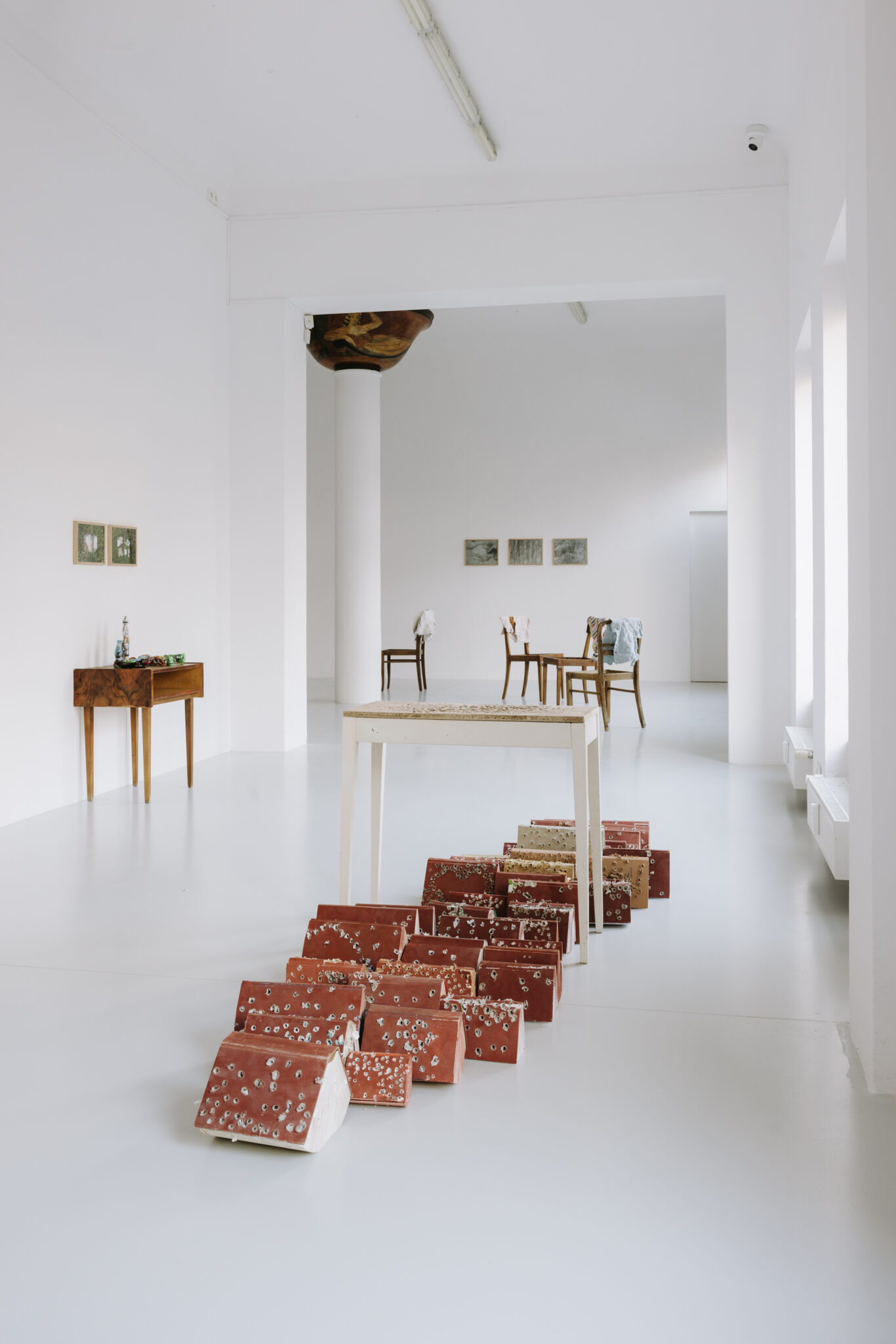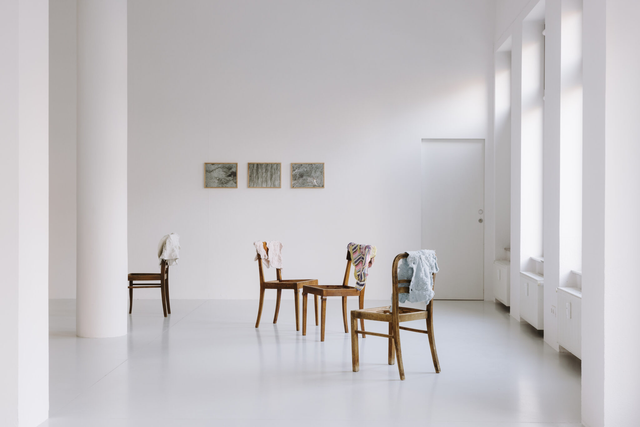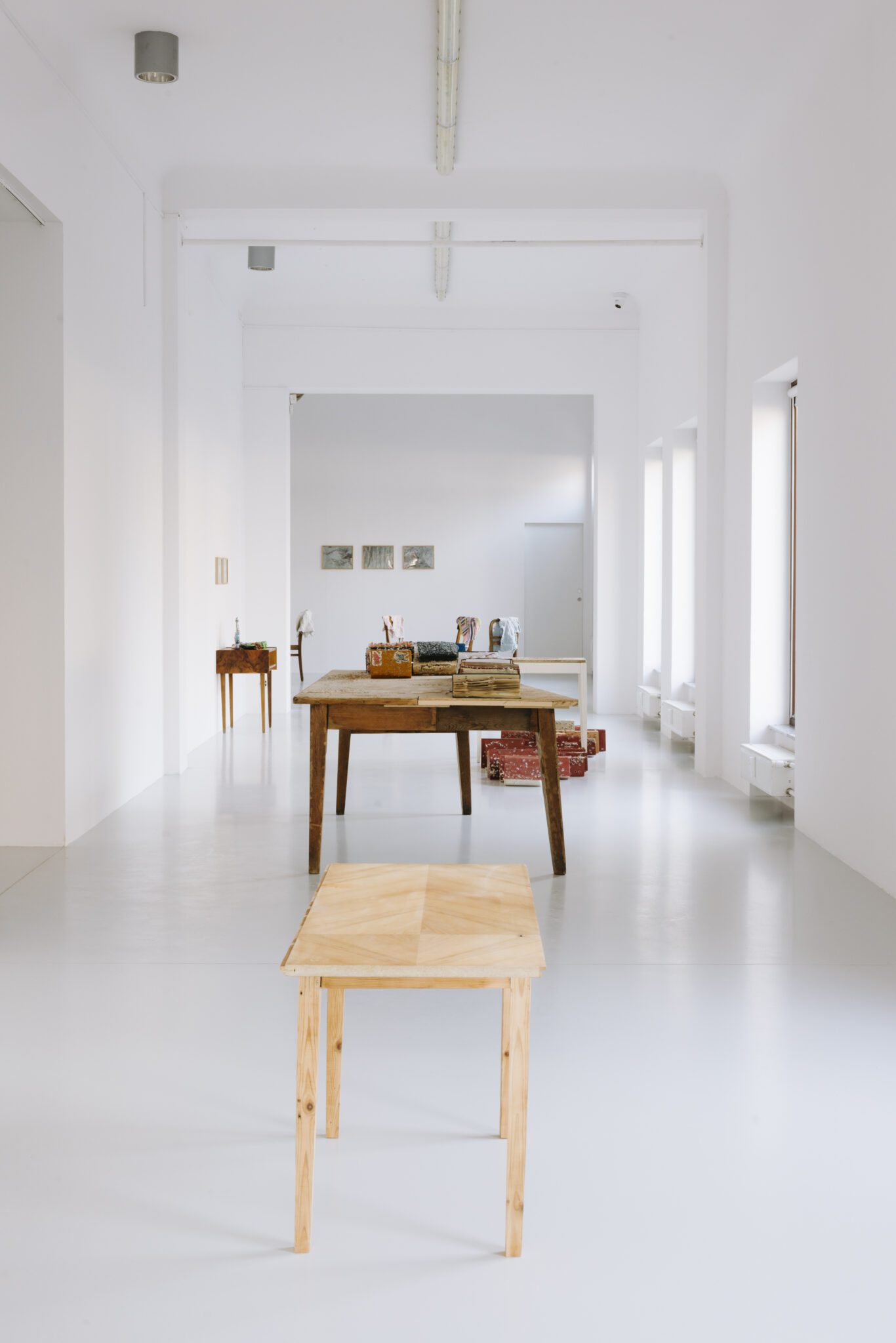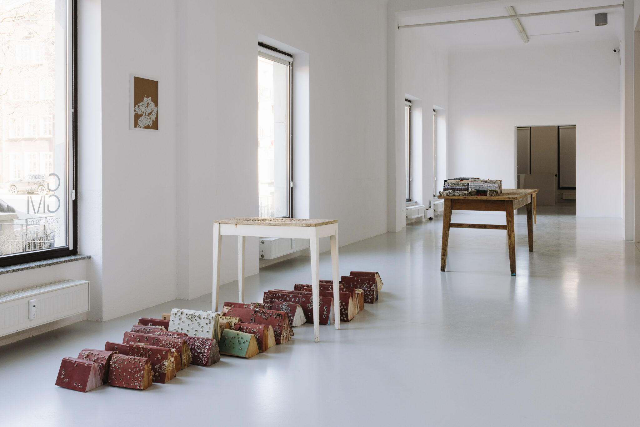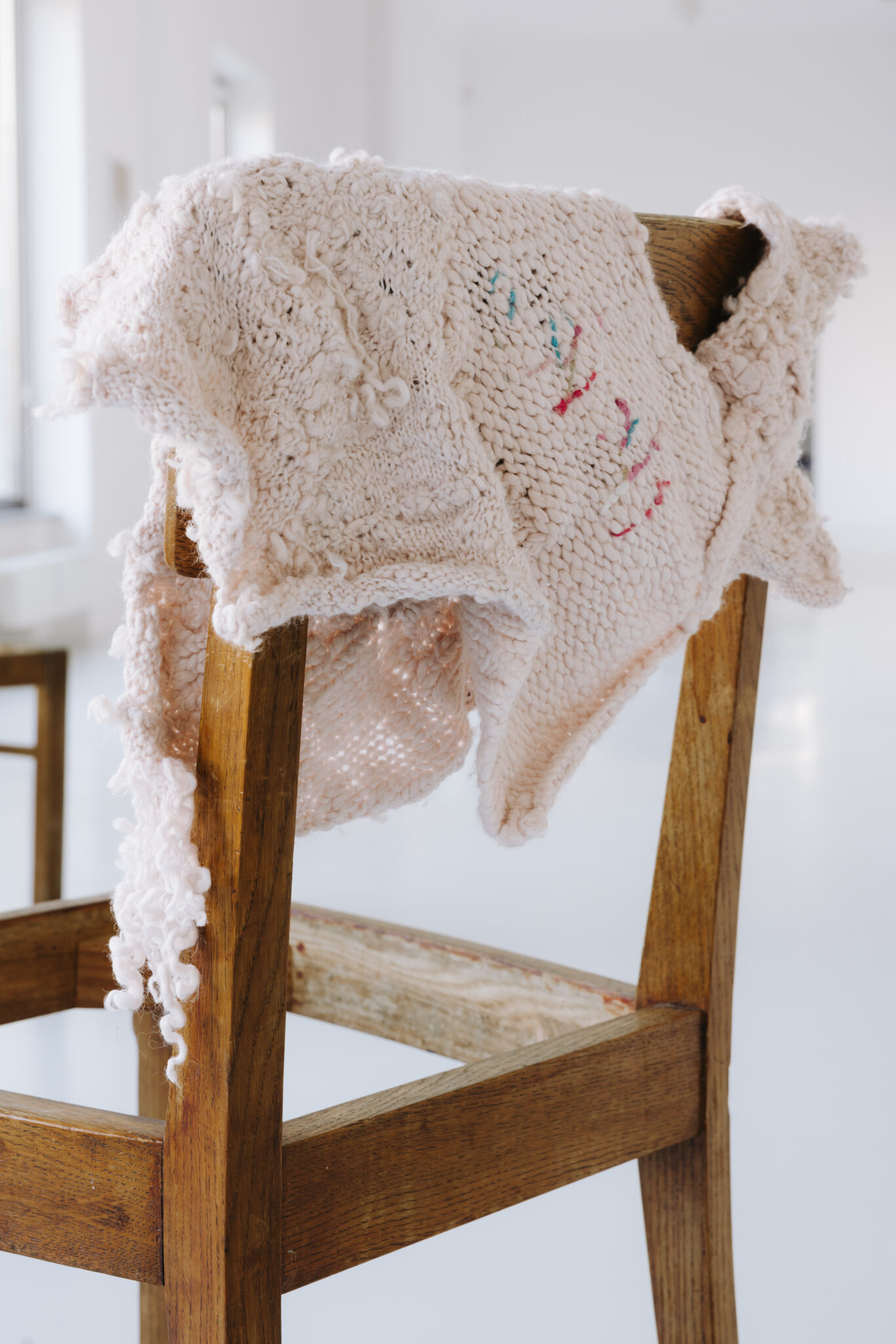 Artystka sytuuje swoje najnowsze prace gdzieś pomiędzy materią a gestem destrukcji. W tym „pomiędzy” odsłania przestrzeń, którą można odczytywać jako miejsce prowizoryczne, kruche, ale konieczne – schron. Pozornie zniszczone meble, książki, notesy, choć naruszone, wciąż istnieją; ich perforacja nie jest jedynie destrukcją czy dekoracja, lecz także gestem ukrywania. To, co miało być zapisane, zostaje zasłonięte, a znikanie staje się formą ochrony: treści nie są już dostępne, nie mogą zostać przechwycone, użyte, ocenione.