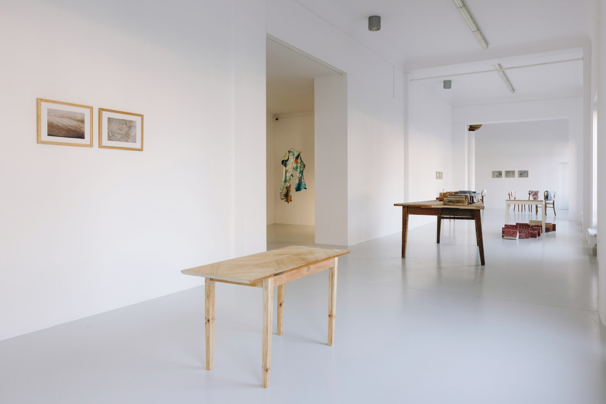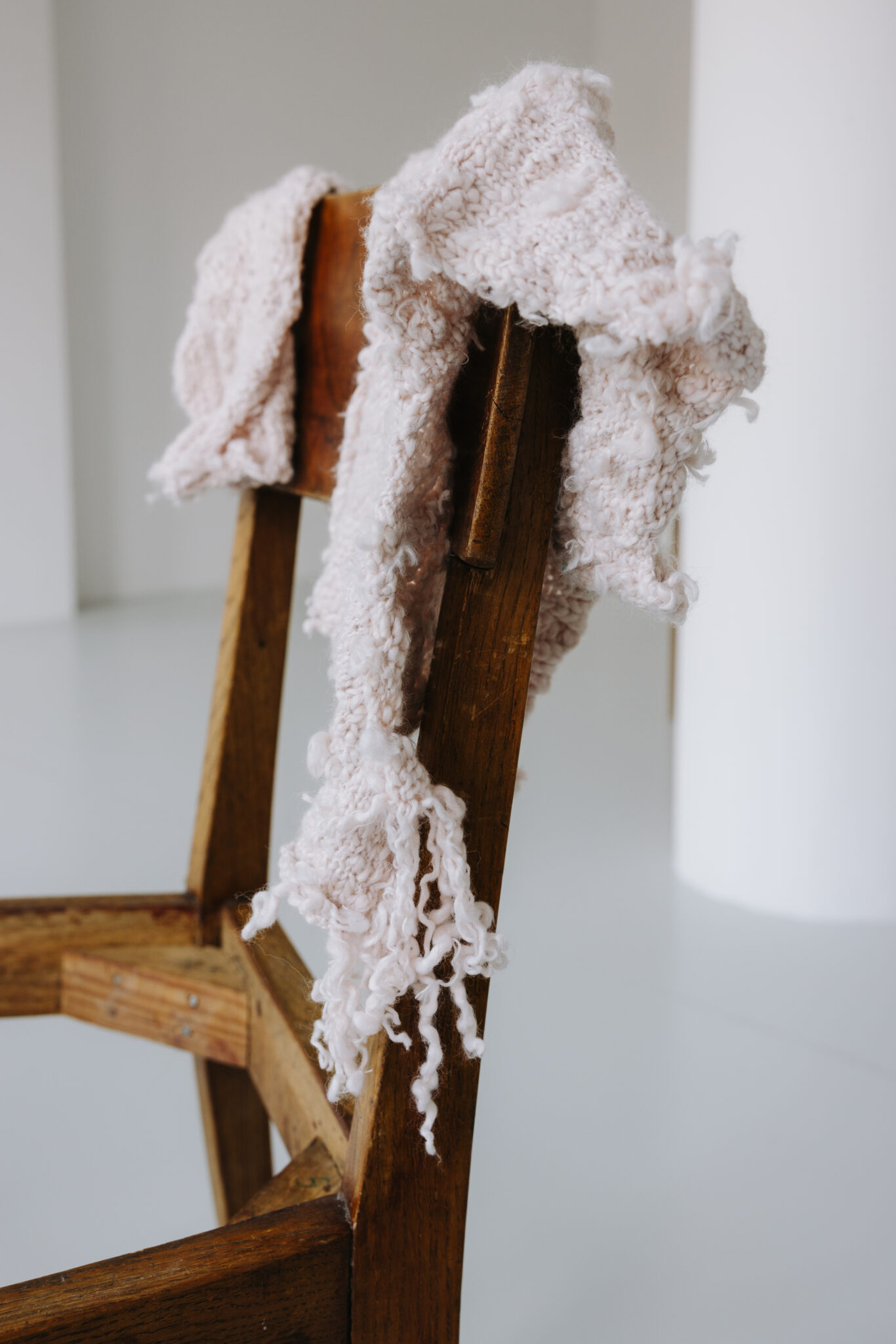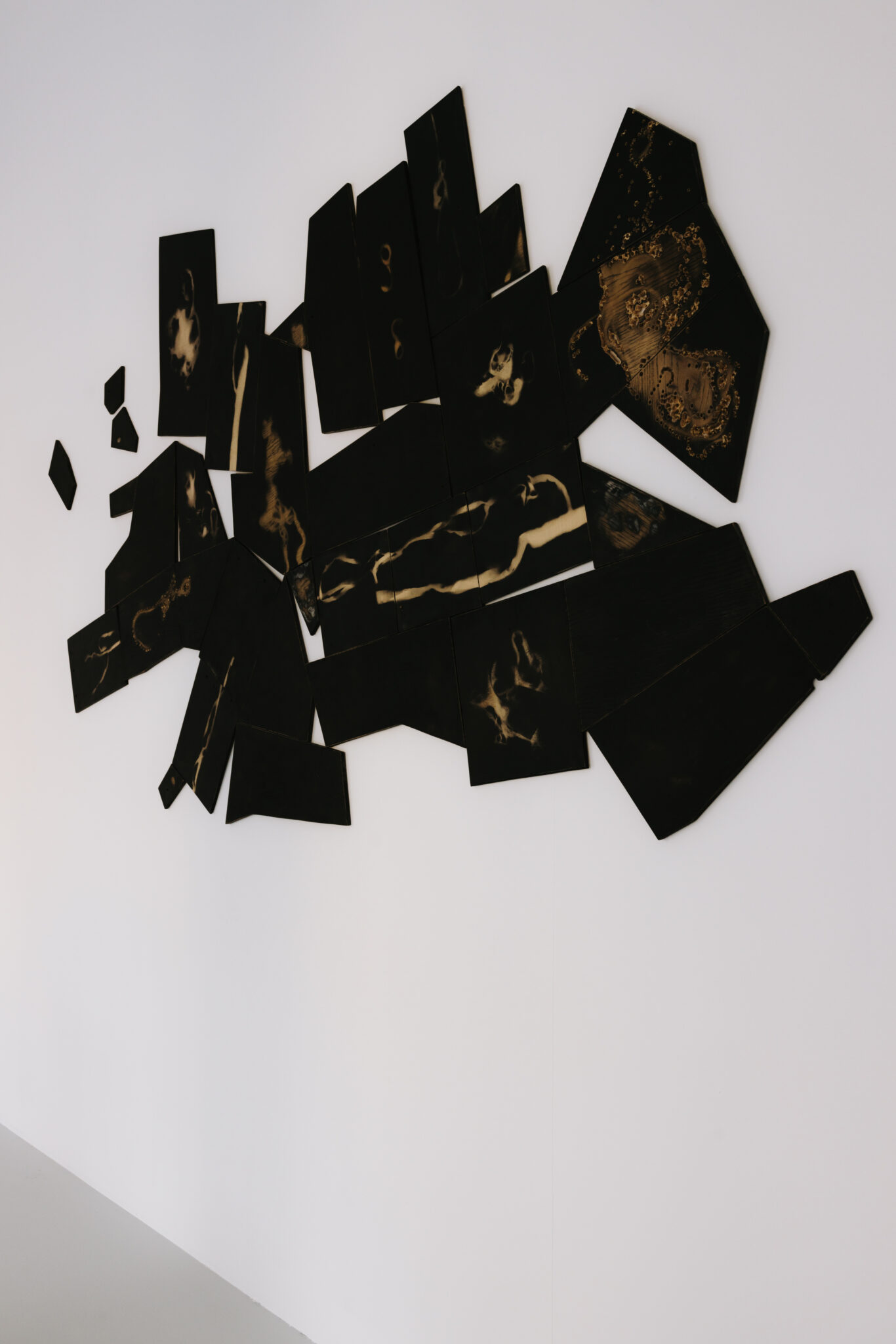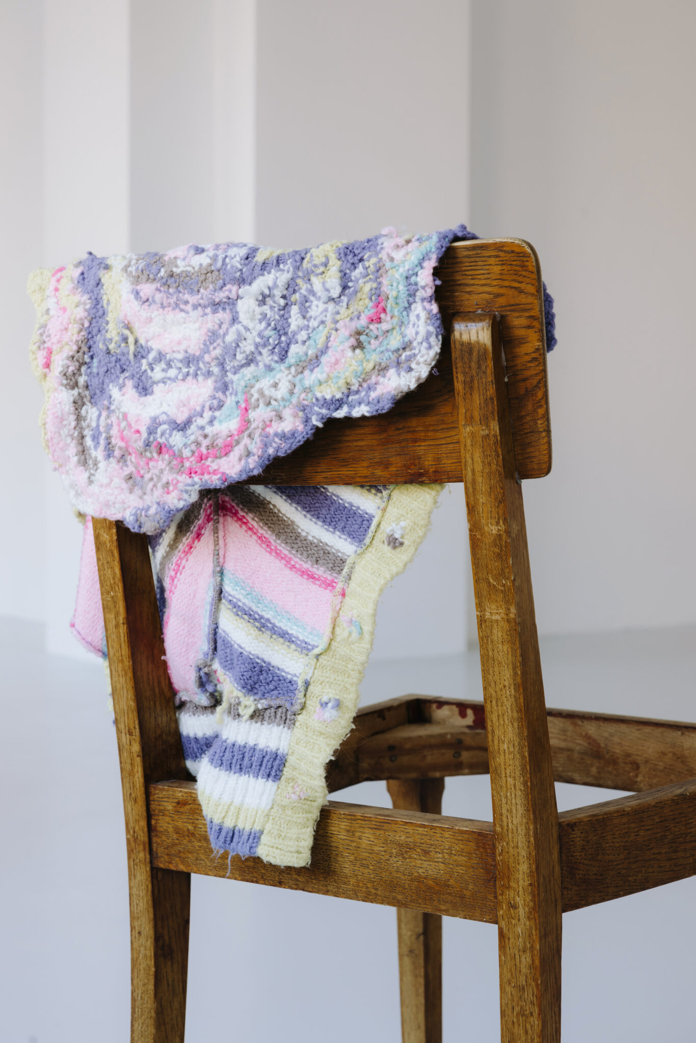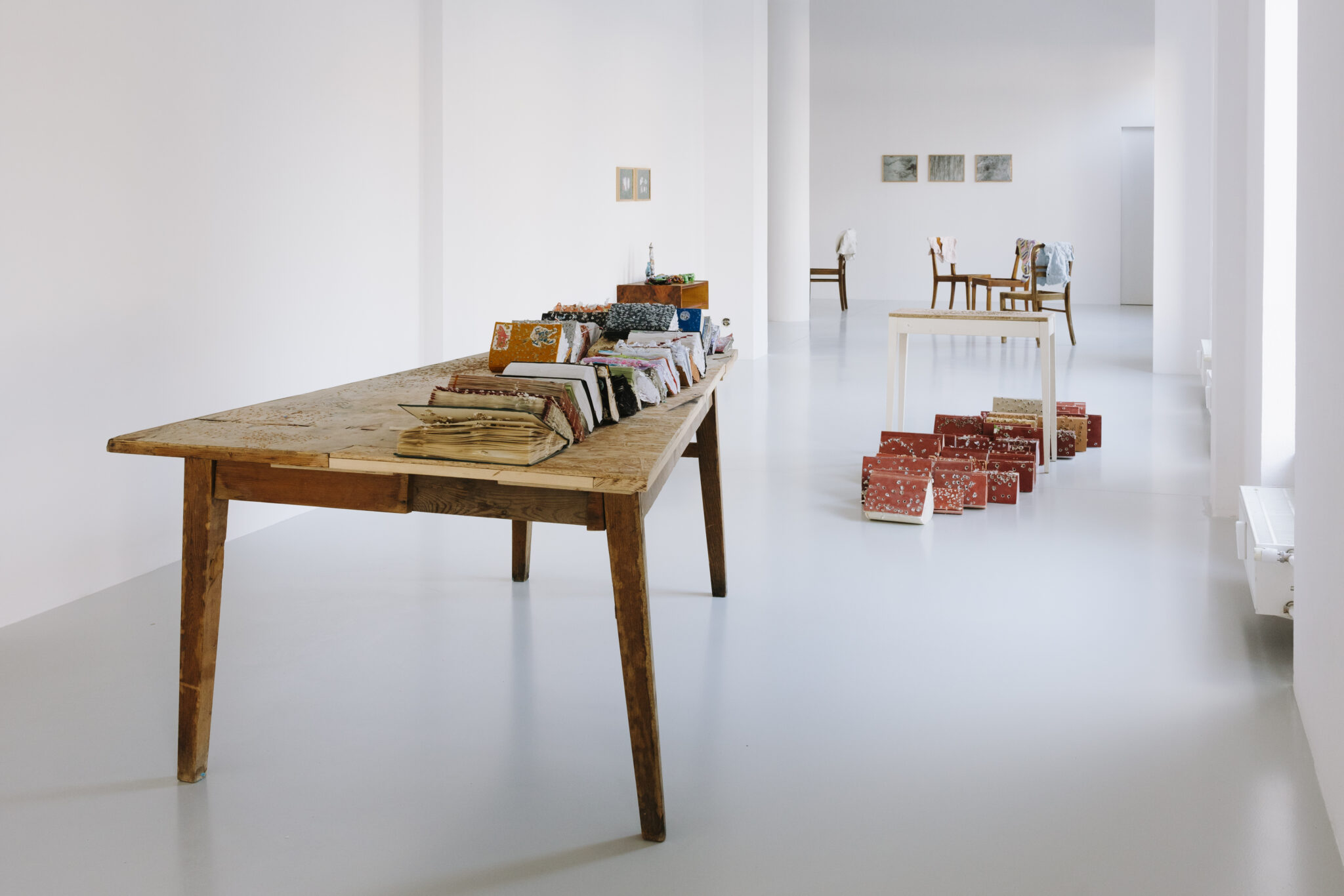 Artystka sytuuje swoje najnowsze prace gdzieś pomiędzy materią a gestem destrukcji. W tym „pomiędzy” odsłania przestrzeń, którą można odczytywać jako miejsce prowizoryczne, kruche, ale konieczne – schron. Pozornie zniszczone meble, książki, notesy, choć naruszone, wciąż istnieją; ich perforacja nie jest jedynie destrukcją czy dekoracja, lecz także gestem ukrywania. To, co miało być zapisane, zostaje zasłonięte, a znikanie staje się formą ochrony: treści nie są już dostępne, nie mogą zostać przechwycone, użyte, ocenione.