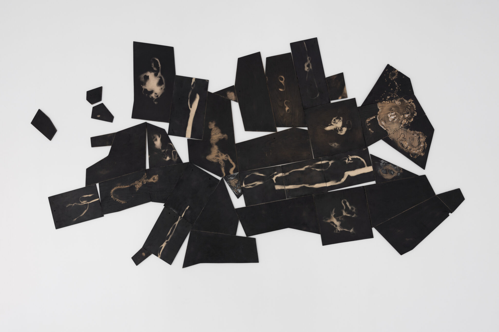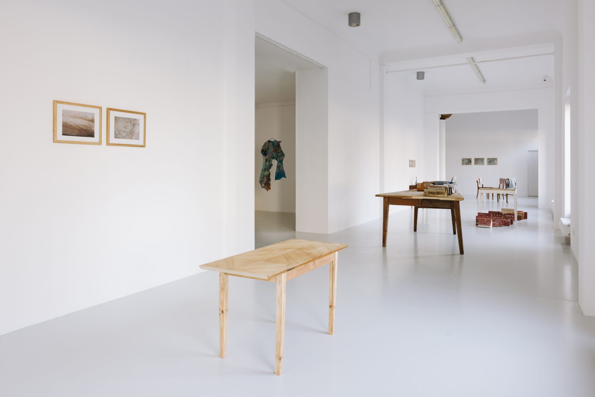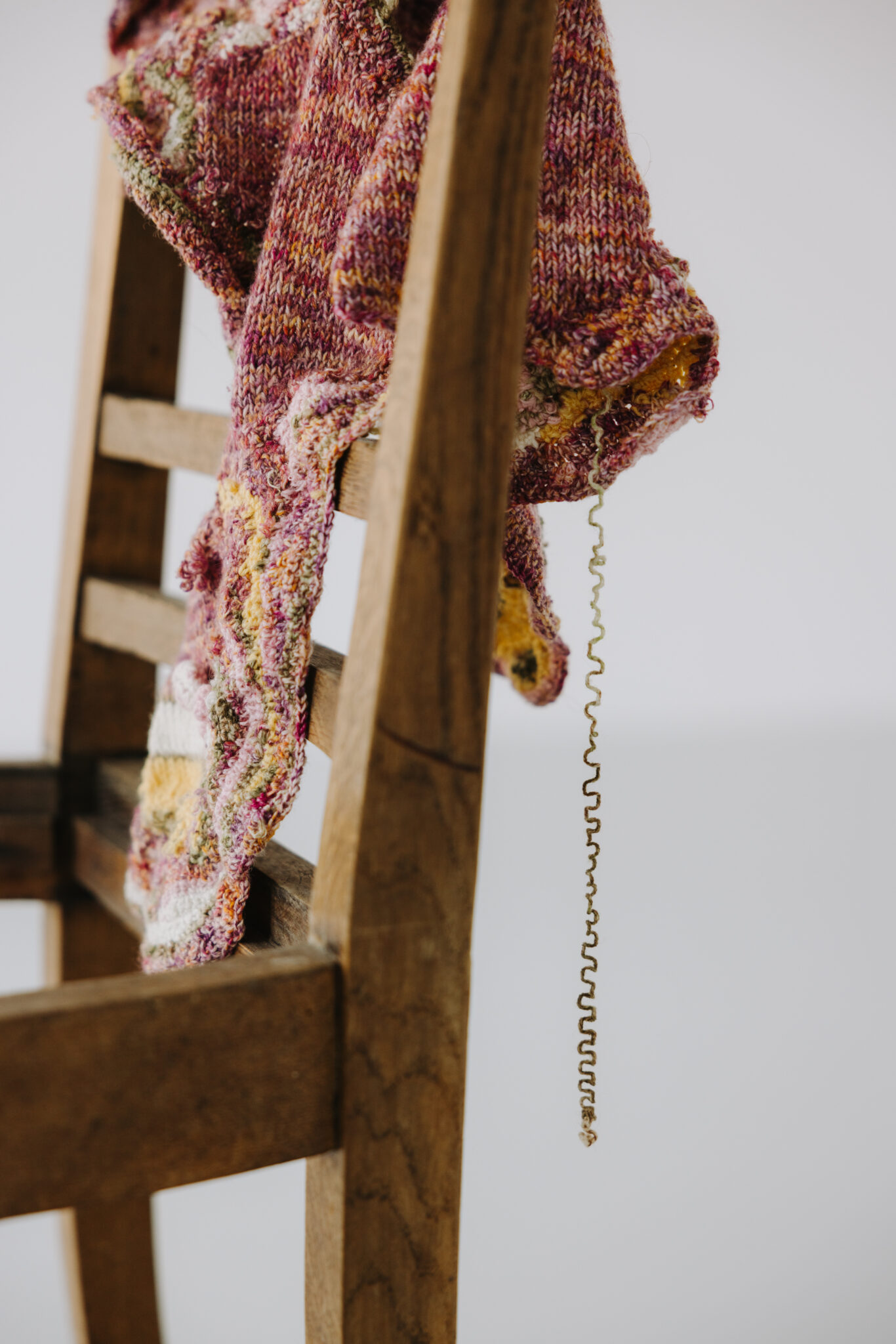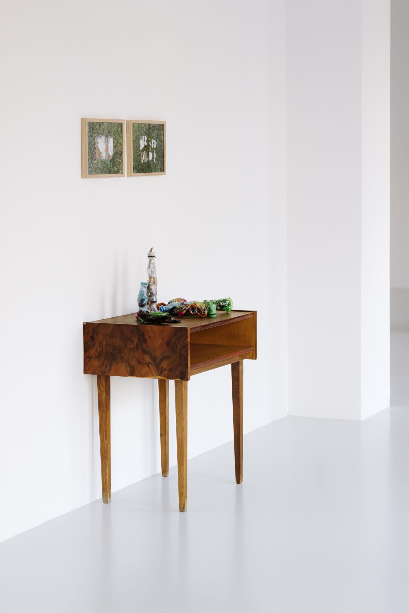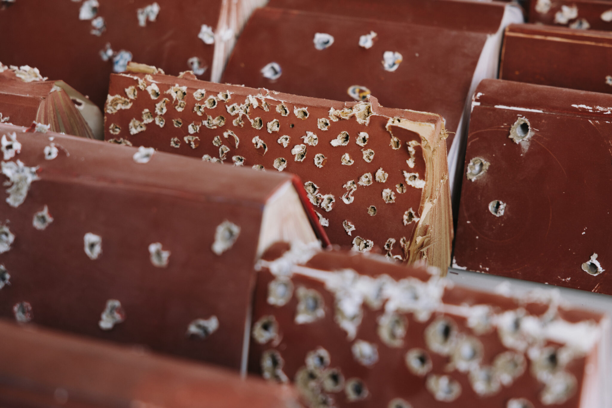 Artystka sytuuje swoje najnowsze prace gdzieś pomiędzy materią a gestem destrukcji. W tym „pomiędzy” odsłania przestrzeń, którą można odczytywać jako miejsce prowizoryczne, kruche, ale konieczne – schron. Pozornie zniszczone meble, książki, notesy, choć naruszone, wciąż istnieją; ich perforacja nie jest jedynie destrukcją czy dekoracja, lecz także gestem ukrywania. To, co miało być zapisane, zostaje zasłonięte, a znikanie staje się formą ochrony: treści nie są już dostępne, nie mogą zostać przechwycone, użyte, ocenione.