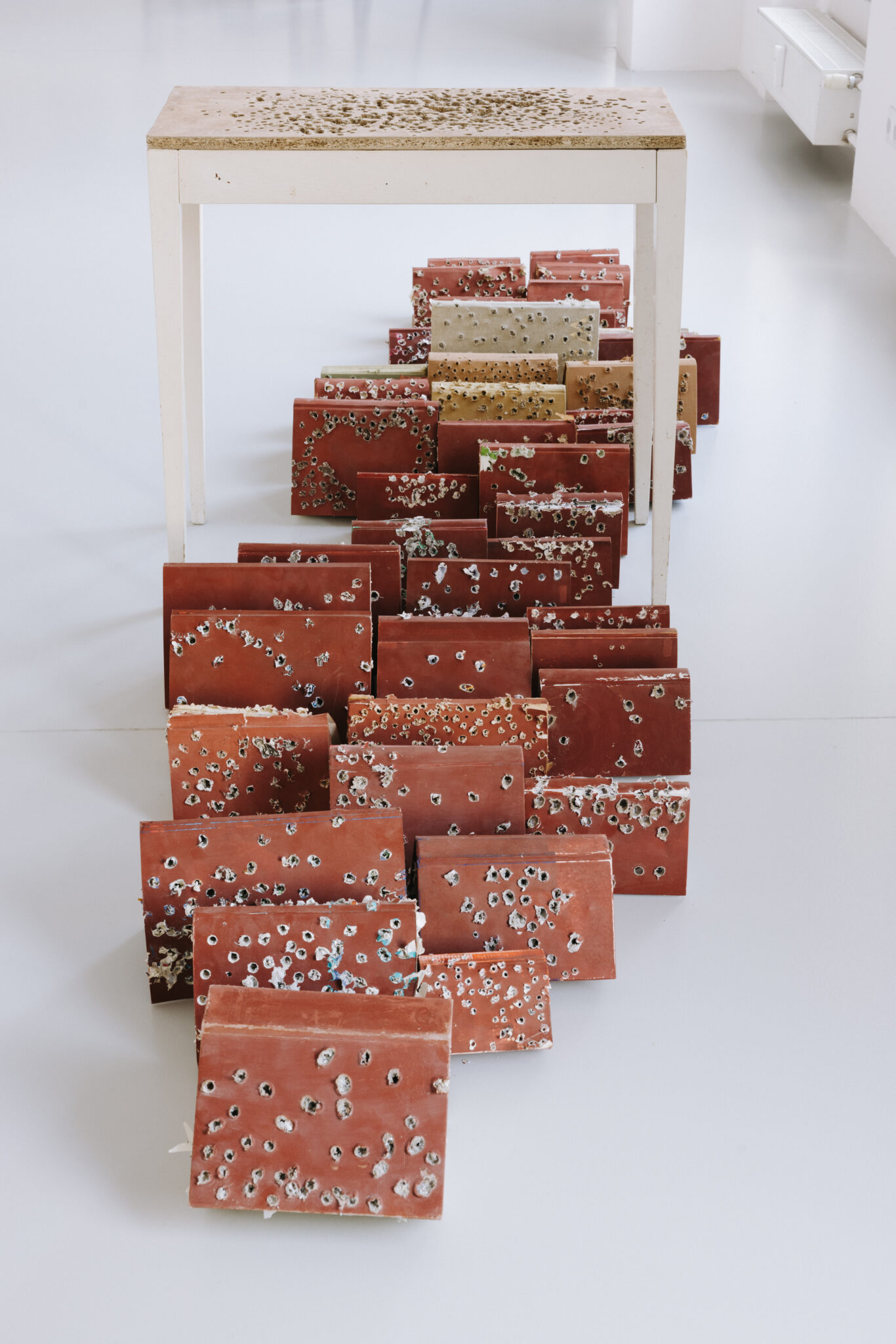 Jak sama artystka definiuje: ”(…) w ten sposób destrukcja staje się rodzajem domu-schronu – miejsca, gdzie pamięć przybiera formę materii pozbawionej sensu, a przez to bezpiecznej. Znikanie nie jest tu stratą, lecz strategią przetrwania. Wyrwy po wiertle przypominają o nieobecności, ale jednocześnie budują nową obecność: strukturę, w której to, co ukryte, nadal oddycha pod powierzchnią.